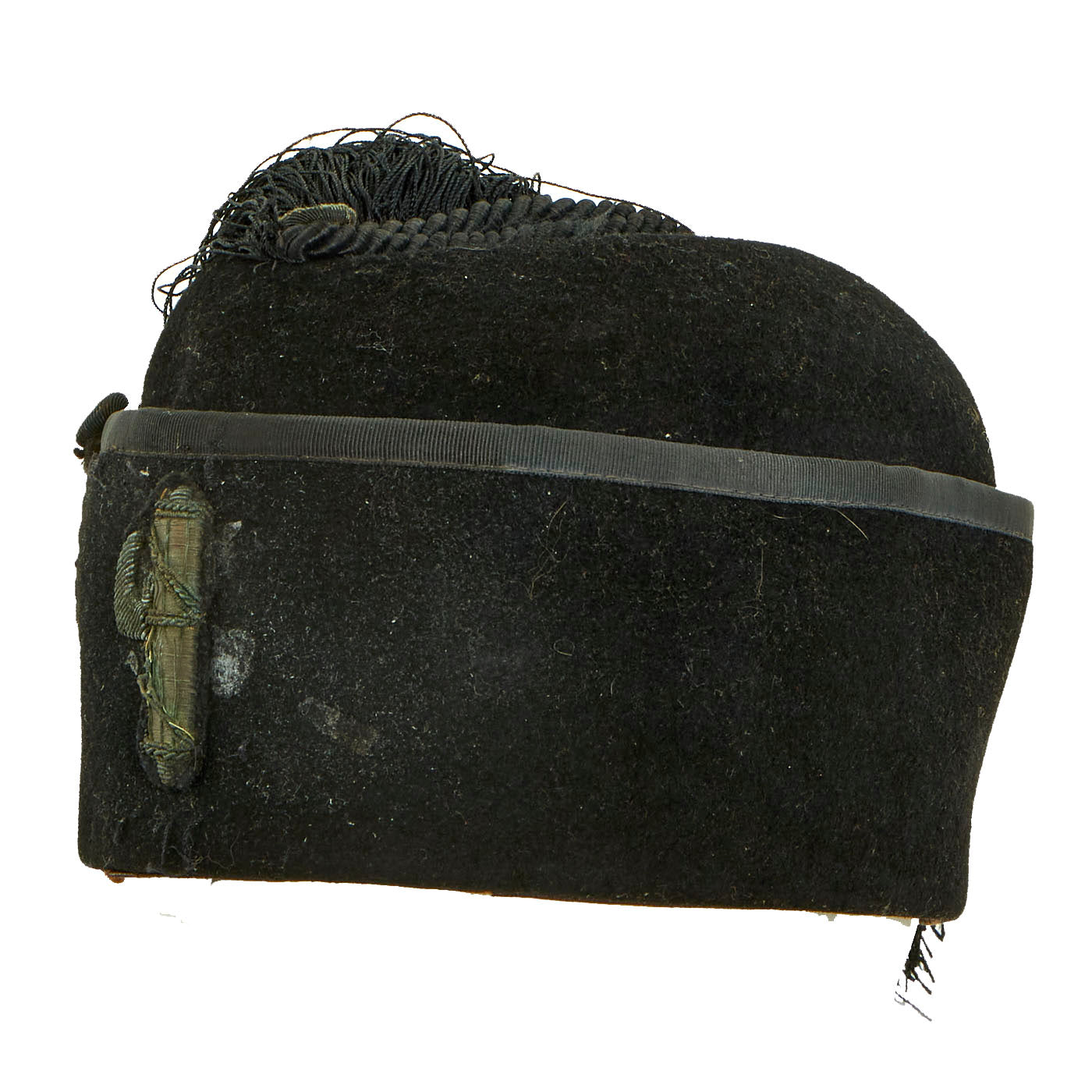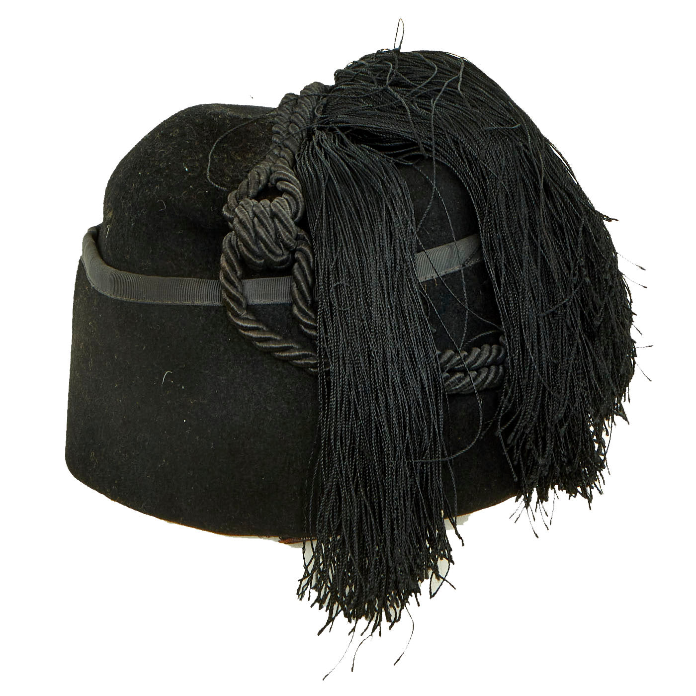 Original Item: Only One Available. This excellent condition fez features a gold bullion embroidered fascist wheat symbol to front which has oxidized to a lovely greenish color. The top of the cap, on the silk type lining, features the lovely manufacturer’s “ROMA” stamp which is the Capitoline Wolf.