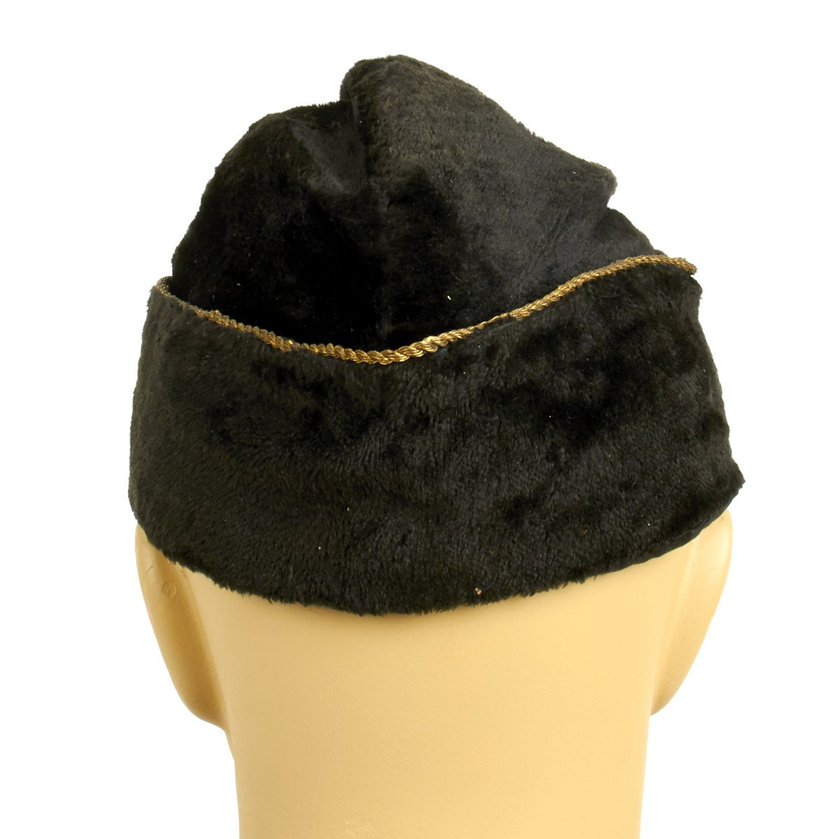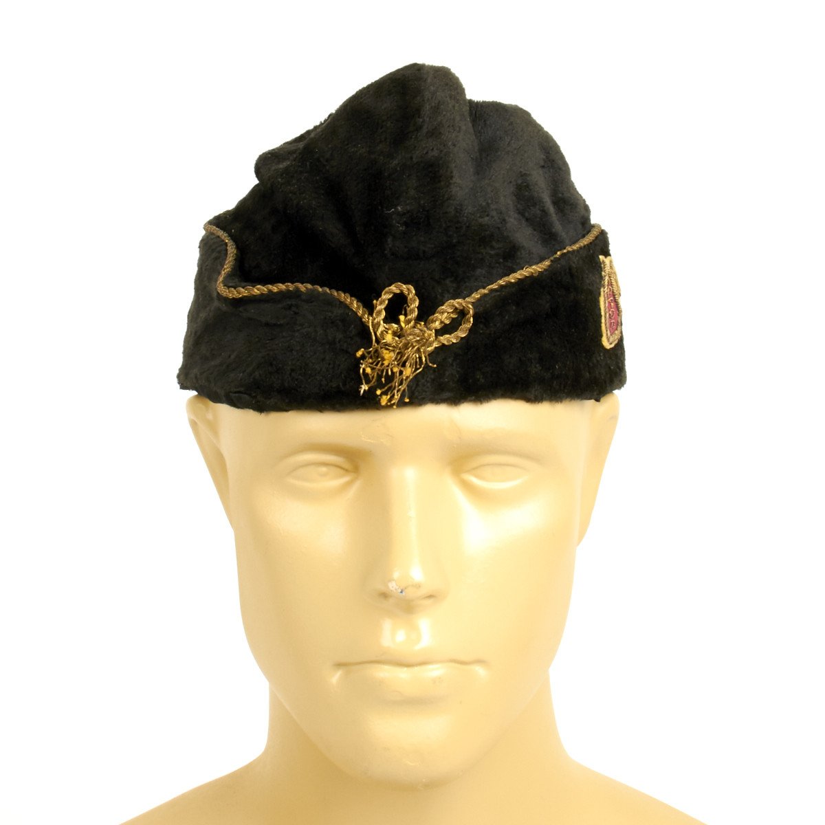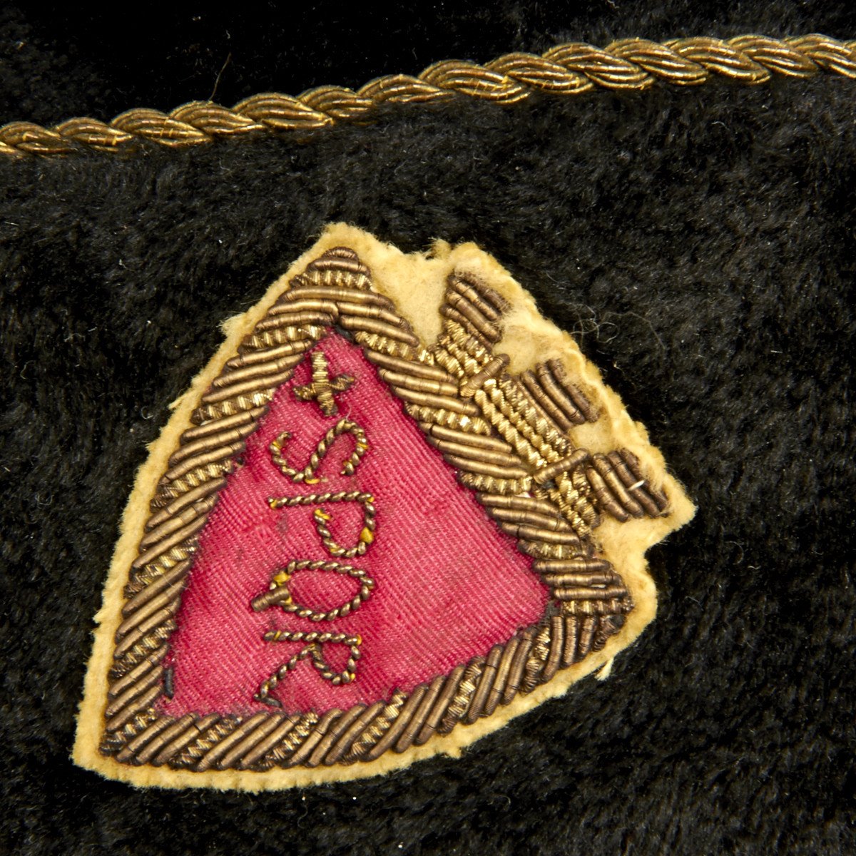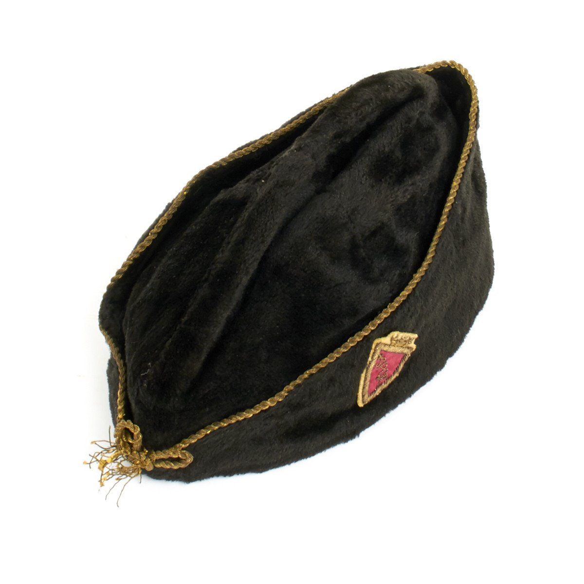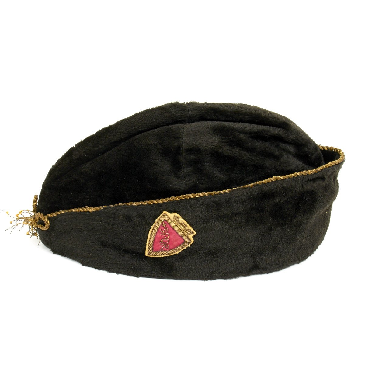 Original Item: Only One Available. This good black felt with silk-like lining fez features gold bullion embroidered trim and front knot with a rare SPQR gold bullion embroidered red shield on the left side of the cap. Size is approximately 55cm.