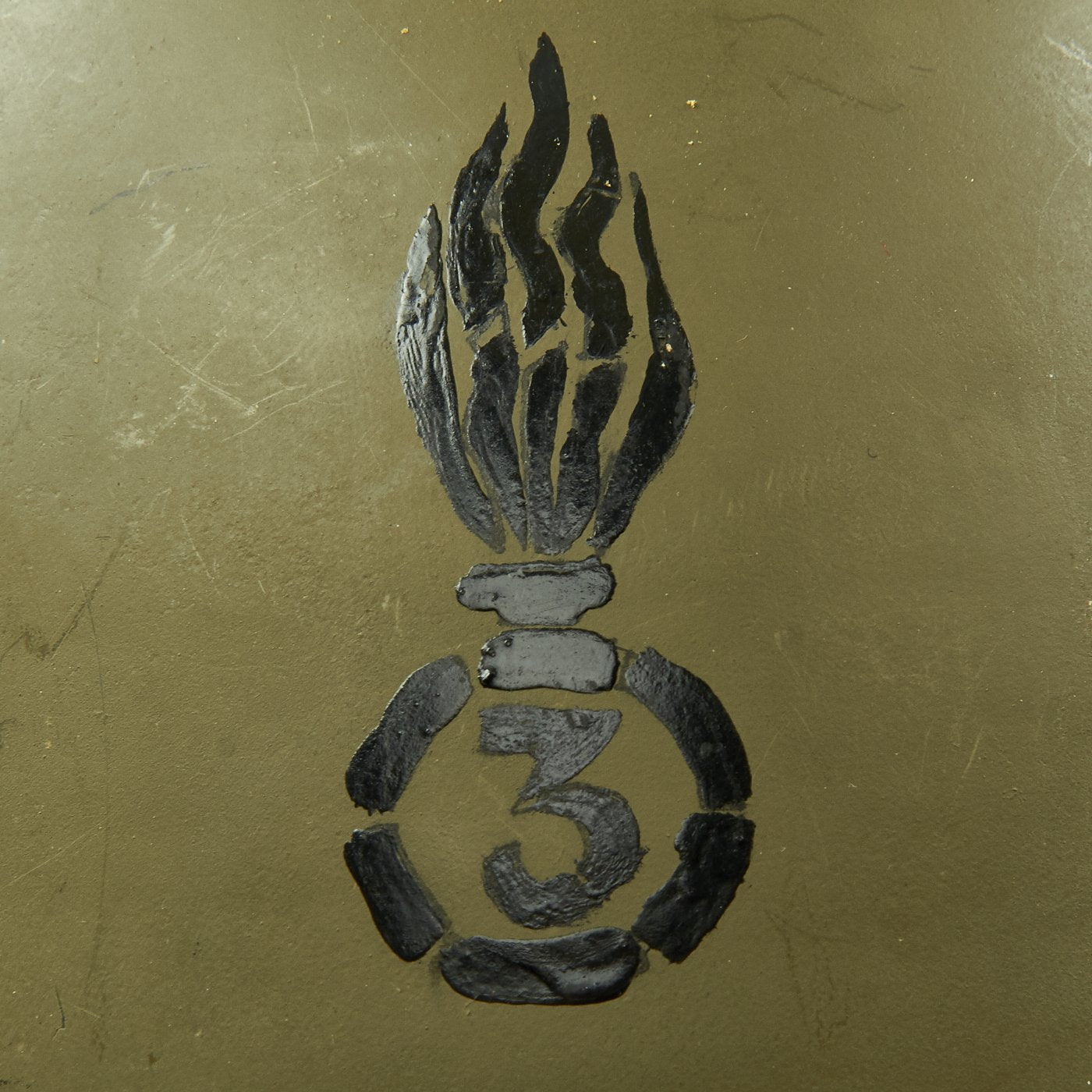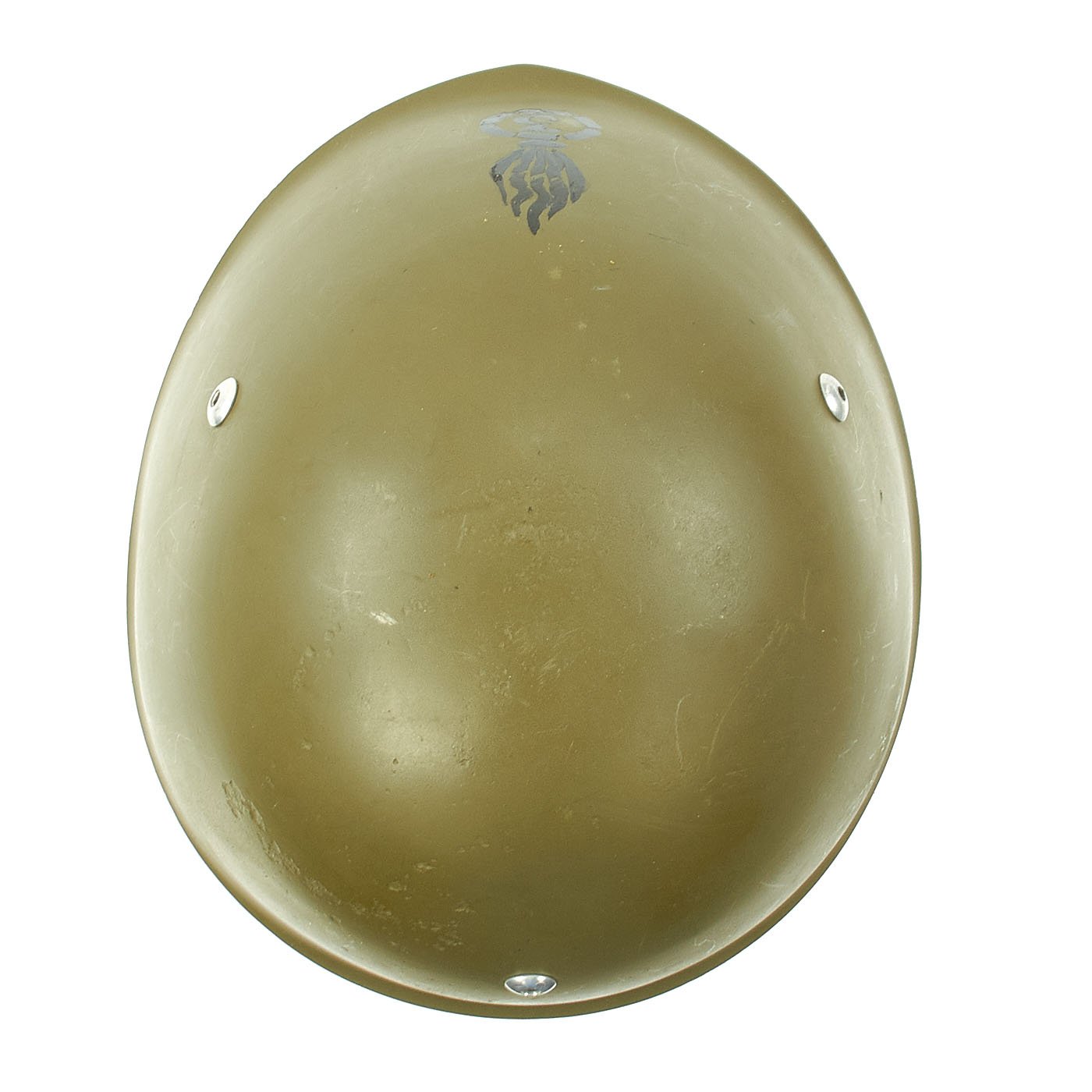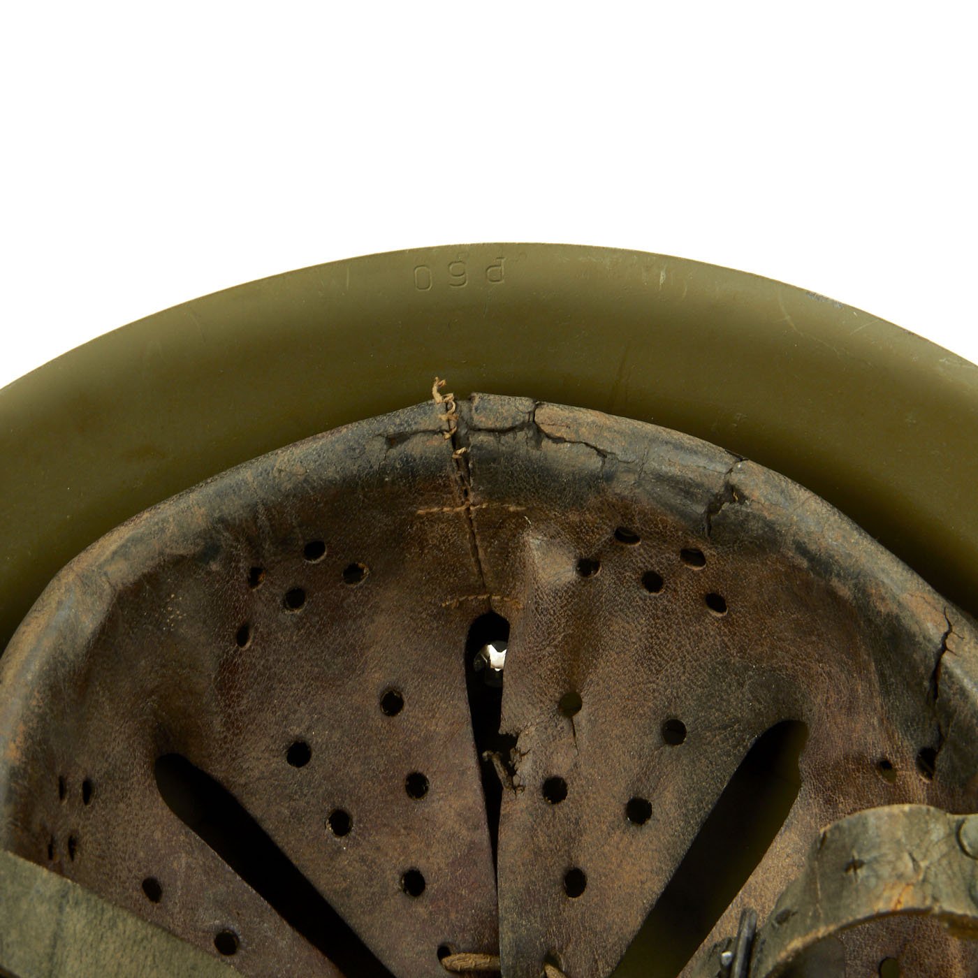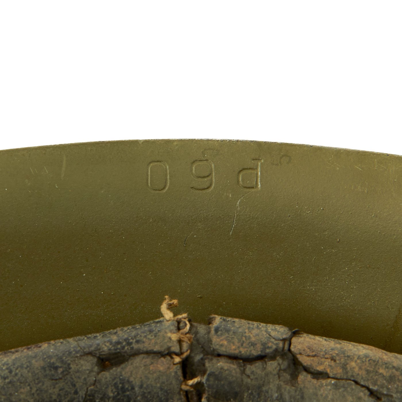 The shell is really in choice condition, with most of the paint intact, however it has definitely been repainted at some point. Removed rust pitting can be seen under the paint. There are not any major dents that we can see. The rear of the helmet near the edge is stamped with production code P60, which we have unfortunately not been able to identify.