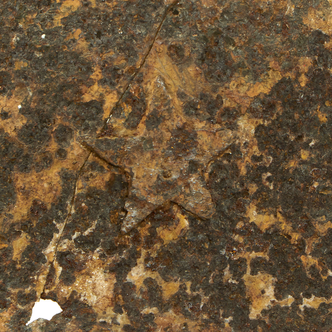 The shell still has the front five pointed star, but shows total paint loss and extensive oxidation on the interior and exterior. There is cracking and chunks missing along the edge, along with some scattered larger cracks that extend up several inches. The other two liner attachment points can still be seen, but they are completely corroded over.