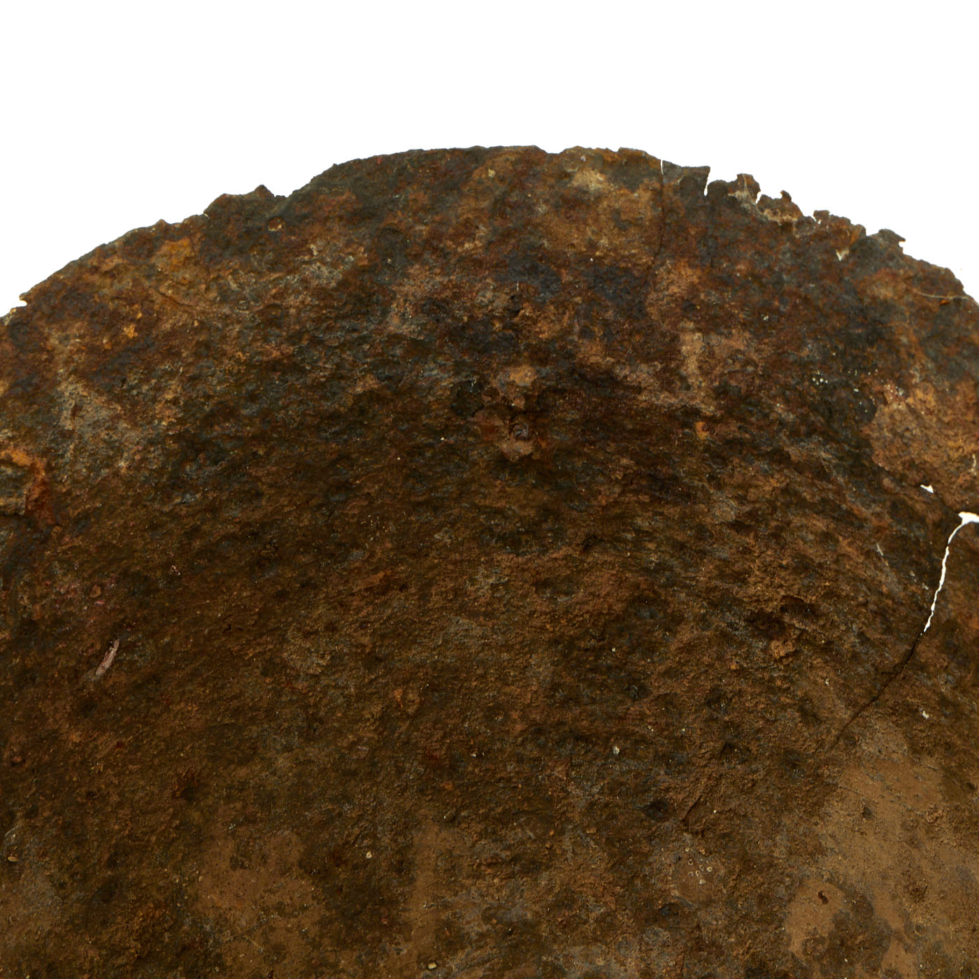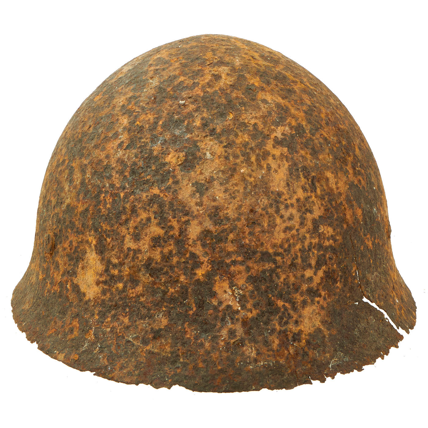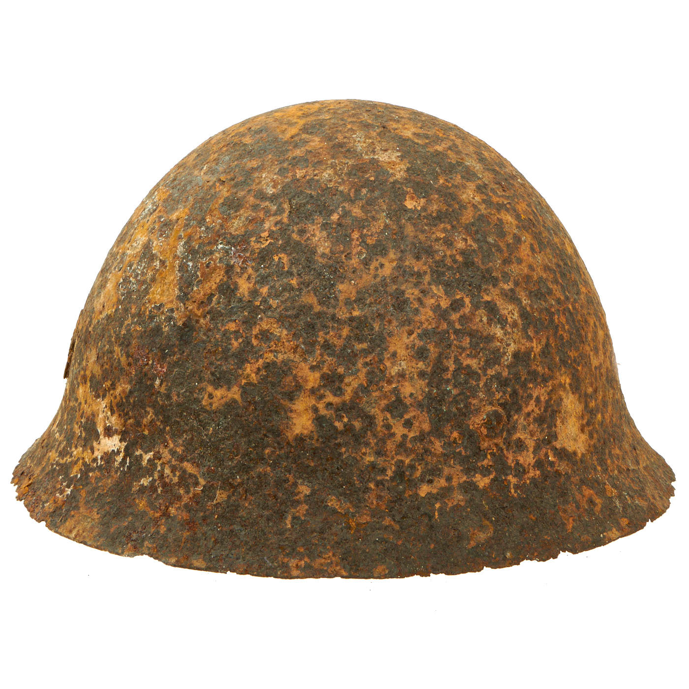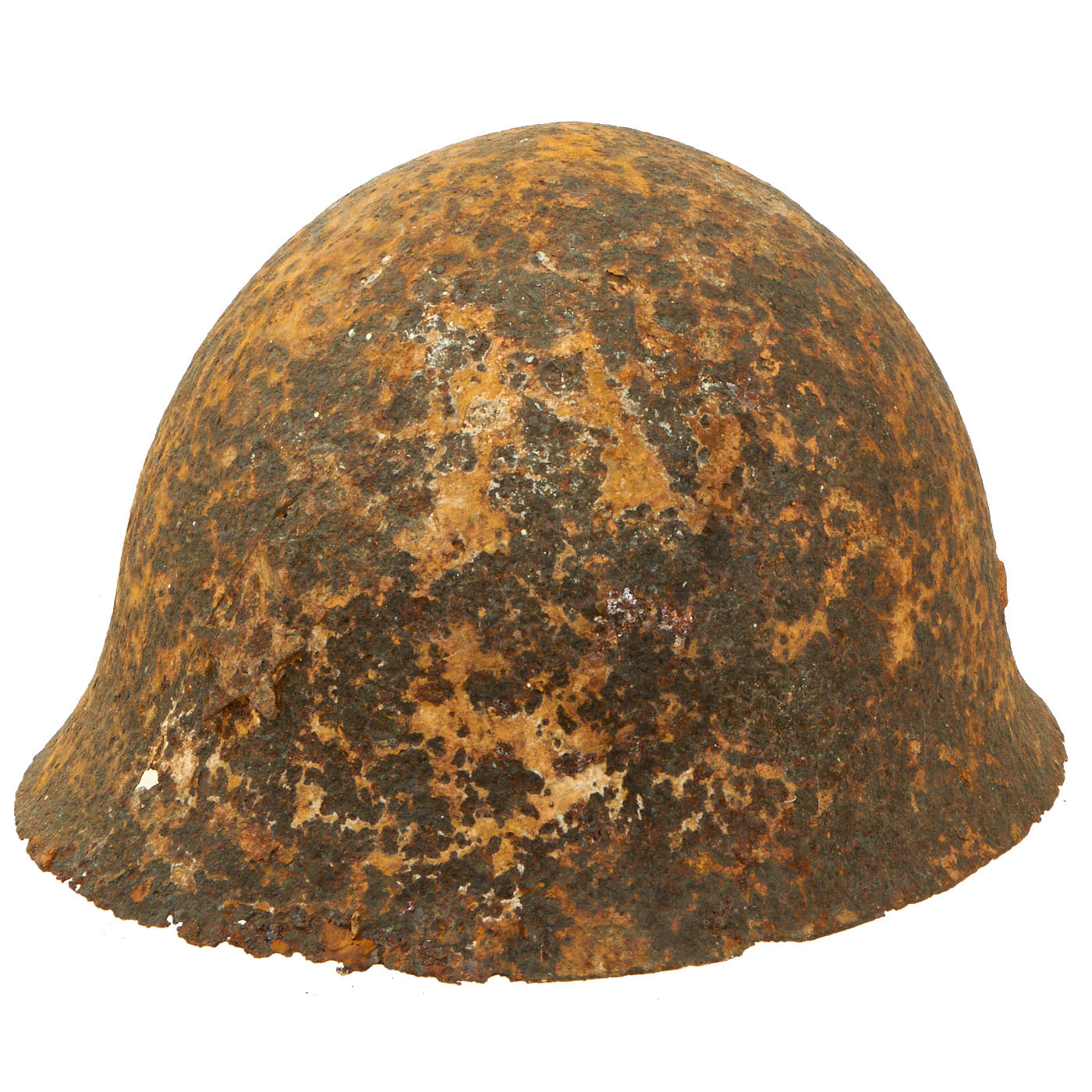 What we have here is a very nice "Battlefield Dug Up" example of the Japanese WWII Type 92 Tetsubo (鉄帽 - "steel cap"), first introduced in 1932, Japanese National Era Calender year 2592. These were also colloquially called the tetsukabuto ( 鉄 冑 "steel helmet") by troops. This was purchased as part of a large military collection, and the information we received with the helmet was that it was dug up on the Island, probably during the era of U.S. occupation, which ended in 1968. Unfortunately we do not have any further information regarding this helmet shell's provenance.