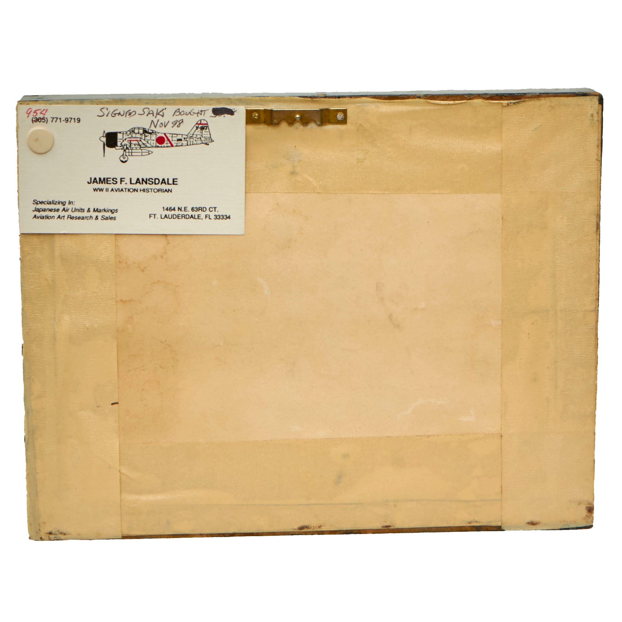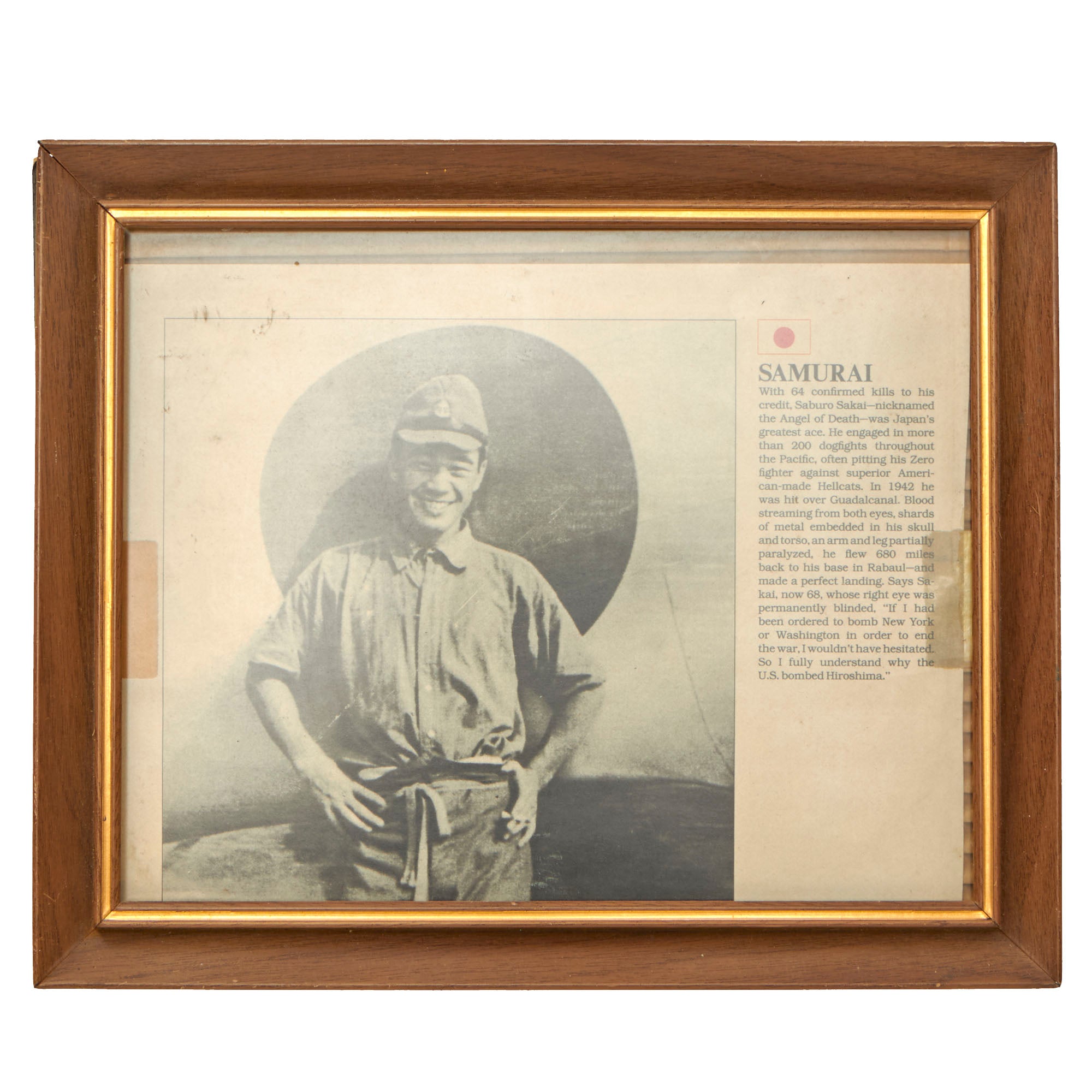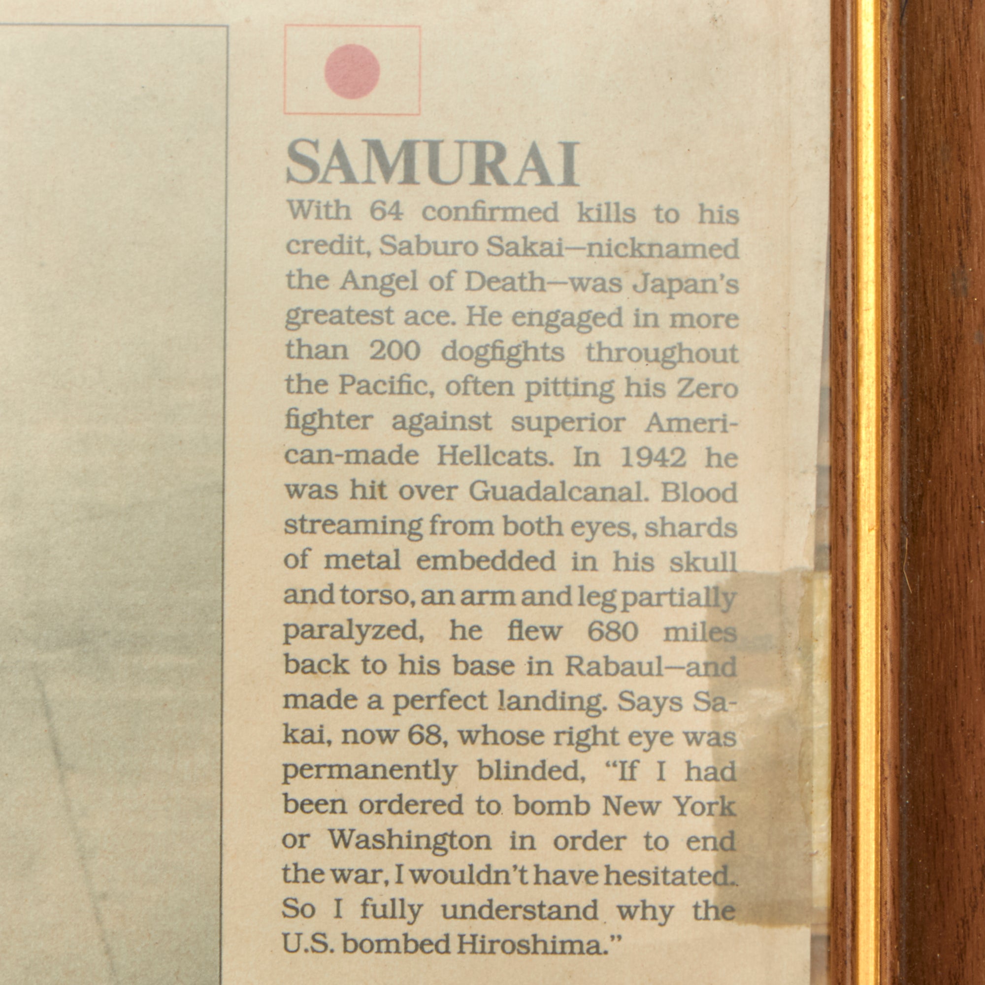 The group photo of Sakai and his unit is signed by Sakai in the top left, both in English and Japanese. On the back of this frame is the business card of a previous owner, James F. Lansdale, a WWII Aviation Historian, which provides some provenance to the group. The second frame is of a small article about Sakai which credits him with 64 confirmed kills and the nickname “The Angel of Death”. Both frames are in fine shape ready to hang on the wall.