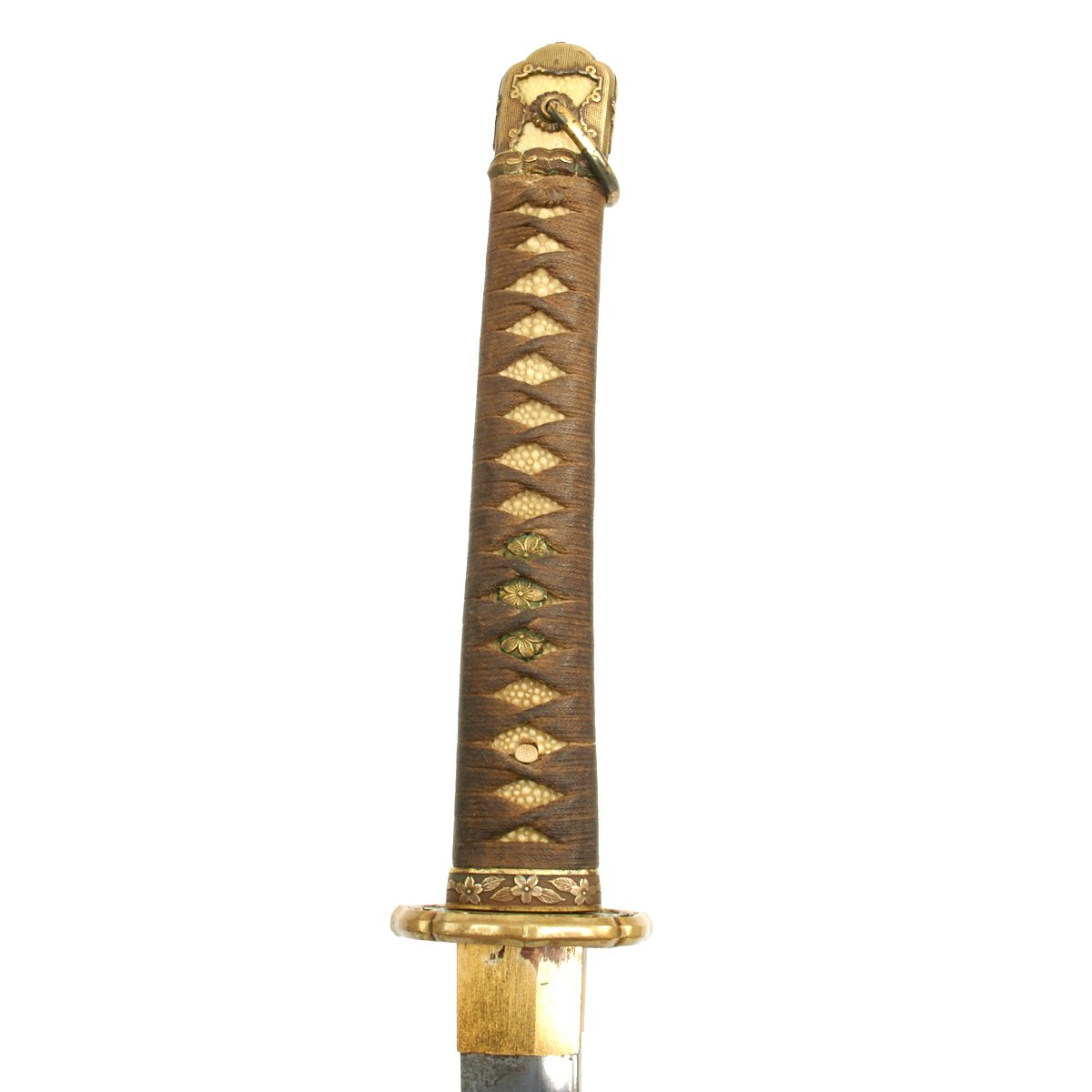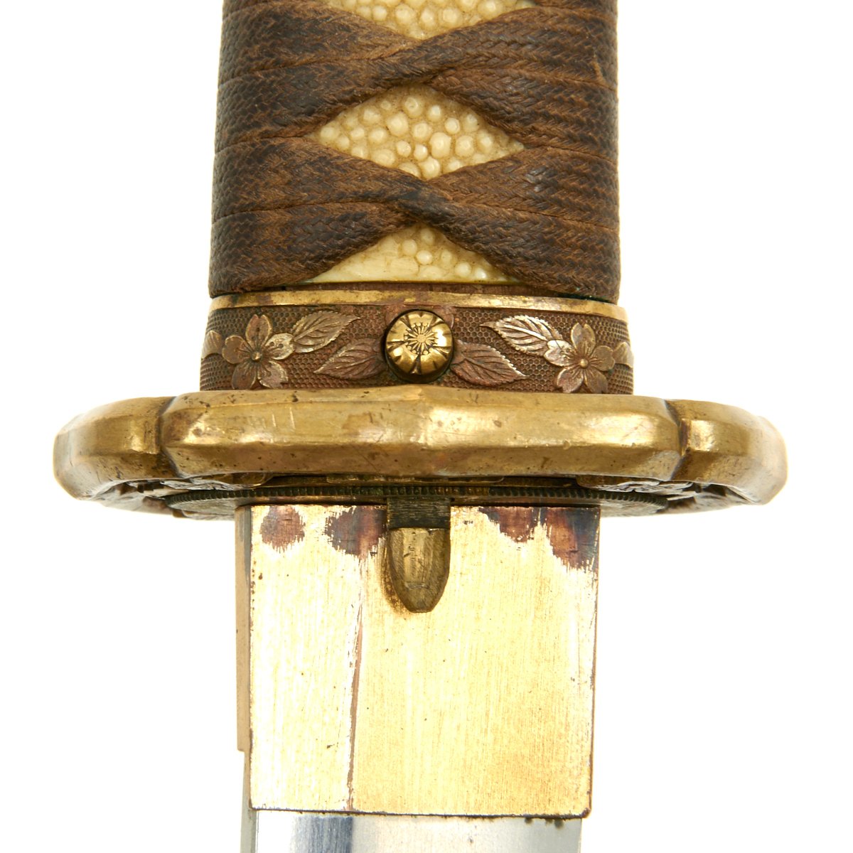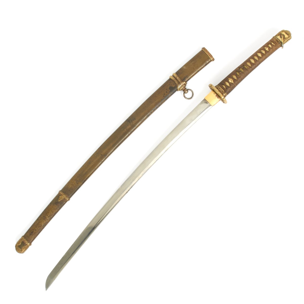 Original Item: Only One Available. Purchased directly from a collector, this is a very nice wartime production medium grade Japanese officer Katana (Gunto). The blade bears the markings of TAKEHISA, who operated in the "Showa-Aichi" province during the war, as per Modern Japanese Swordsmiths by John Slough. He was predominantly known for his medium-grade showato, which comprise the vast bulk of his wartime output. This sword is typical of his work, and is also marked with the date of manufacture: Spring 1943. The blade is arsenal-made, with some machine work, combined with hand work. It has the following features: