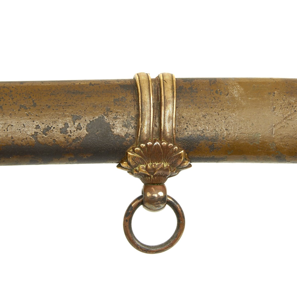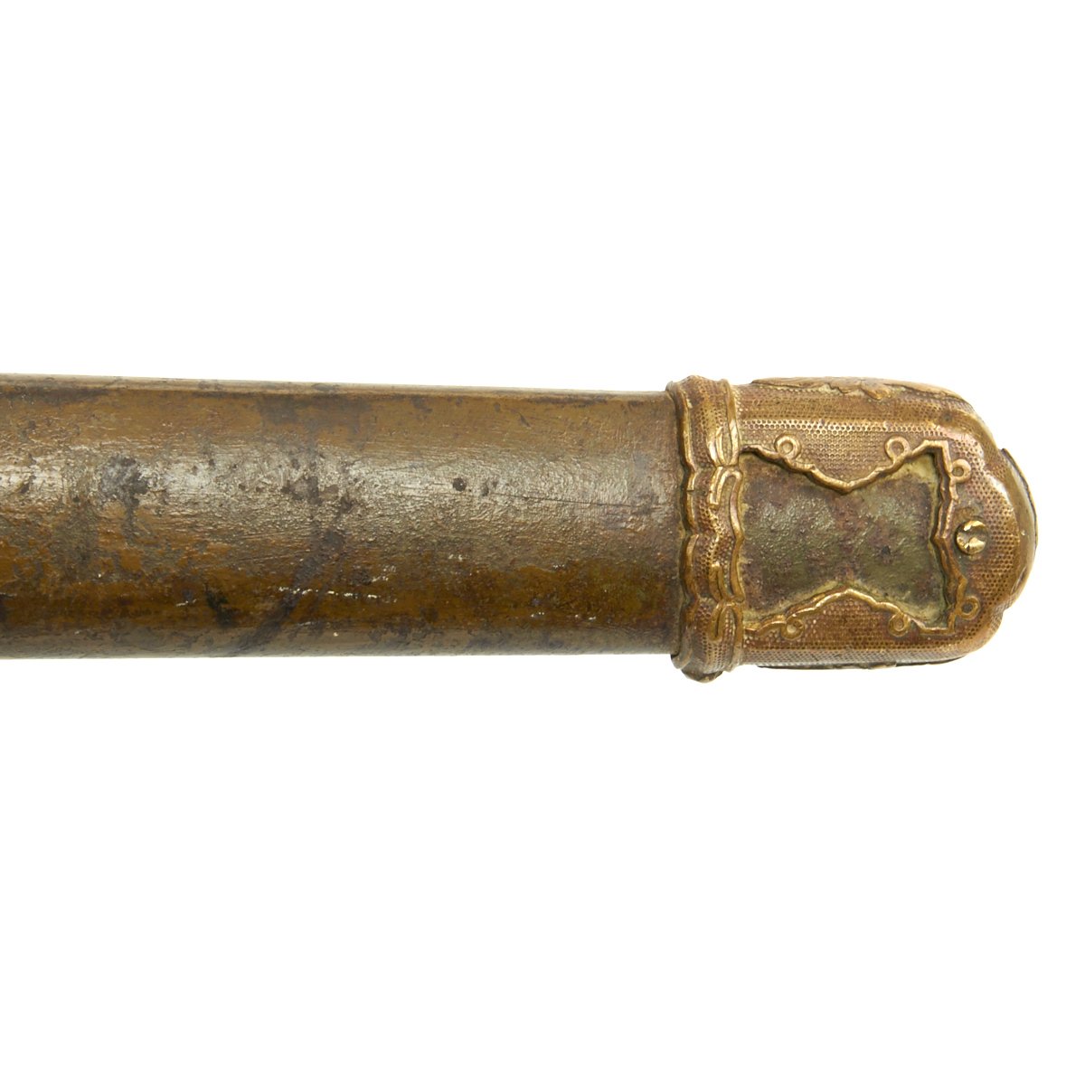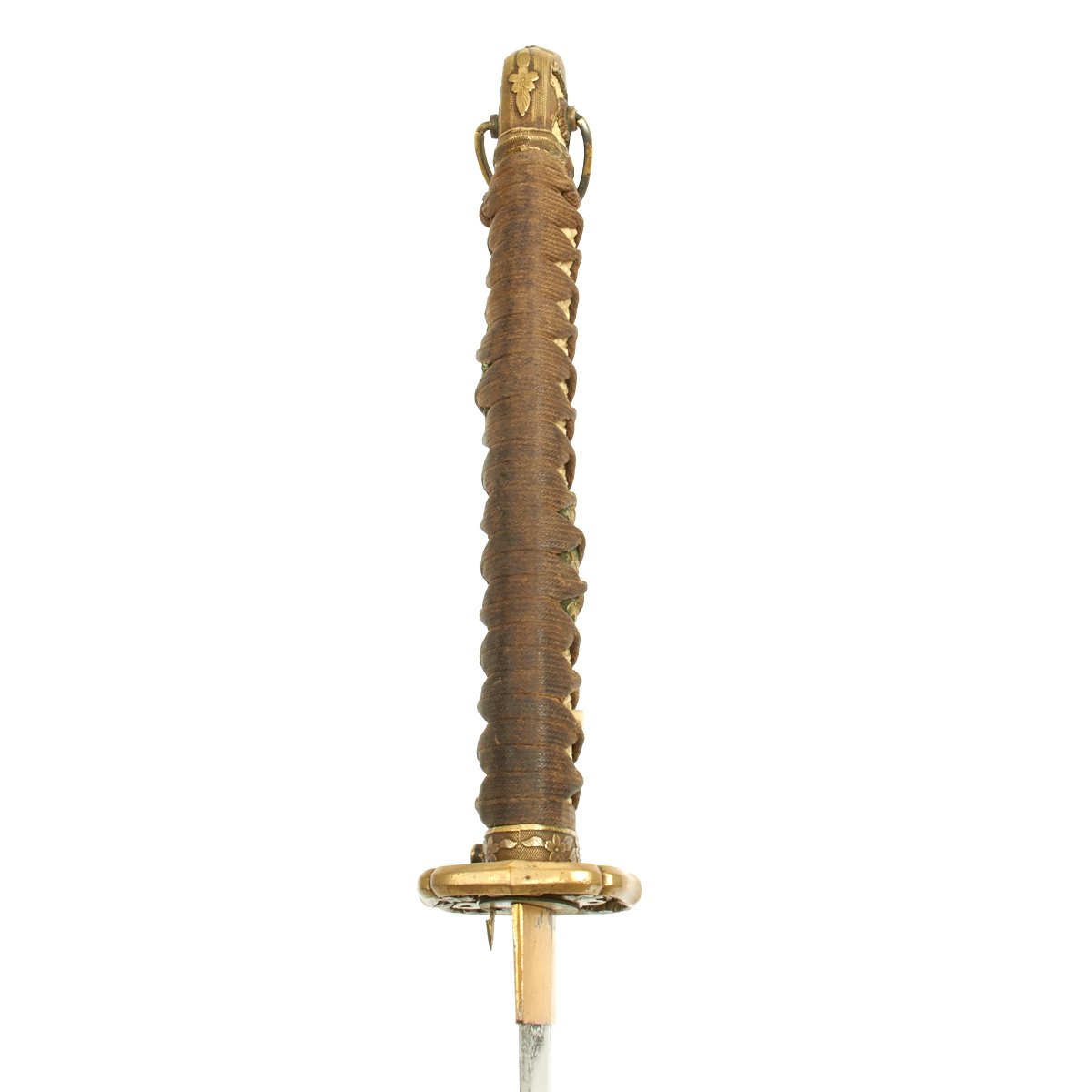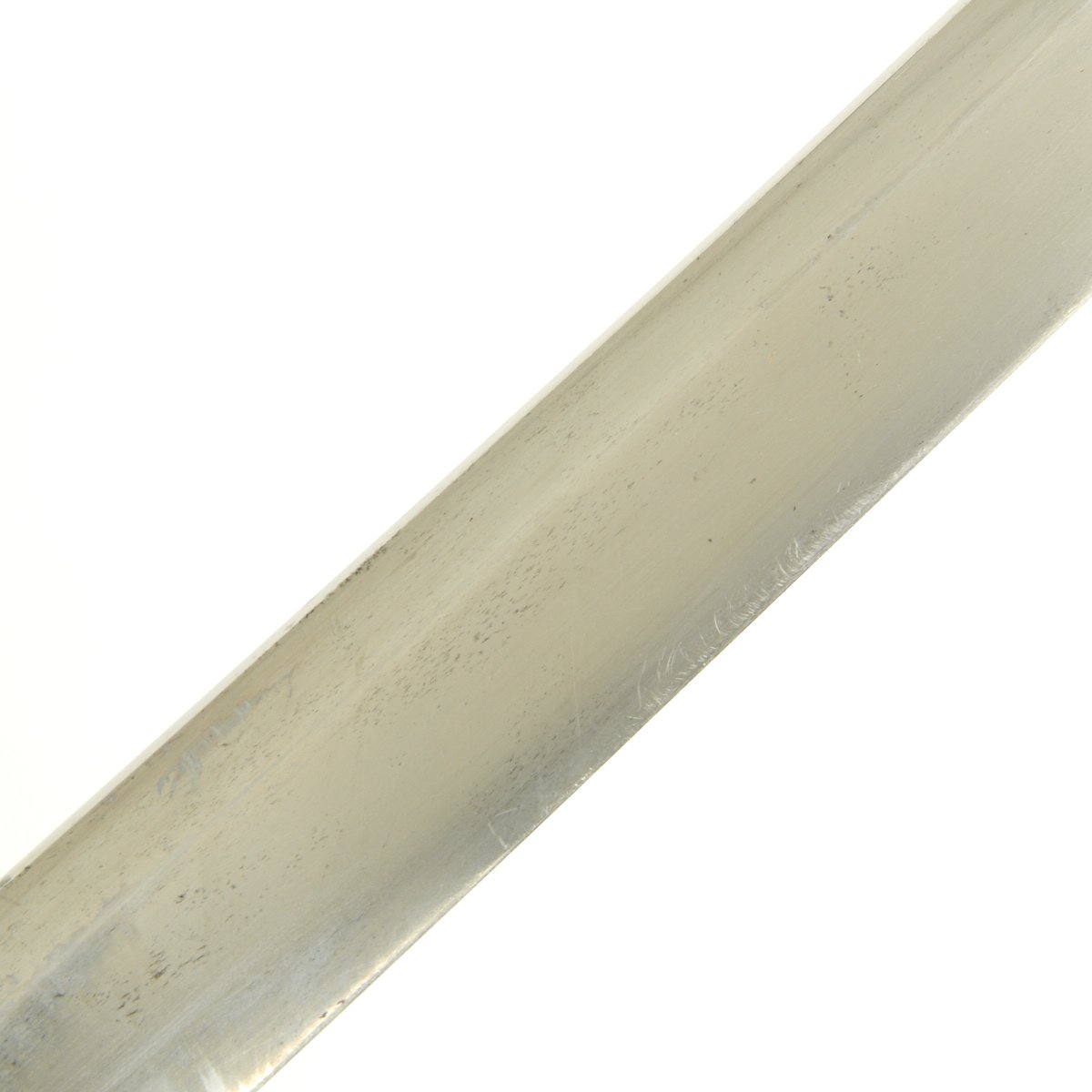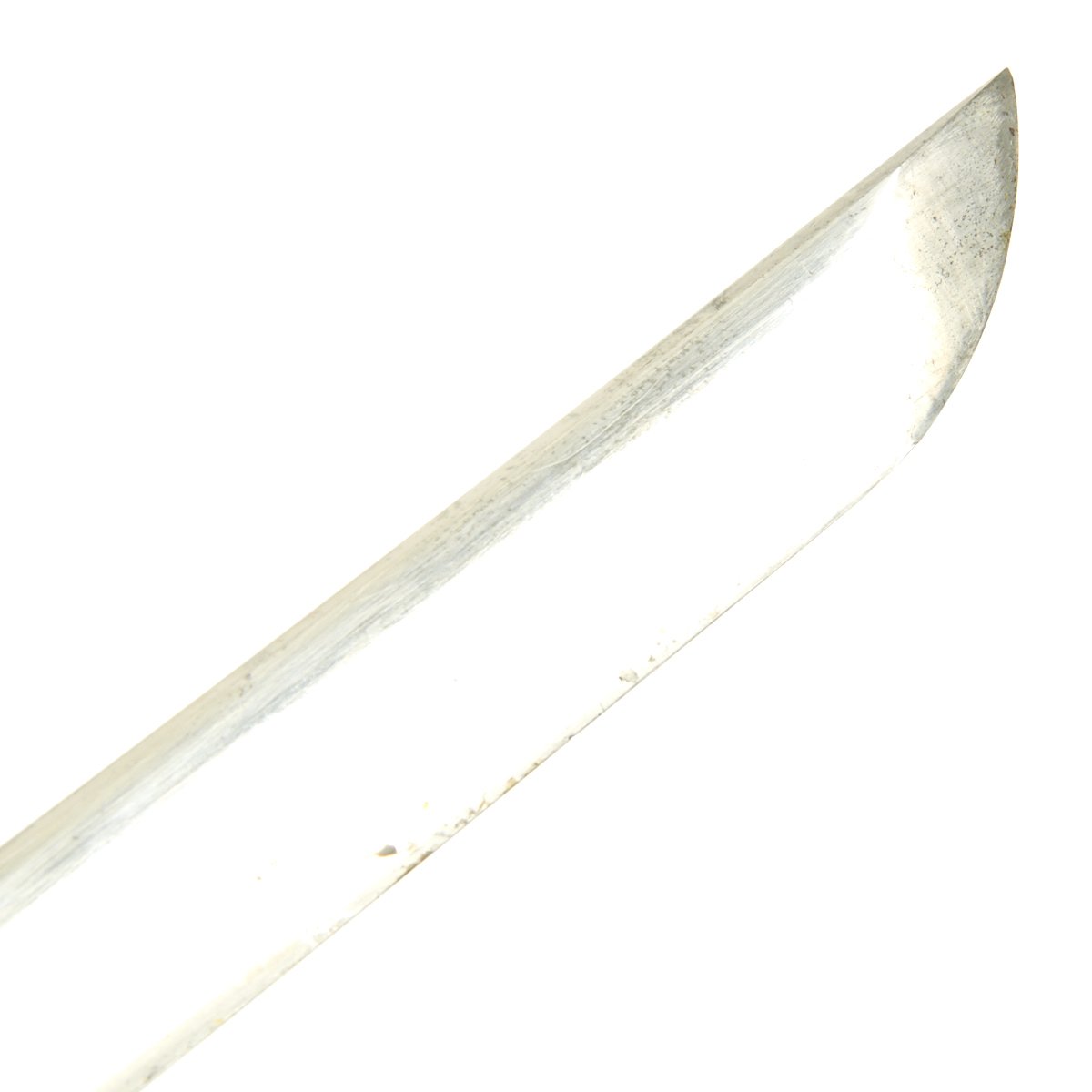 Offered in good condition with a clean mostly bright blade, this sword has definitely seen use, as indicated by blade and handle condition. The cutting edge has some small nicks up and down the cutting edge, and there is a bit of surface rust near the hilt. There does not appear to have been any post-war sharpening of the blade however, and it is still sharp. Blade is somewhat heavy and the length is approximately 26 1/4" and overall length 37 1/2".