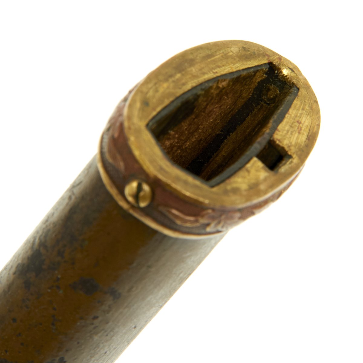 The blade mountings are the classic WW2 era Army style. Round brass tsuba (cross guard) is of the typical army type, with cherry blossom decorations. The fuchi (blade collar) is gilt copper. The tsuka (handle) has brass Imperial Army cherry blossom menuki (grip decoration), and a nice Kabuto-Gane (Pommel Cap), with the bamboo securing peg still present. It has an excellent stingray Sa-Me (grip) with complete Ito (cloth binding), though the cloth is slightly stained from use.