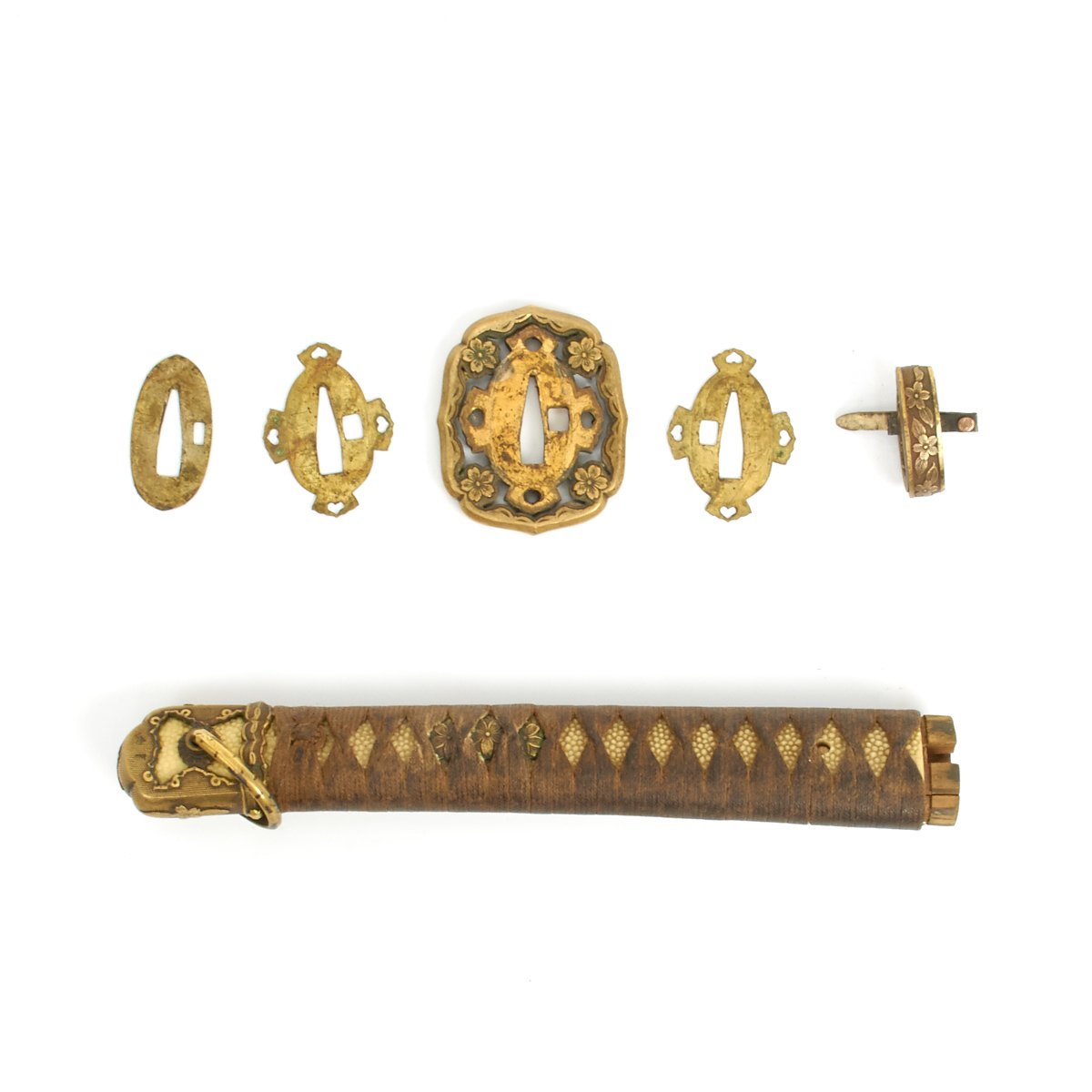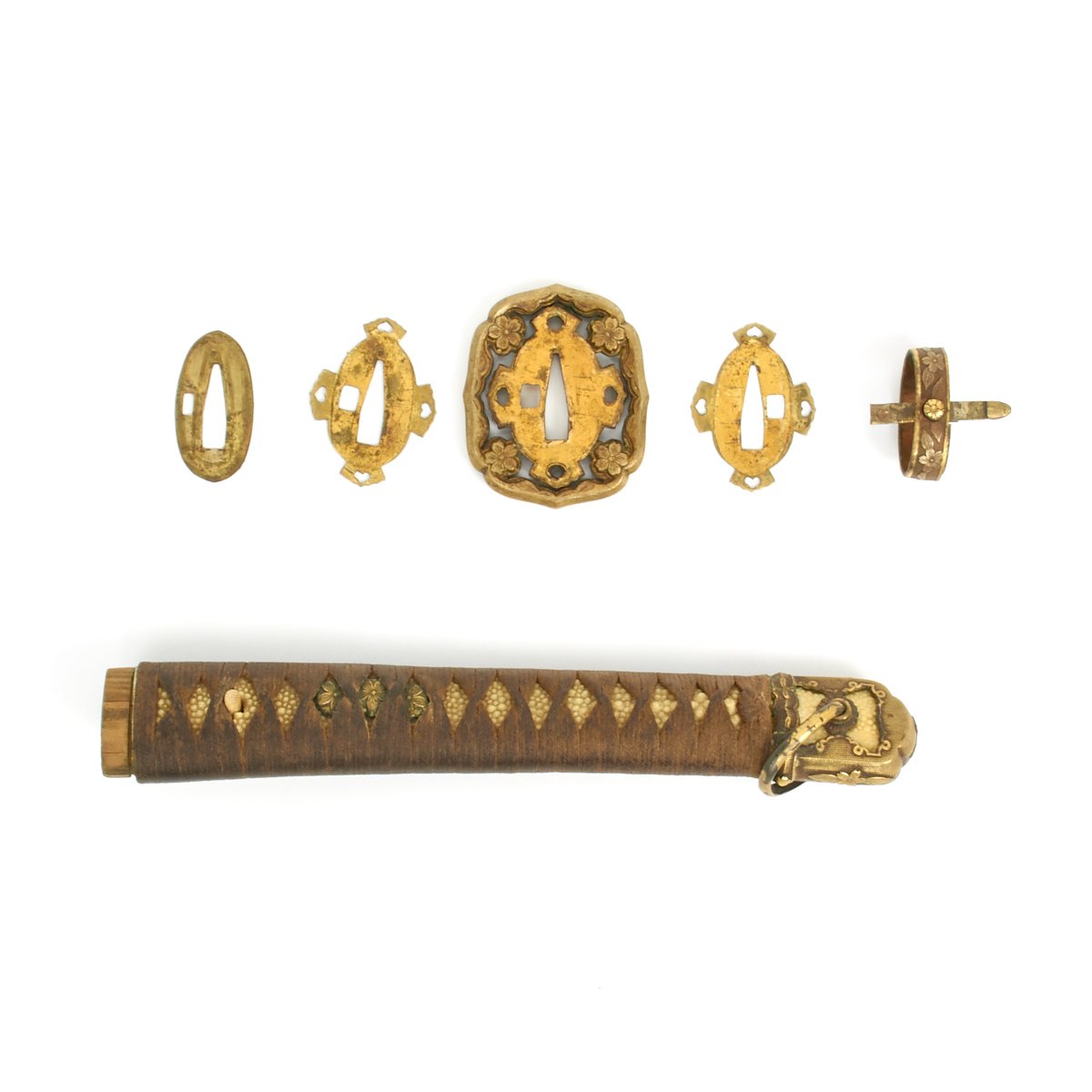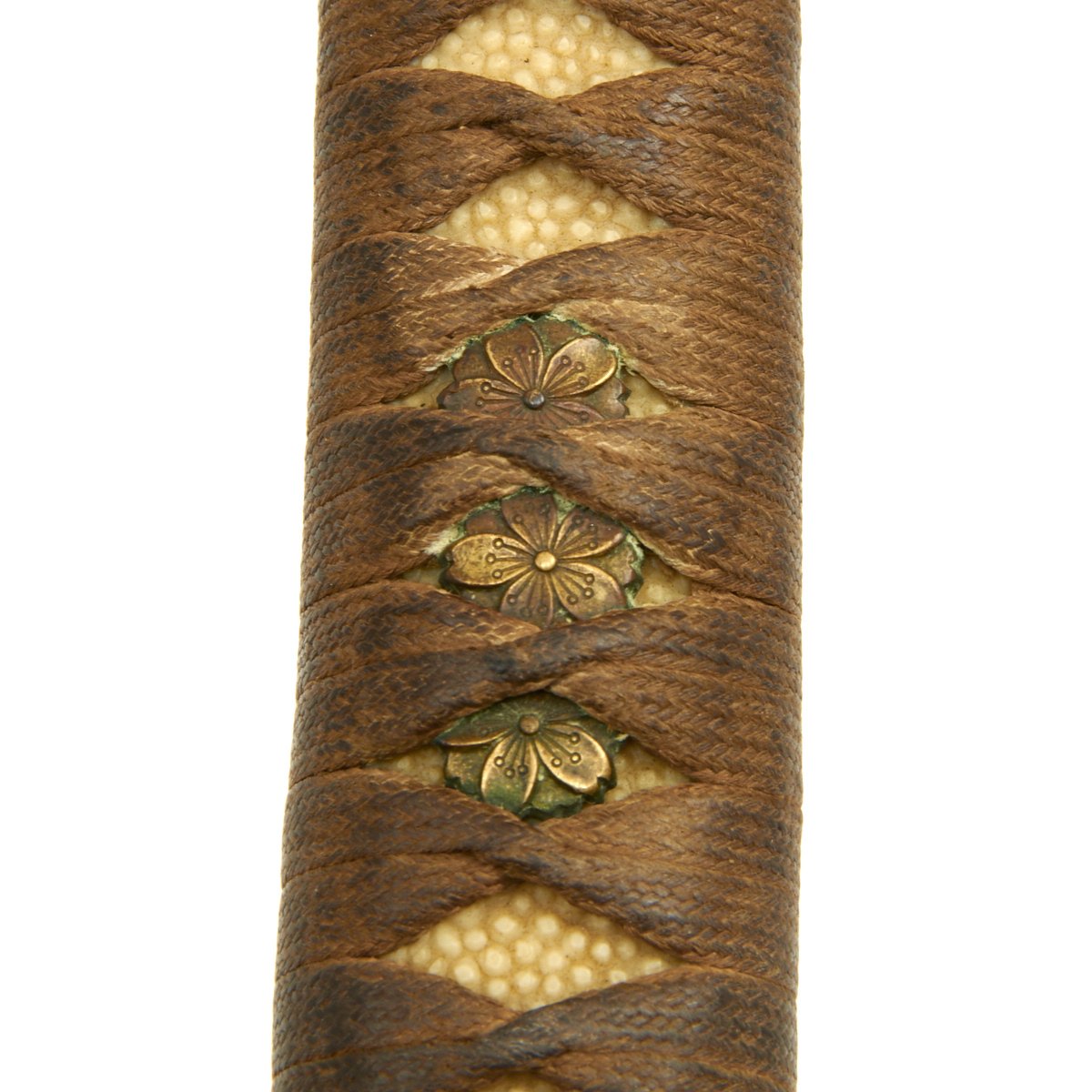 The cross guard and pommel cap have matching cherry blossom motifs, which are also found on the scabbard fittings. There are 3 Seppa (spacers) around the cross guard to keep the fit tight and they are inleted for the scabbard lock. The Scabbard (saya) is steel with a wood interior, and is in good condition, though it is missing some of the original brown paint. It matches and locks into the scabbard.