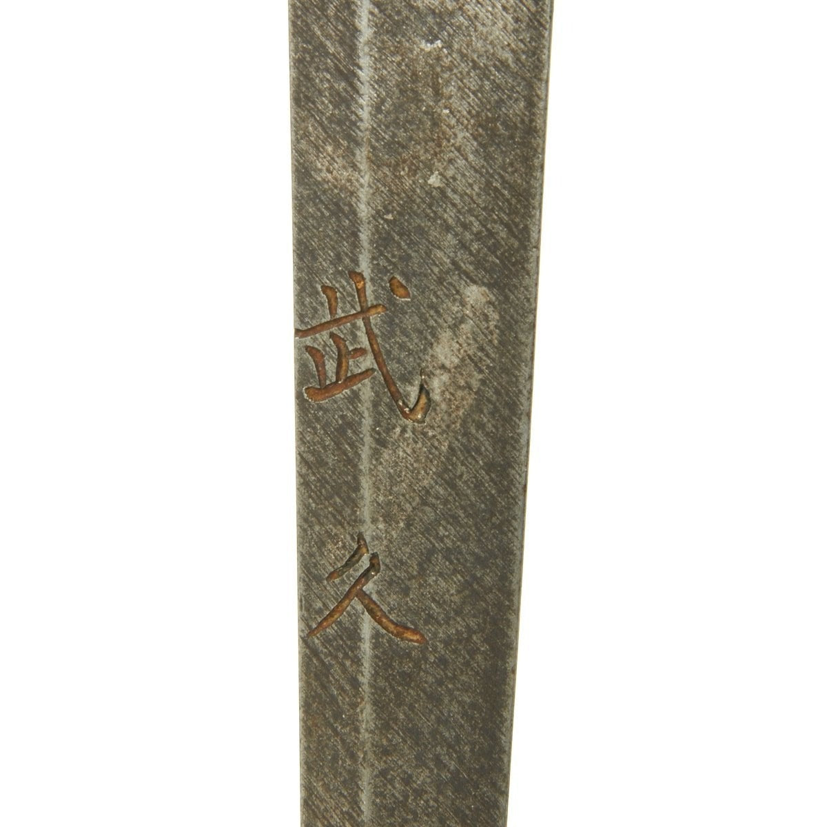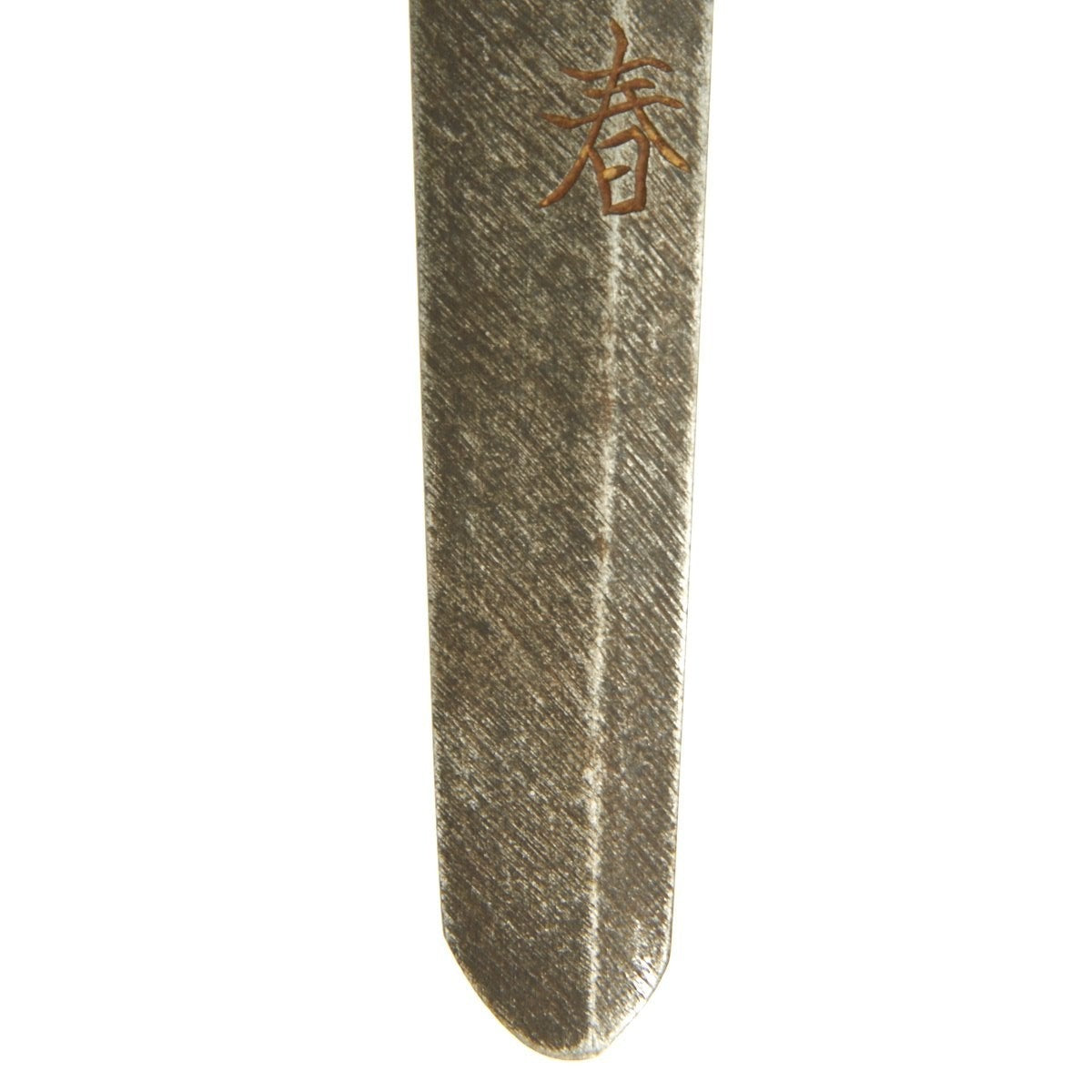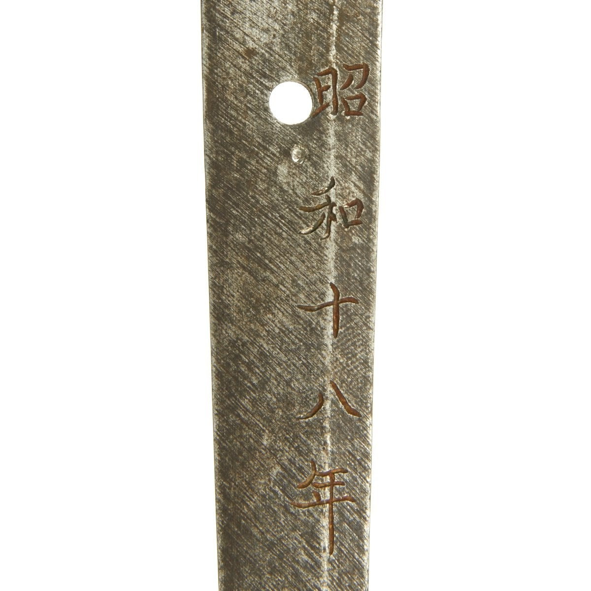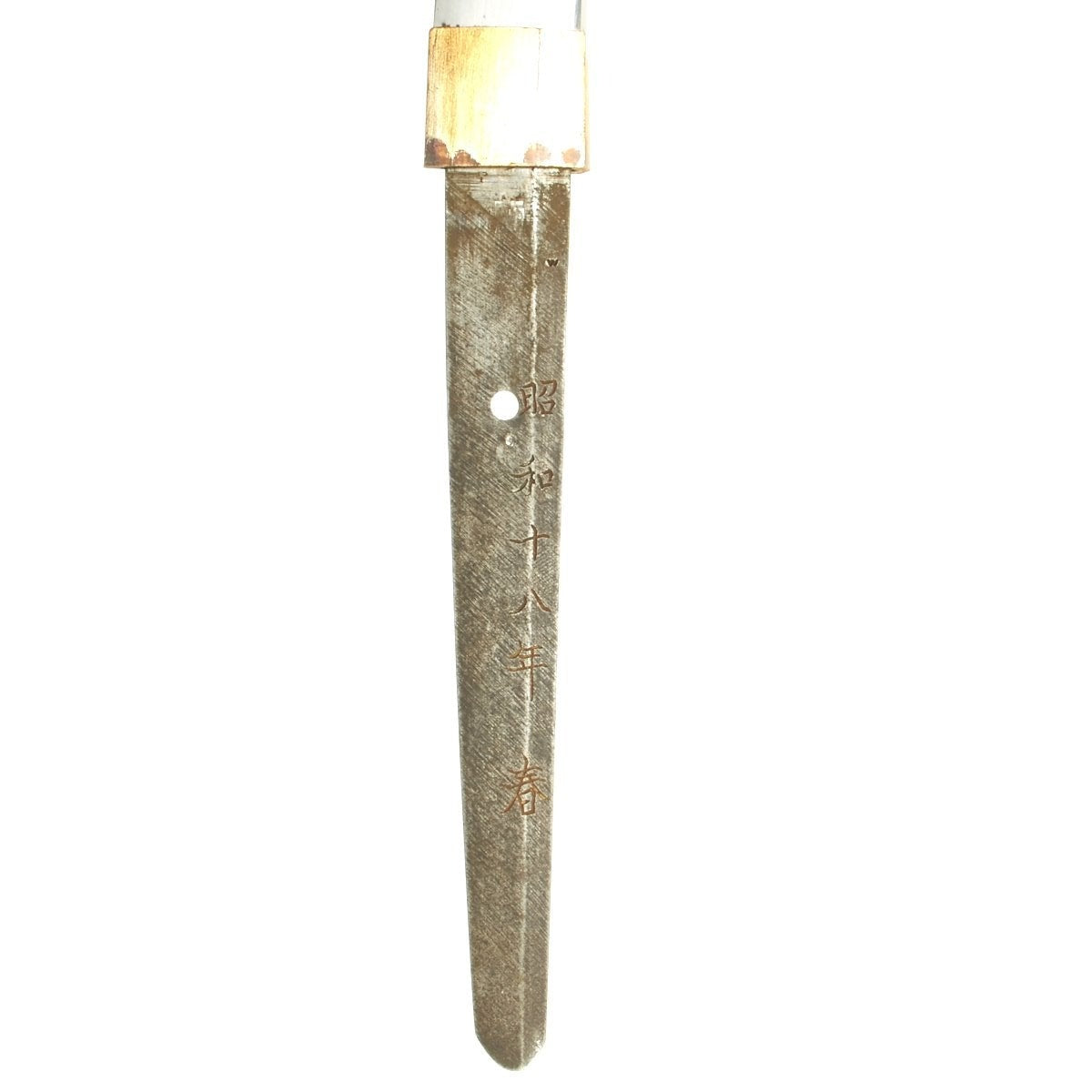 The tang of the blade (nakago) is the typical futsu (normal) shape of the period, with a kengyo (symmetrically pointed) tip, with some file marks. The maker is marked with two characters: 武 久- TAKEHISA. The opposite side of the tang is marked with the date, which is in the standard Japanese format: 昭 和 十 八 年 春 (Showa Juu Hachi Nen Haru). This date system is based on the year of the current reigning emperor, so this sword was made in the 18th (Juu Hachi) year (Nen) of Showa Emperor Hirohito's reign, 1943 in the western calendar, in the Spring season (haru). This was considered most auspicious time for forging swords.