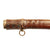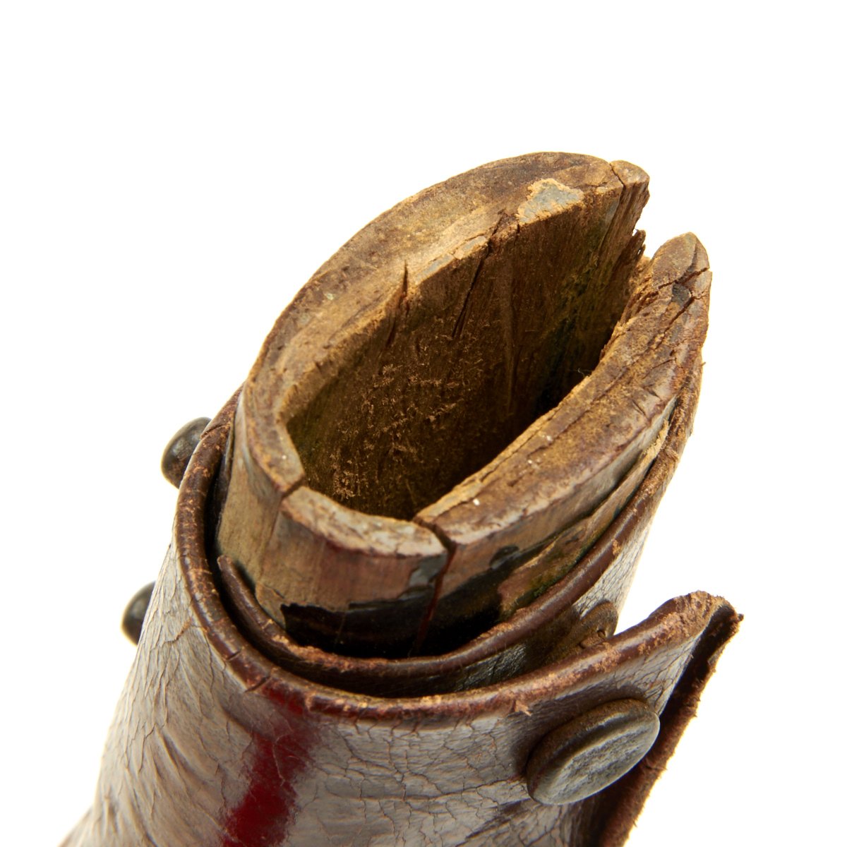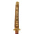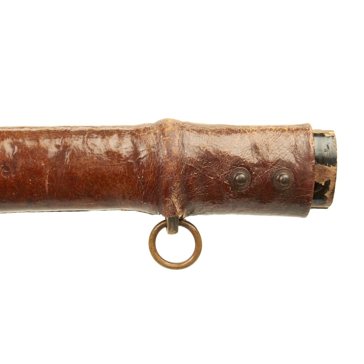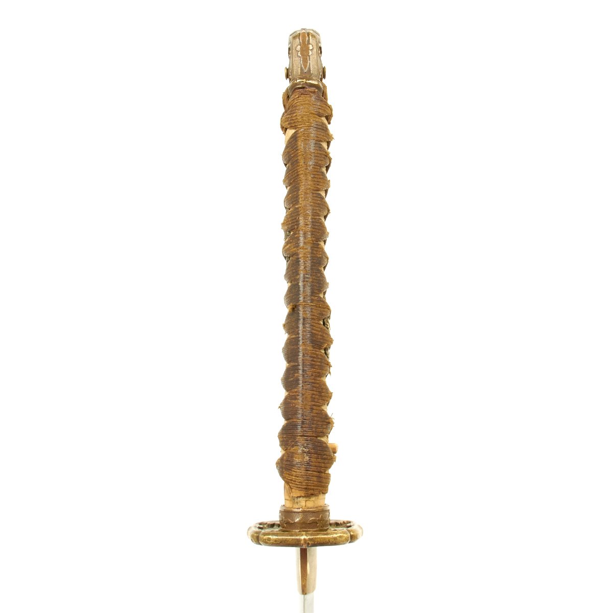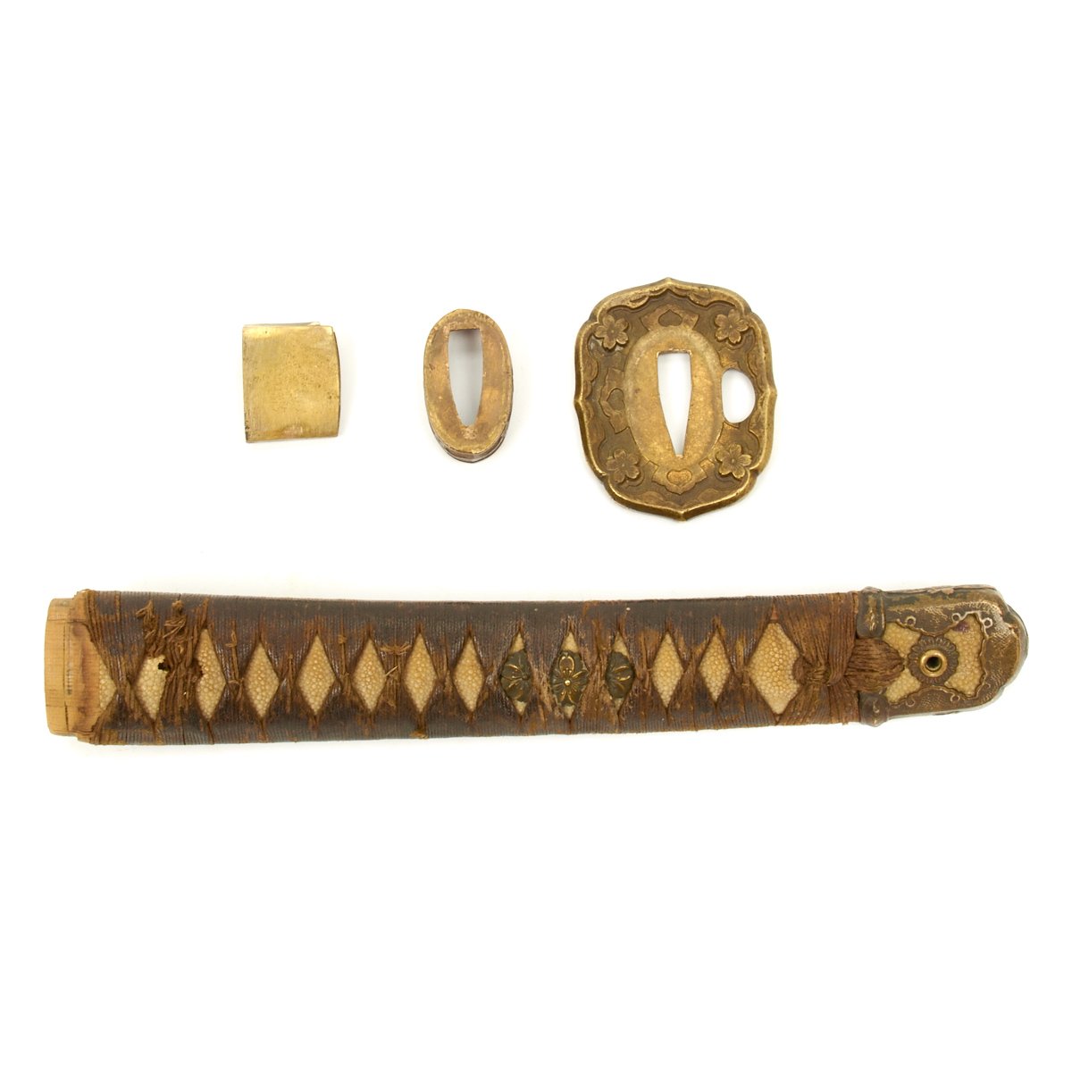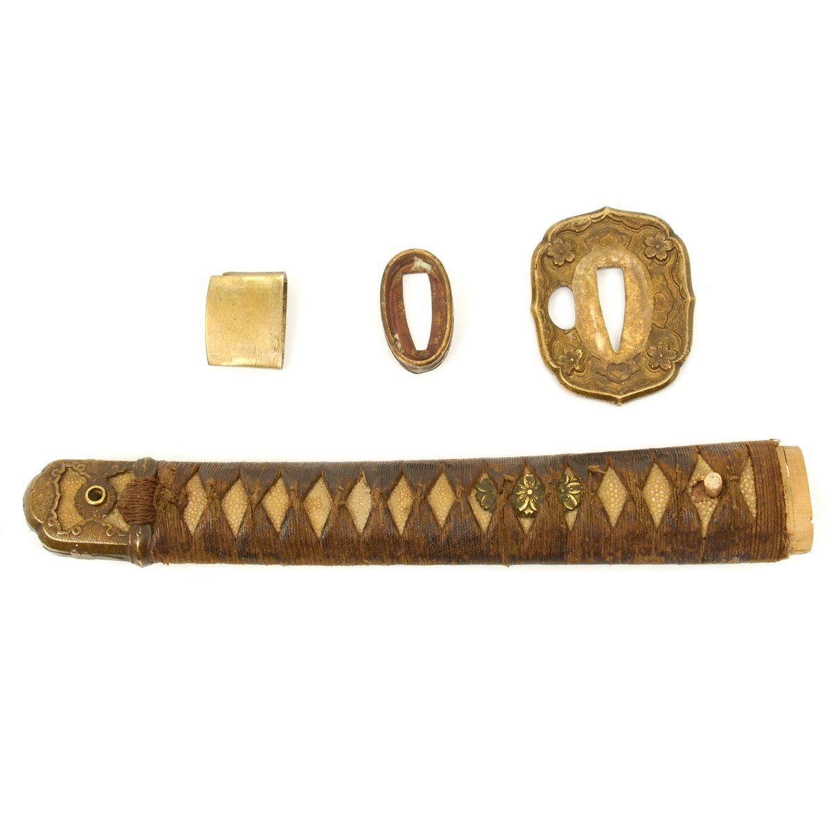 The Scabbard (saya) is black lacquered wood, and is in fair condition, with a brass hanger ring. The scabbard is mostly covered with a lovely brown leather cover, which has shrunk over time, making removing it from the scabbard difficult, so we did not try. The end of the scabbard is mushroomed out a bit from contact with the ground.
