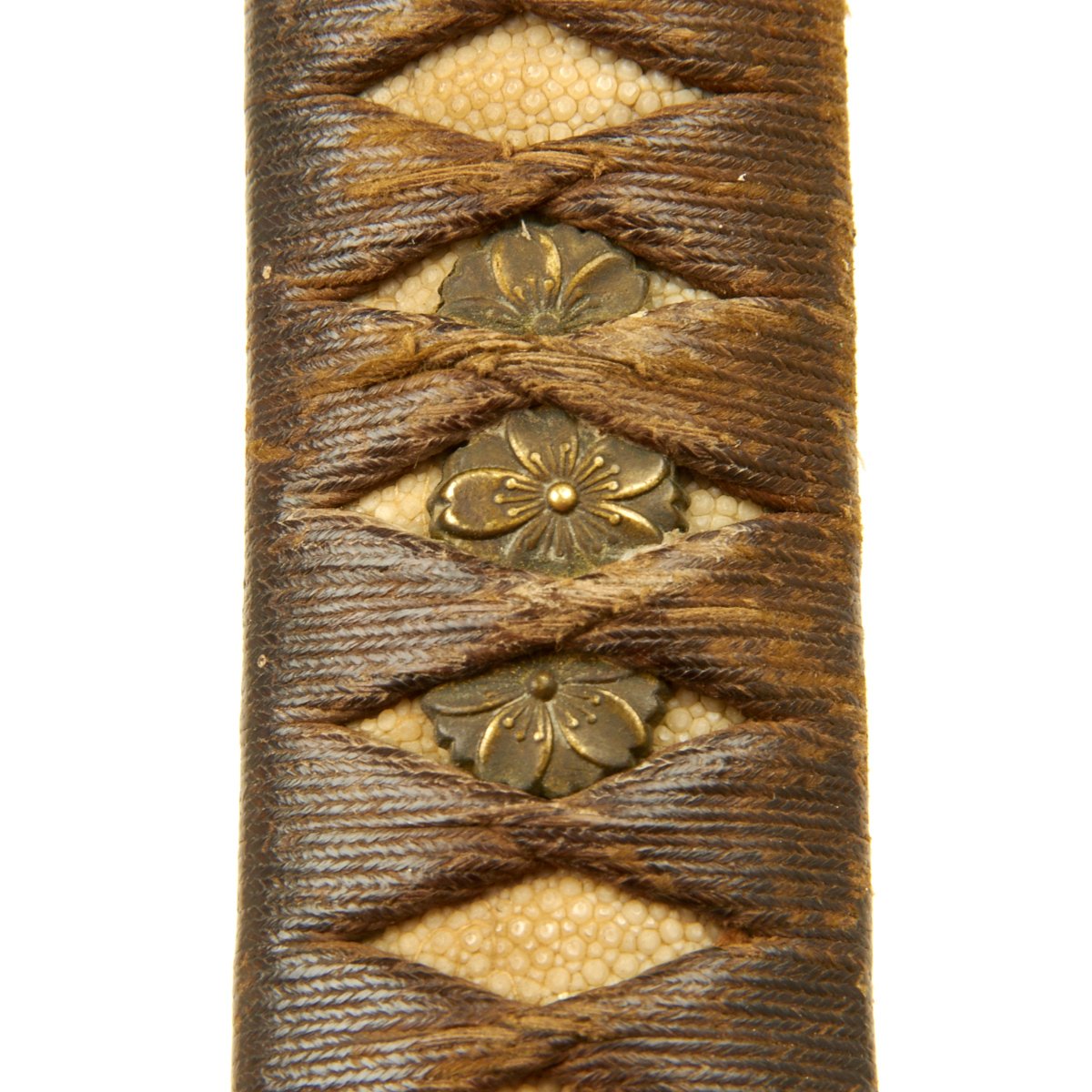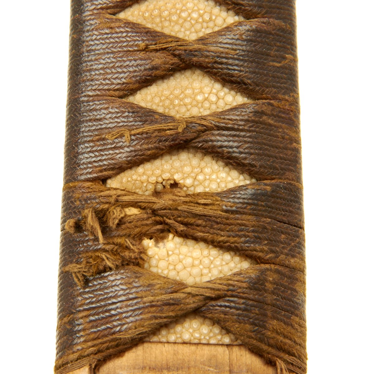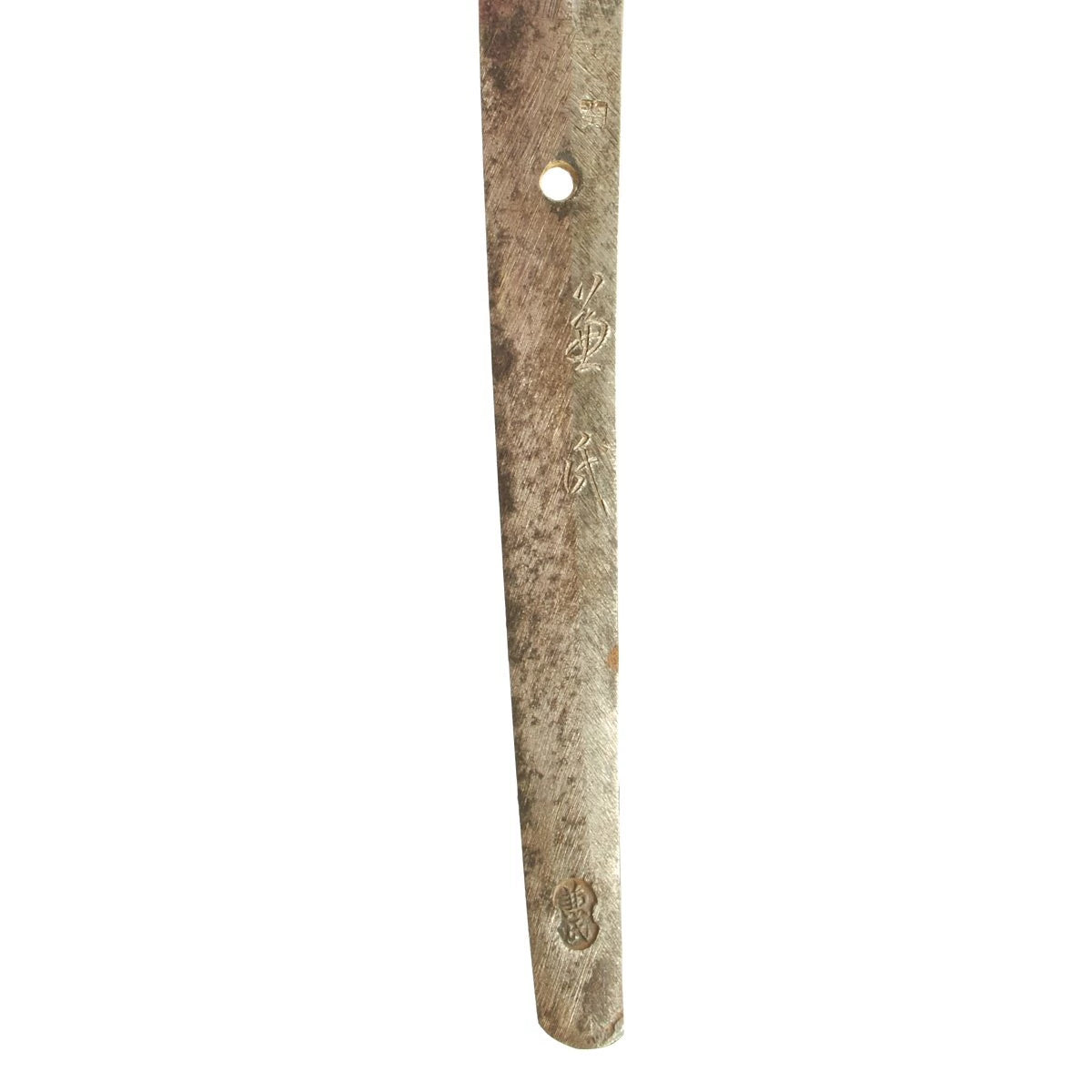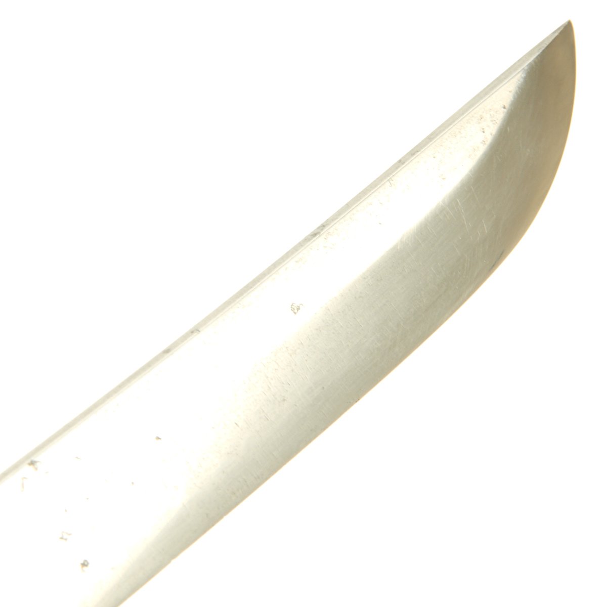 Offered in good condition with a clean mostly bright blade, this sword has definitely seen use, as indicated by blade and handle condition. The cutting edge has some small nicks up and down the cutting edge, and the polish of the blade has been worn, making the gunome midare (irregular zig zag) shaped hamon somewhat hard to see. There does not appear to have been any post-war sharpening of the blade however, and it is still sharp. Blade is somewhat heavy and the length is approximately 26 1/2" and overall length 38".