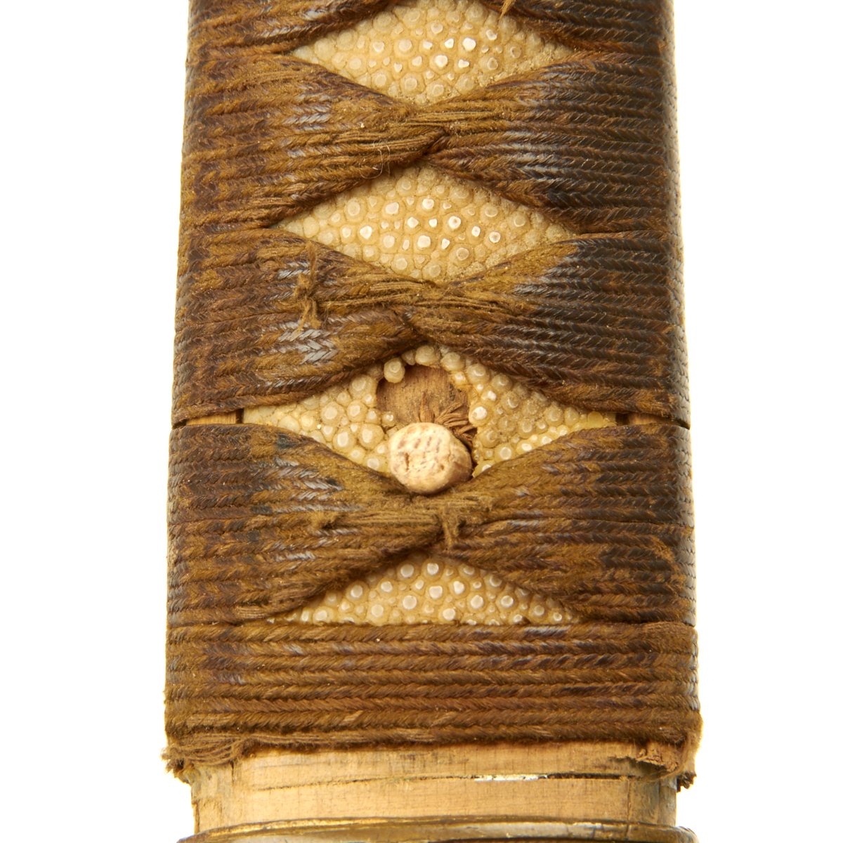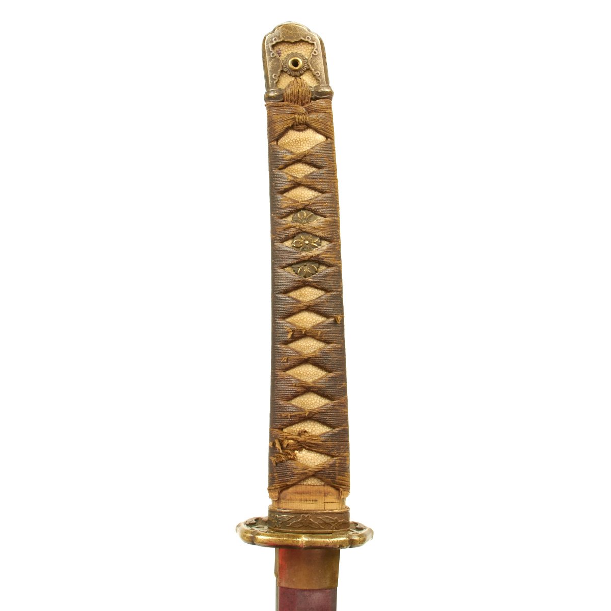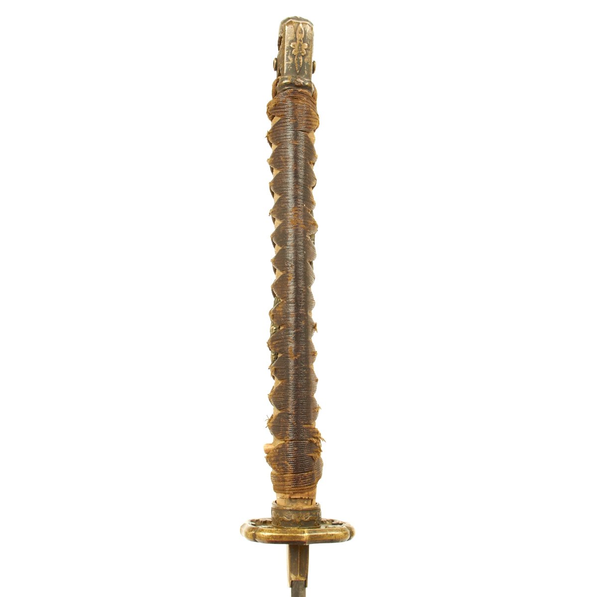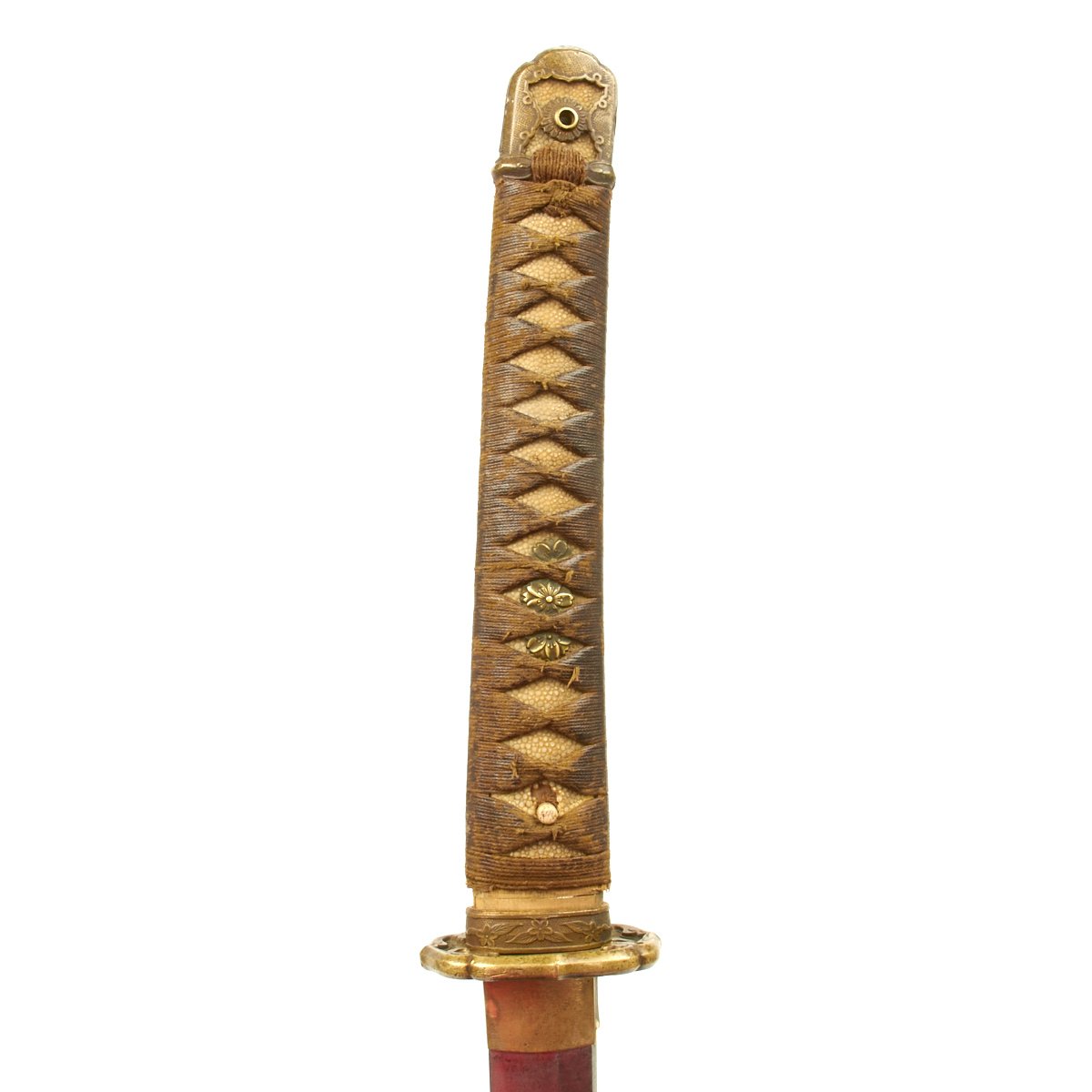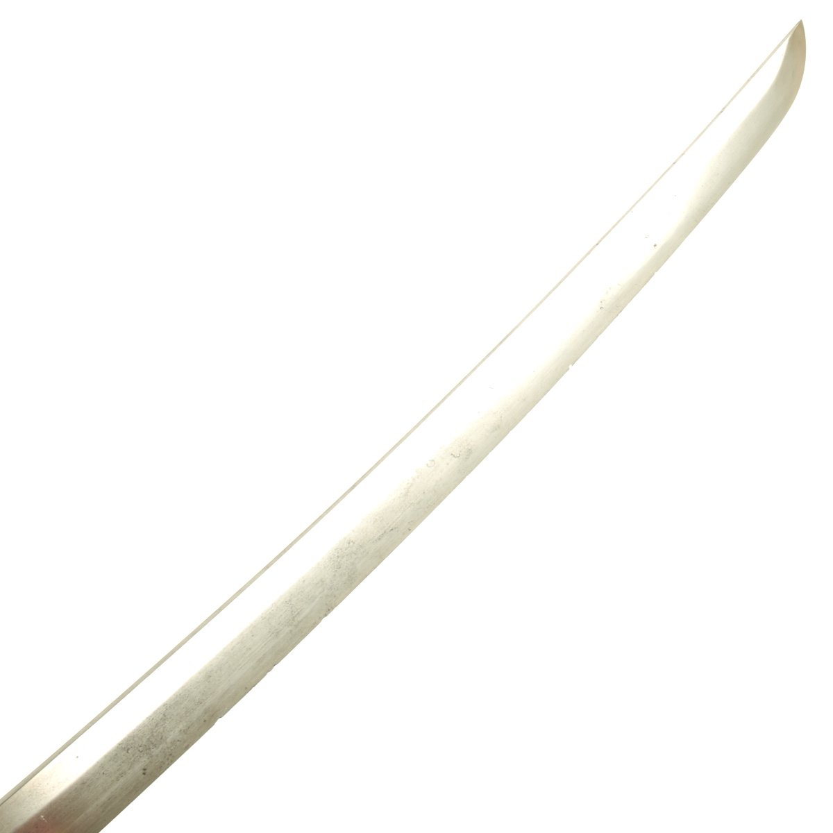 Offered in good condition with a clean mostly bright blade, this sword has definitely seen use, as indicated by blade and handle condition. The cutting edge has some small nicks up and down the cutting edge, and the polish of the blade has been worn, making the gunome midare (irregular zig zag) shaped hamon somewhat hard to see. There does not appear to have been any post-war sharpening of the blade however, and it is still sharp. Blade is somewhat heavy and the length is approximately 26 1/2" and overall length 38".