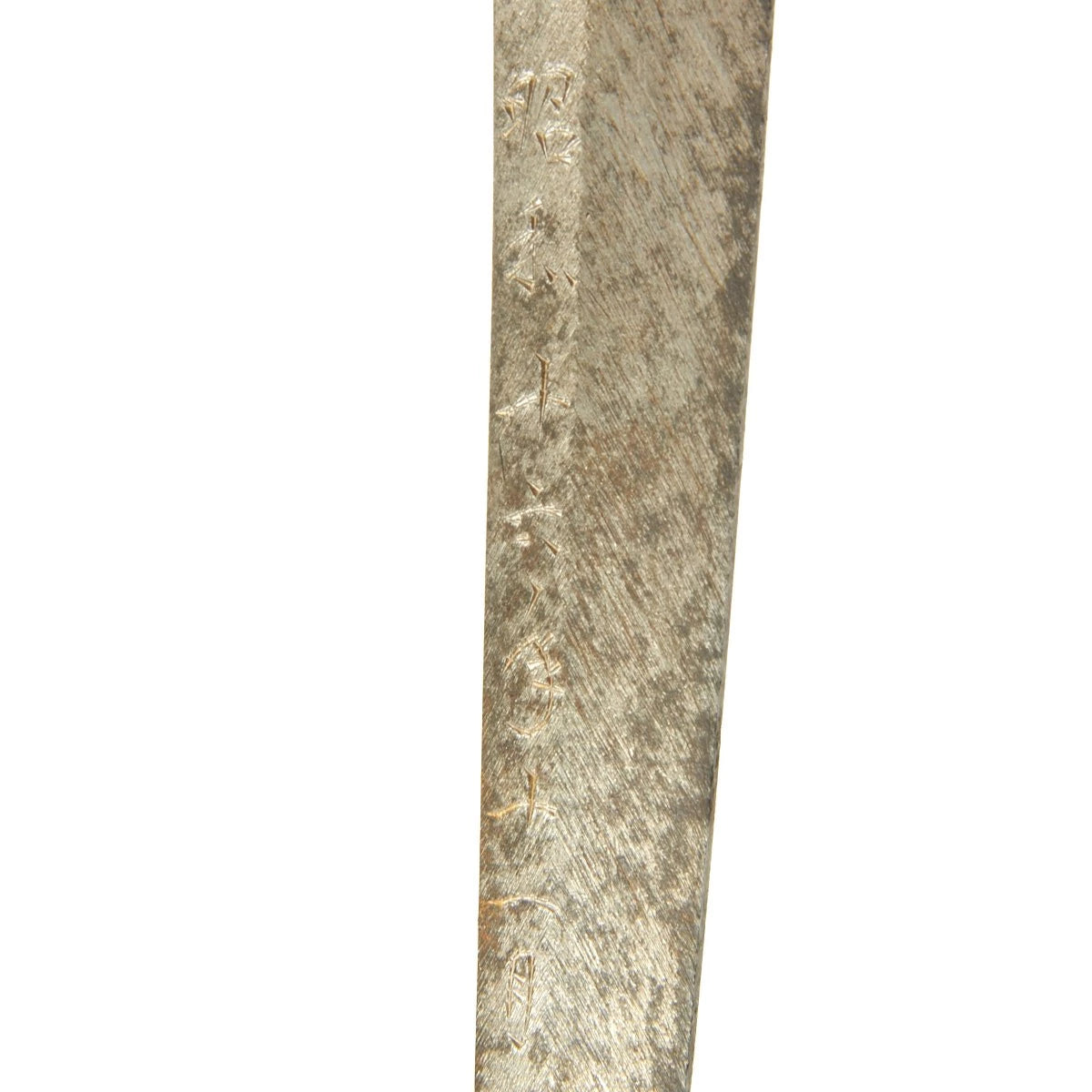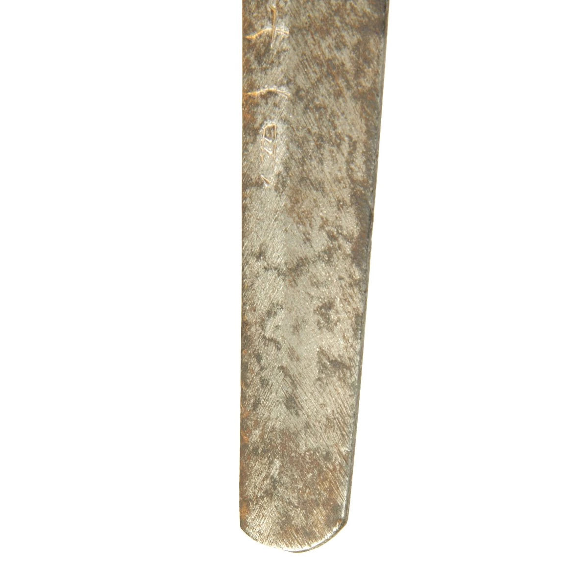 The markings on the tang are ones that we have deciphered, and have the name of the smith both chisel marked and hot-stamped into the blade: 兼氏 (KANE-UJI) a wartime smith with the surname of Yoshida working at the arsenal in Seki, which is stamped above the name. The opposite side of the tang is marked with the date, which is in the standard Japanese format: 昭和 十六 年 十一月 (Showa Juu Roku Nen Juuichi gatsu). This date system is based on the year of the current reigning emperor, so this sword was made in the 16th year of Showa Emperor Hirohito's reign, 1941 in the western calendar, in the 11th month of November.