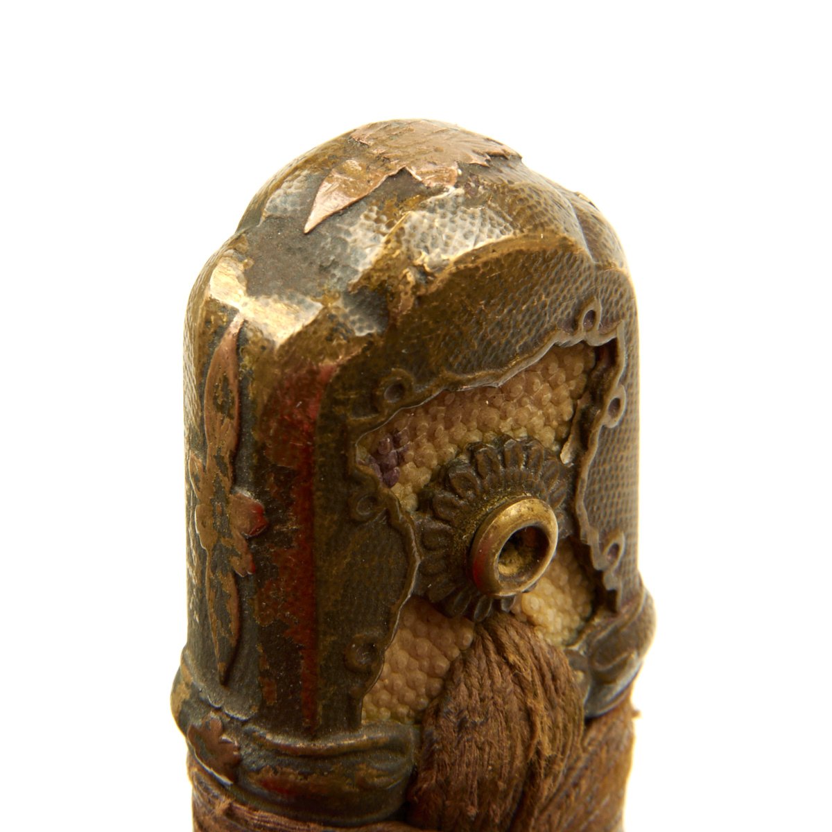 The blade mountings are the classic WW2 era Army style. Brass Habaki (blade collar) with a round brass tsuba (cross guard) is of the typical army type, with cherry blossom decorations. The fuchi (hilt collar) is brass with cherry blossoms as well, and shows wear. The tsuka (handle) has brass Imperial Army cherry blossom menuki (grip decoration), and also has a nice Kabuto-Gane (Pommel Cap), also with cherry blossoms. The Single bamboo securing peg is still present. Excellent stingray Sa-Me (grip) with complete Ito (cloth binding), though the cloth is definitely worn from use. Overall the hilt is very tight fitting, most likely from shrinkage over the years. Usually there would also be some Seppa (spacers) around the tsuba to keep it stable, but they are unfortunately missing, so the cross guard is somewhat loose.