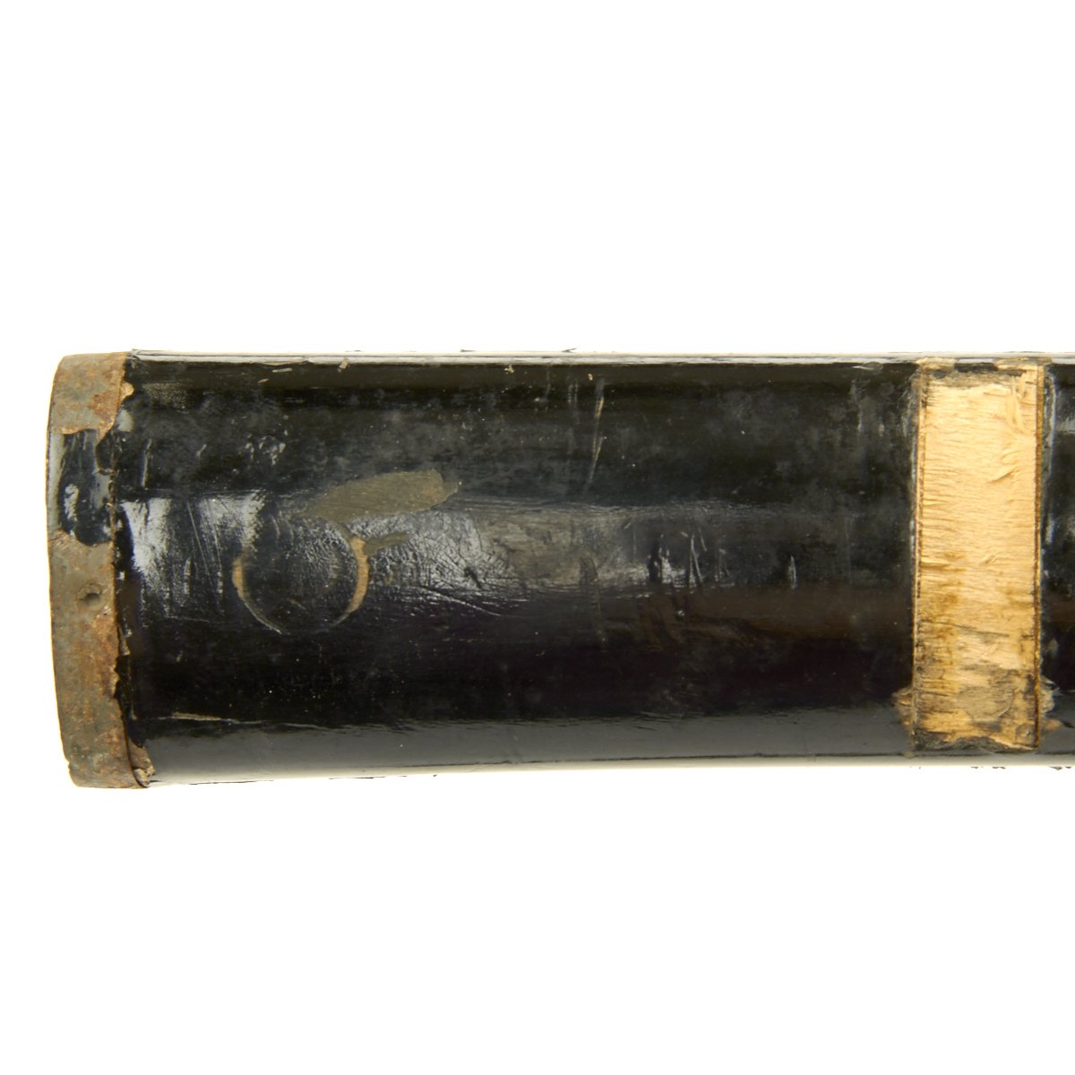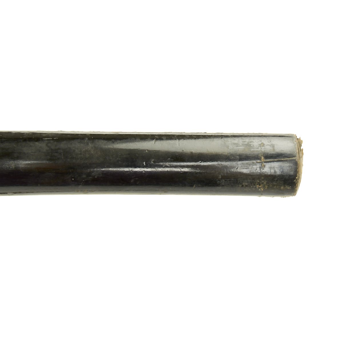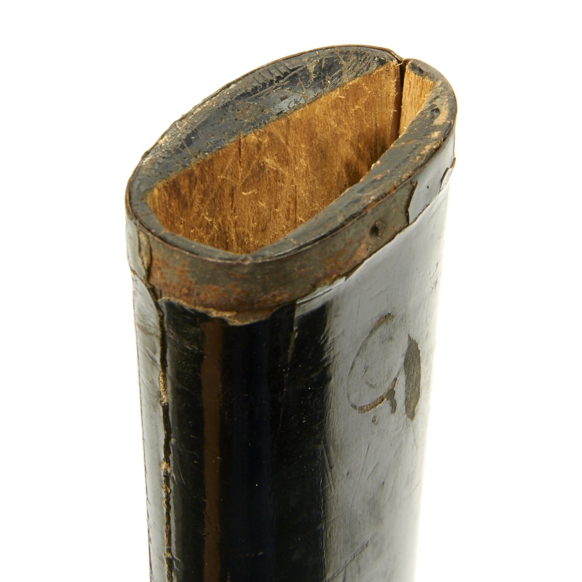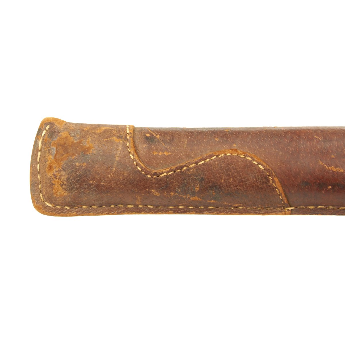 The Scabbard (saya) is wood and in very nice condition with original WW2 black paint. Over the scabbard is a high grade leather sword cover in original worn condition. There is a snap on the scabbard cover which would originally have matched a strap that attaches to the hilt, but the strap has broken off, though the leather spacer is still present with a portion of the strap.