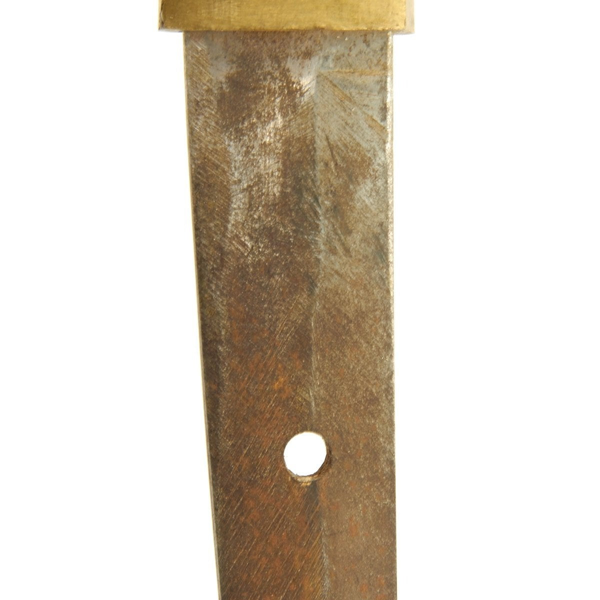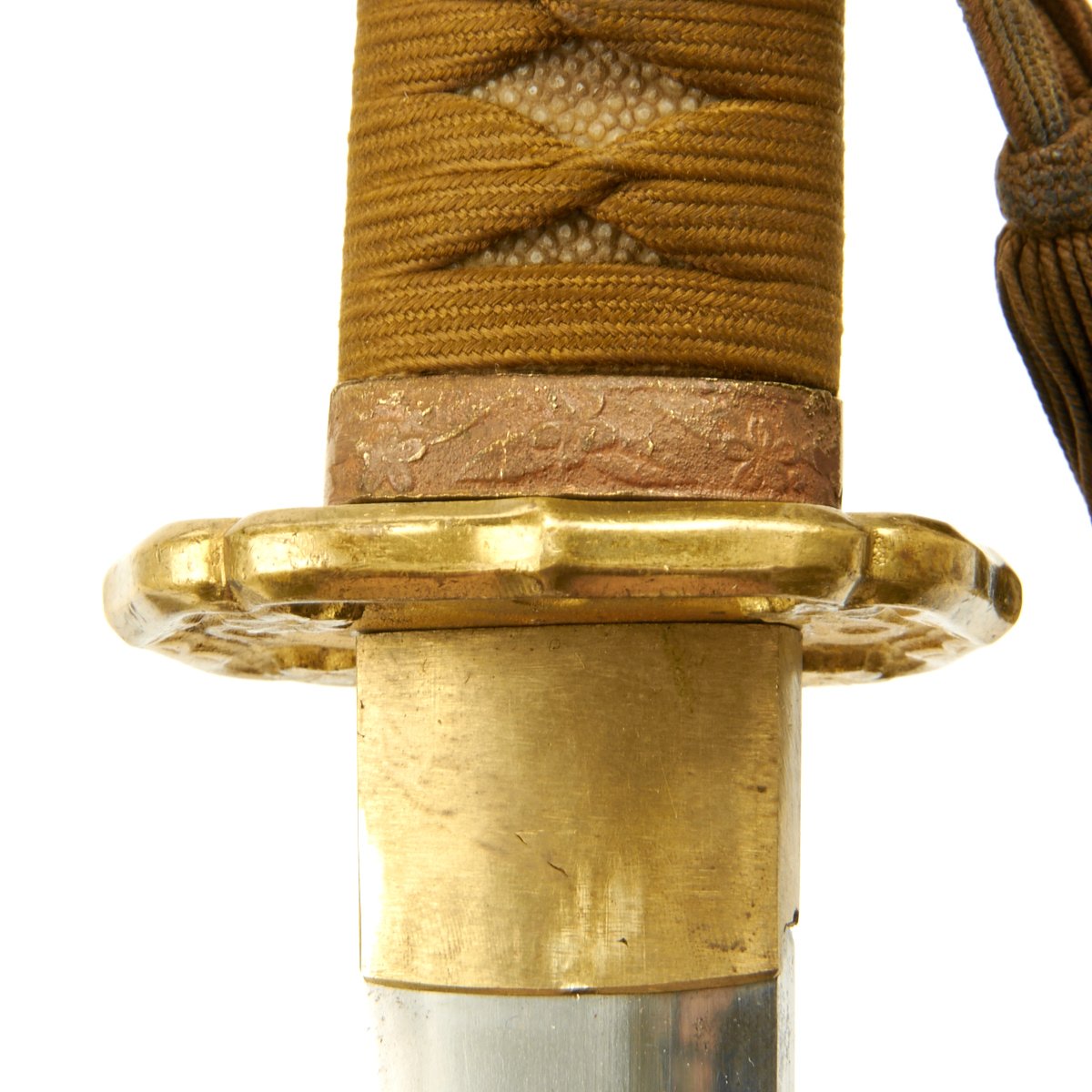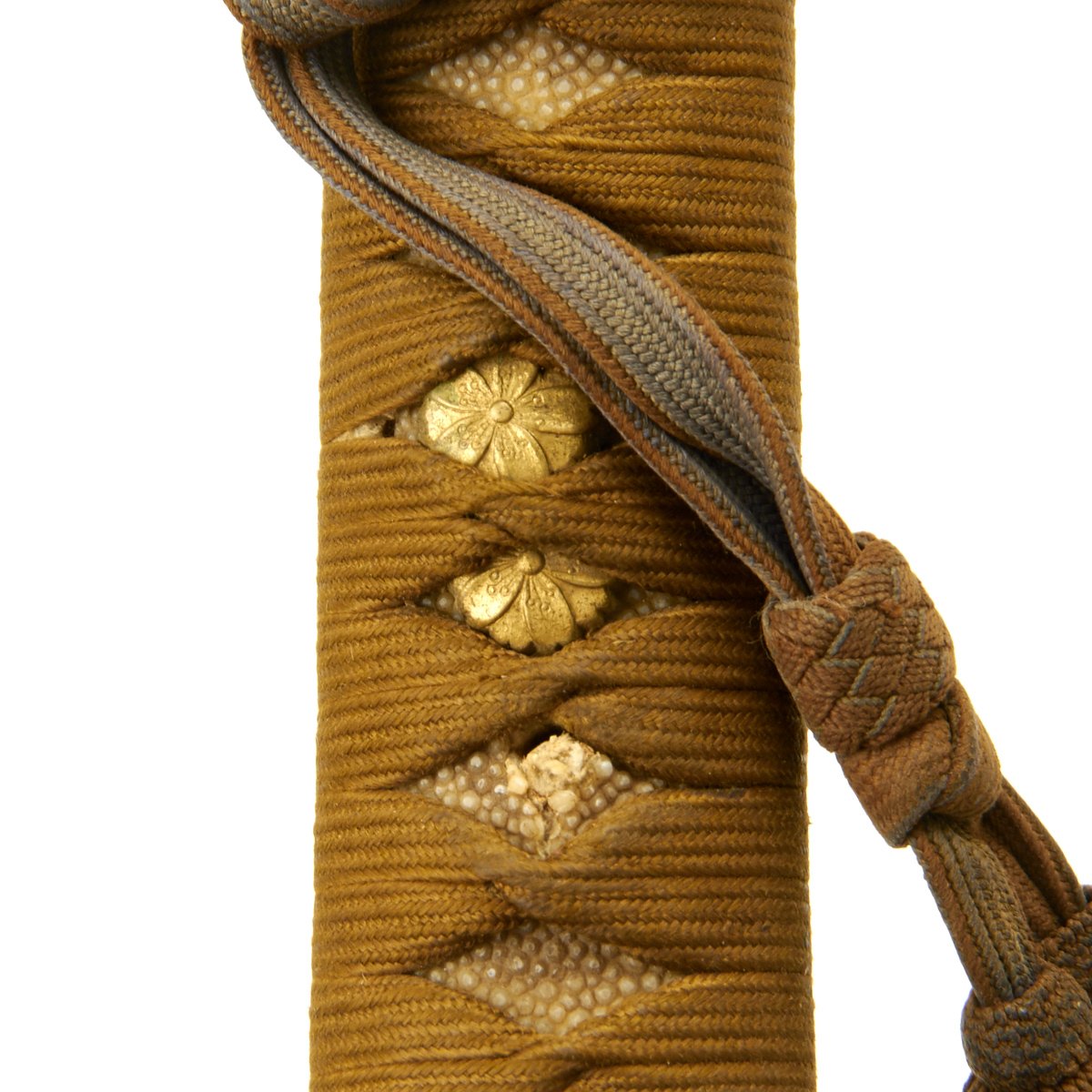 The blade mountings are the classic WW2 era Army style. Round tsuba (cross guard) with brass Imperial Army cherry blossom menuki (grip decoration), and a nice Kabuto-Gane (Pommel Cap), one bamboo securing peg still present. The cross guard and pommel cap have matching cherry blossom motifs, which are also found on the scabbard fittings. There are two seppa (spacers), a metal one, and a leather one that it one time had a strap that attached to the leather scabbard cover. Excellent stingray Sa-Me (grip) with complete Ito (cloth binding), though the cloth is slightly stained from use. Attached to the pommel cap loop is a Brown and Blue colored Tassel. This signifies that this was carried by a "company grade" officer, which would be a Lieutenant or Captain rank. The tassel is faded and worn, but the colors are still visible.