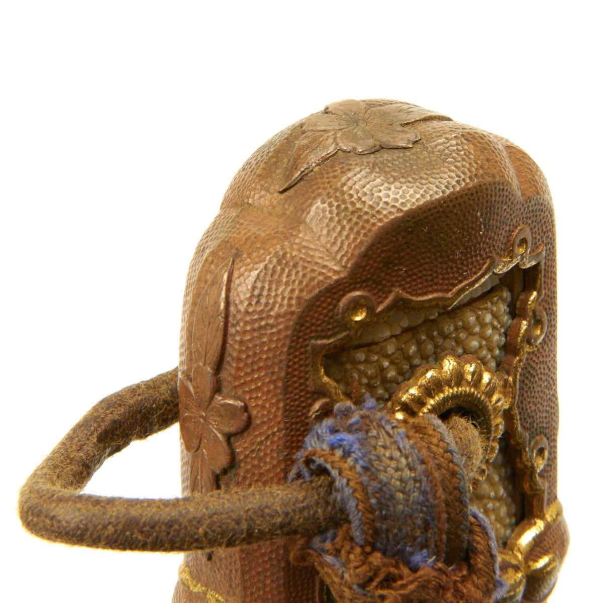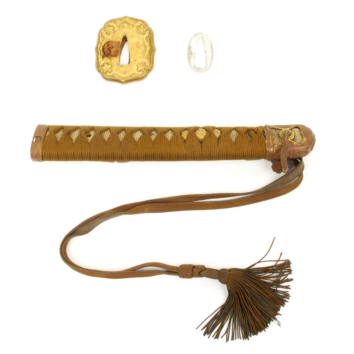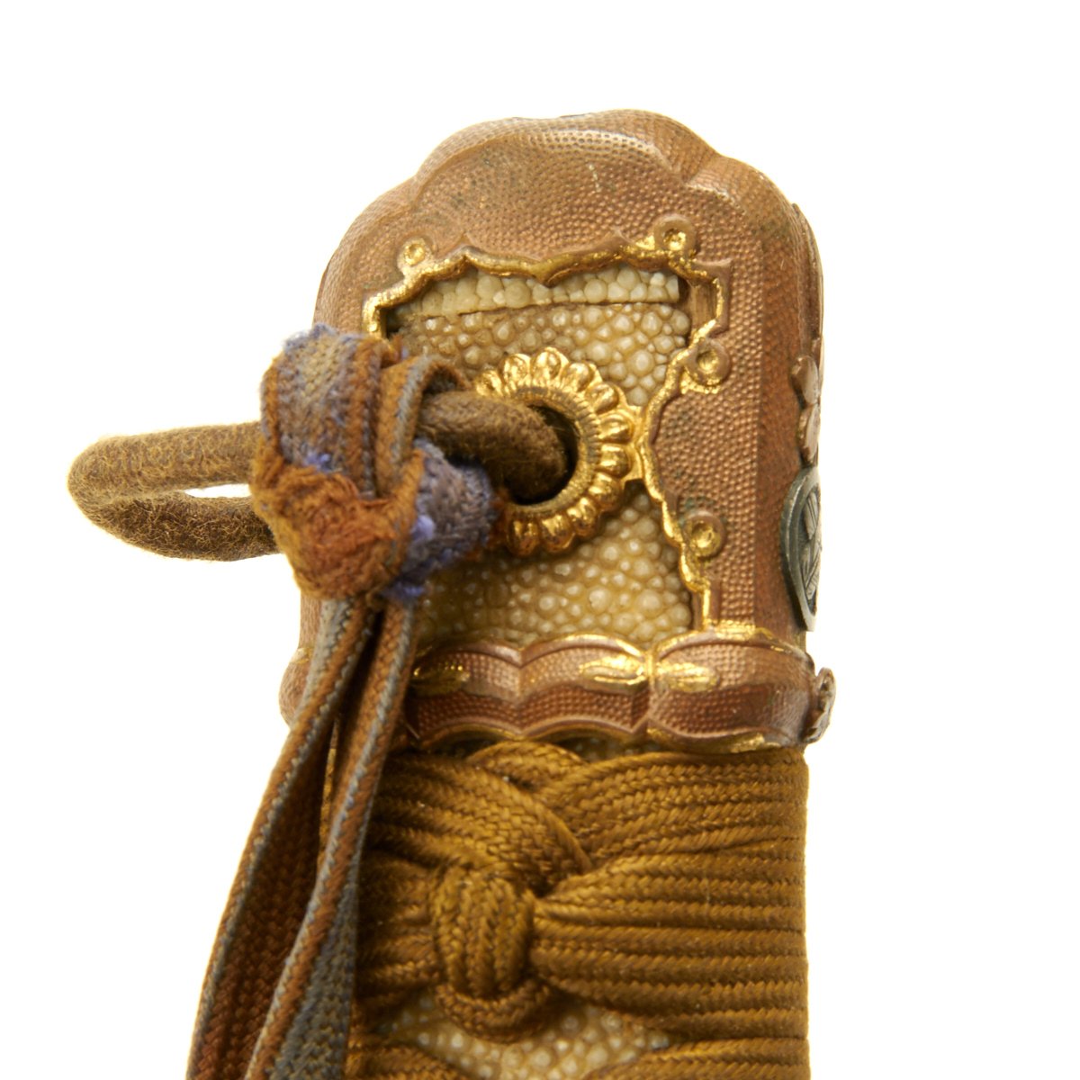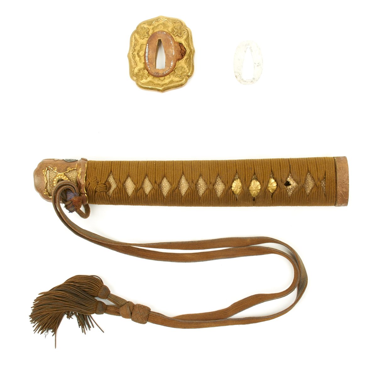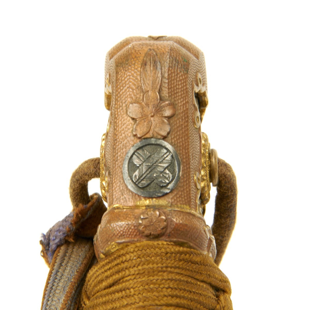 The officer who owned this katana also was from the well-known Asano clan (淺野氏 Asano-shi), whose mon (family crest) is displayed on the upper side of the Kabuto-gane (pommel cap). It is made of blacked brass, and shows two hawk feathers crossed at a right angle. It is bent around the cap and most likely soldered on. The Asano clan was a prominent Japanese clan claiming descent from Minamoto clan, one of the four great clans of feudal Japan. The Asano were the daimyo (feudal lords) of the Hiroshima Domain at the time that the han system was abolished as part of the Meiji Restoration in 1871, and Asano Nagakoto was one of the last Daimyo alive, living until 1937. Although no longer feudal lords, the Asano family became part of the Kazoku (華族, "Magnificent/Exalted lineage"), or Japanese peerage at the level of Marquess (侯爵 kōshaku), and still held significant power.