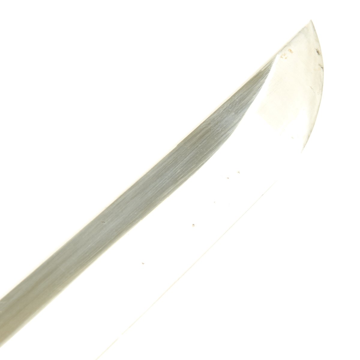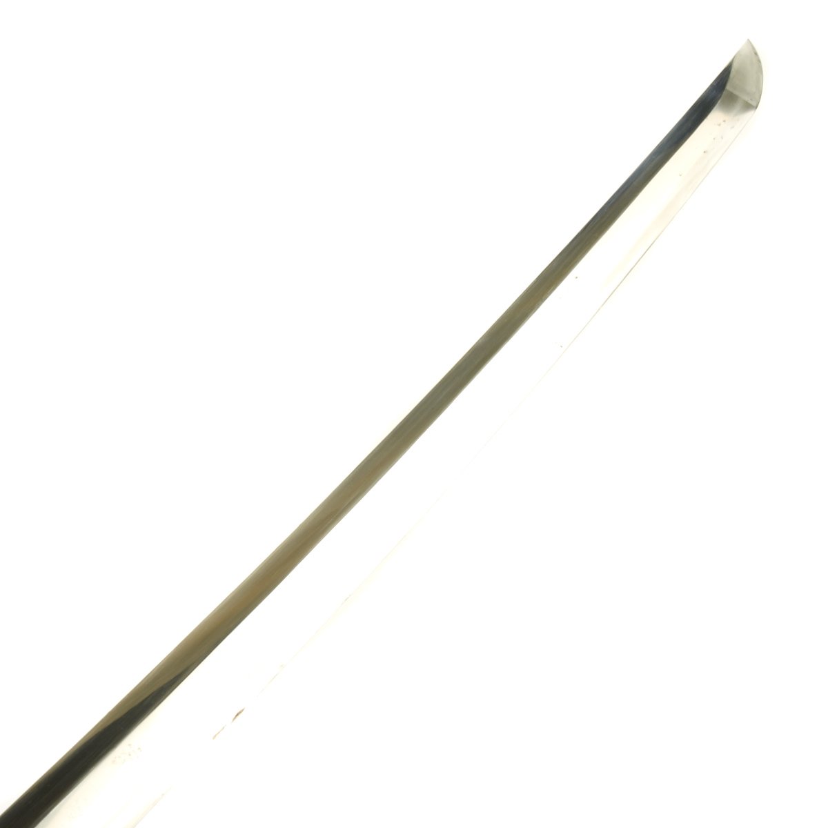 Offered in very good condition with some areas of light staining, it is still sharp and only has a few very tiny nicks on the edge. Overall the polish on the blade is good, with just a bit of staining from oxidation in places. The hamon is completely visible and very attractive. Blade length is approximately 25 1/2" and overall length 36". Handmade blade with signed semi round tang. Grain on blade is visible, along with some blade inclusions typically seen in handmade blades. Blade is in very good condition, with a great Japanese-style polish.
