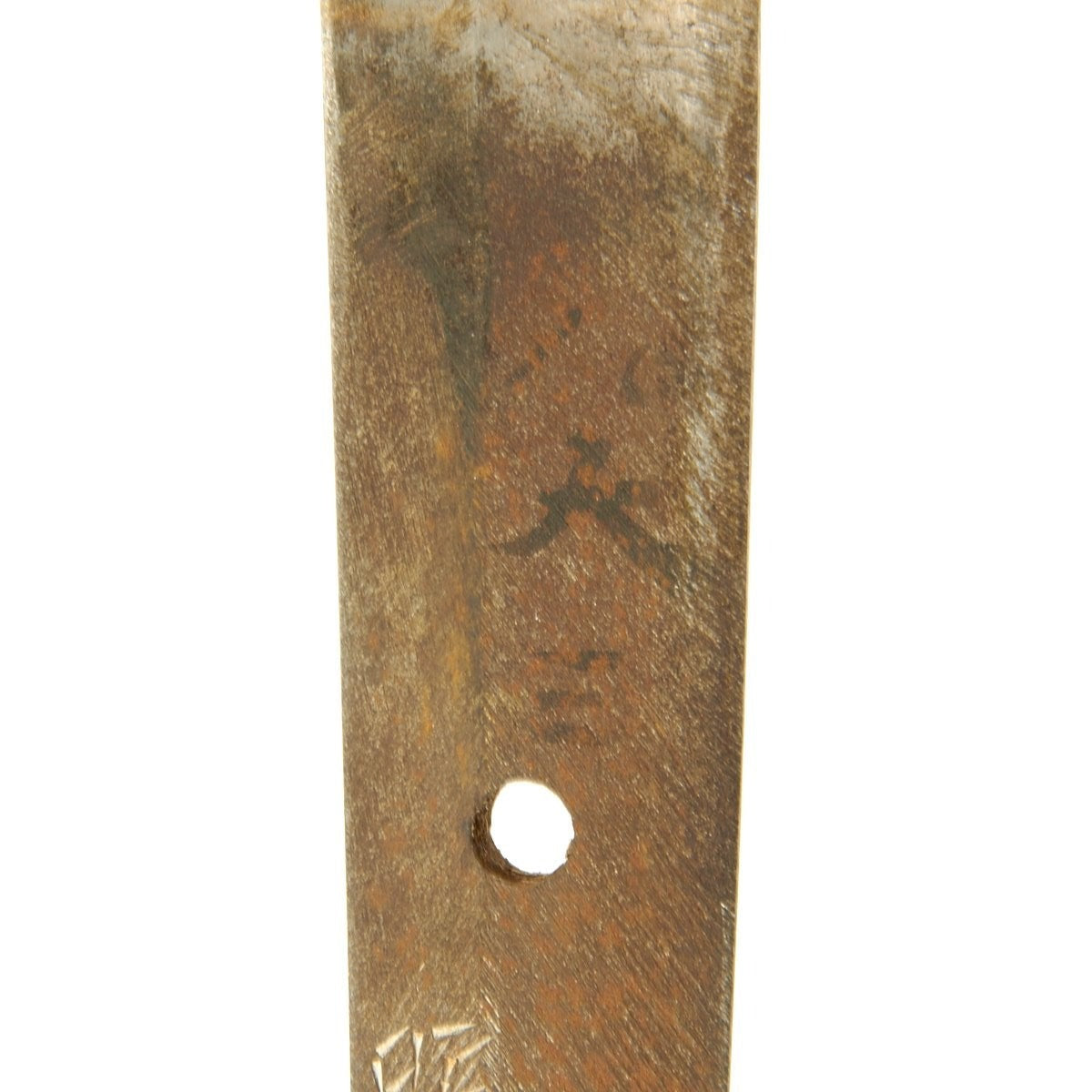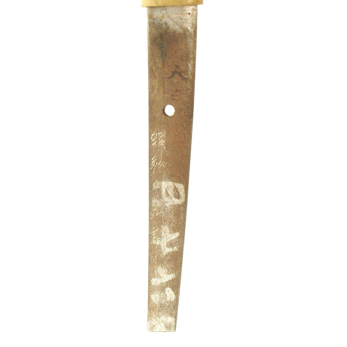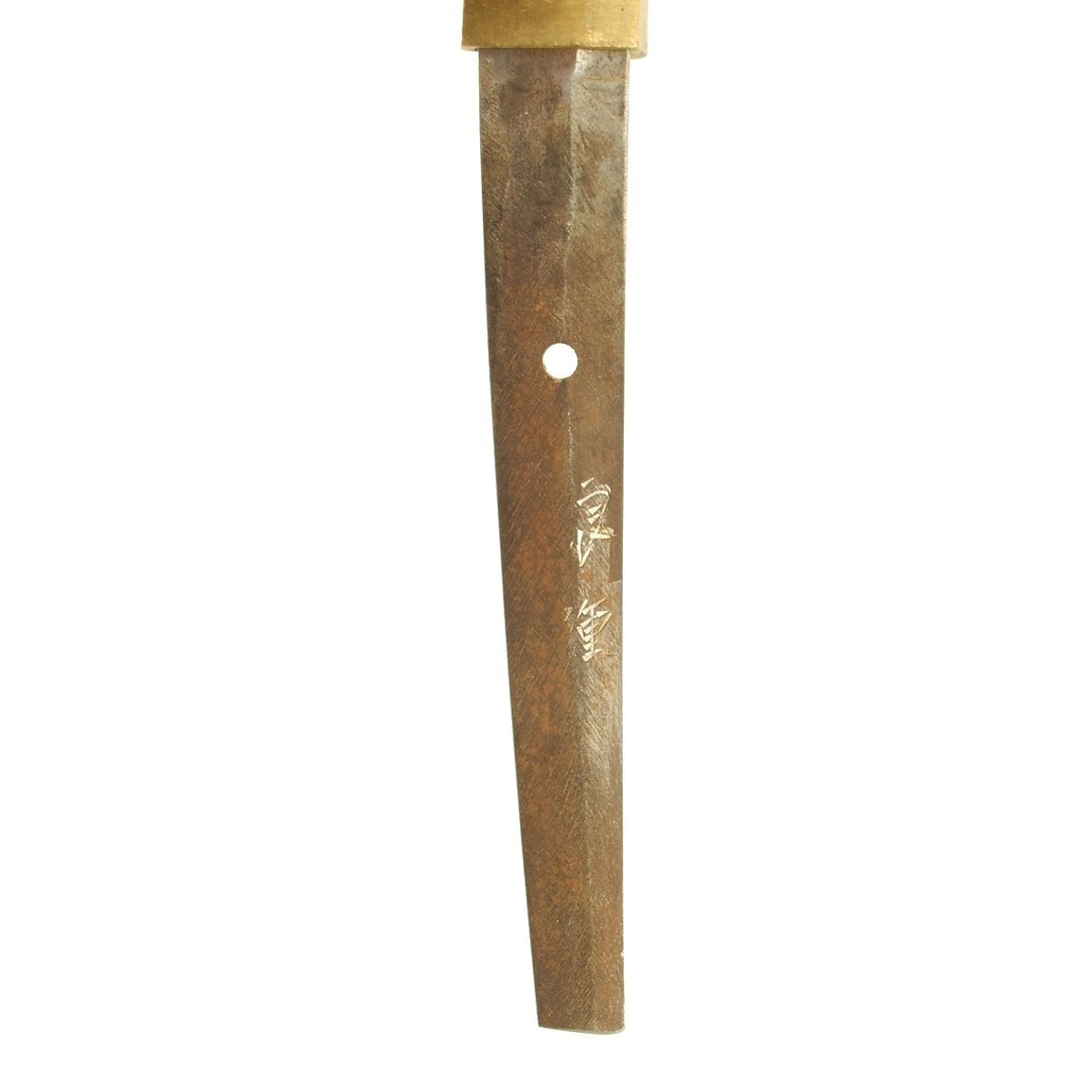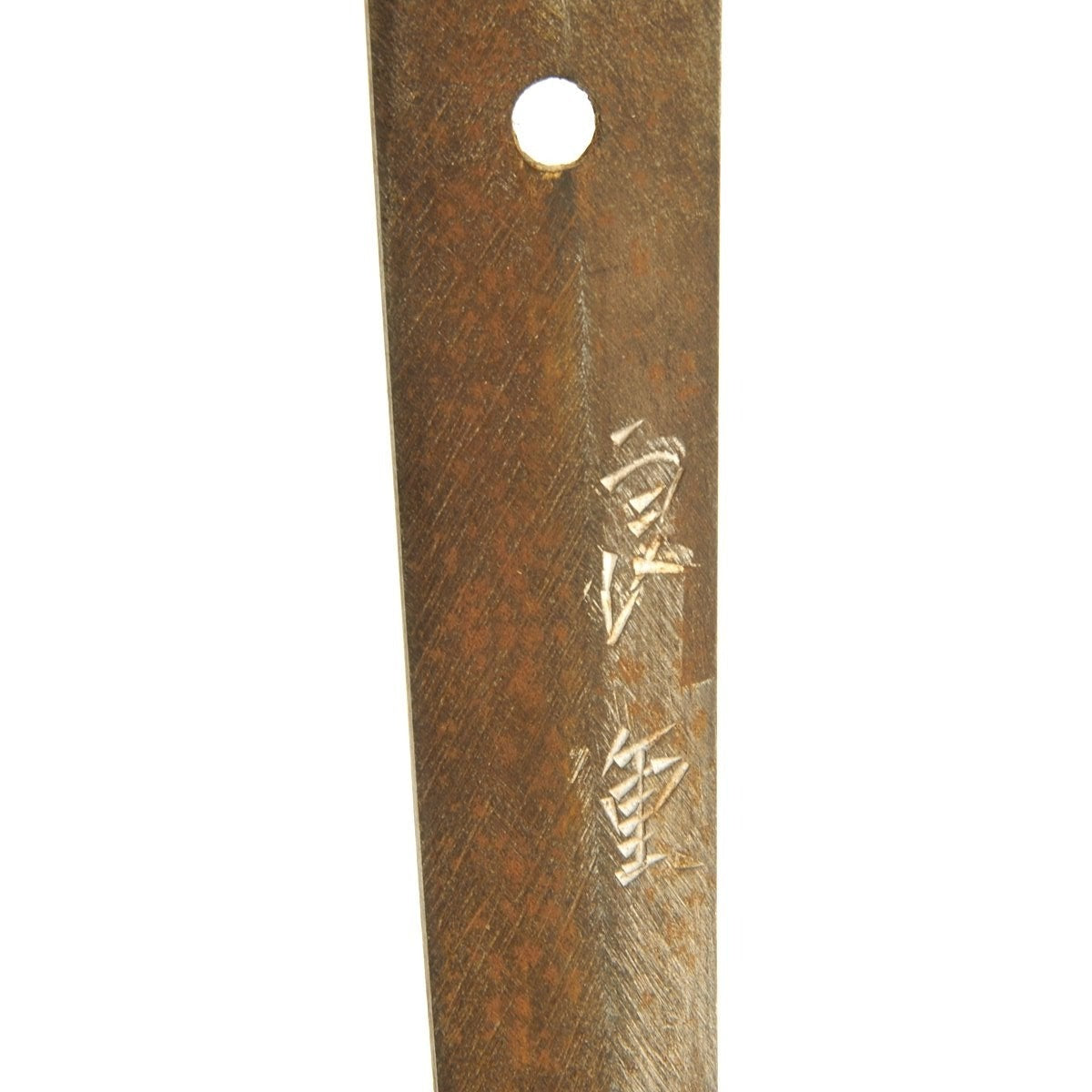 The tang of the blade is signed (Mei) with the characters 良 重, which is read YOSHI SHIGE. This smith's real name was 小見山 良造 - Komiyama Ryozo, and their name appears in the Seki Tanrensho Booklet printed in 1939. Yoshishige was active during the Showa Period and worked at Seki arsenal in Gifu, Mino Province (美濃国), and look to have made both arsenal forged and traditional blades. We have confirmed the signature with other examples of his work.