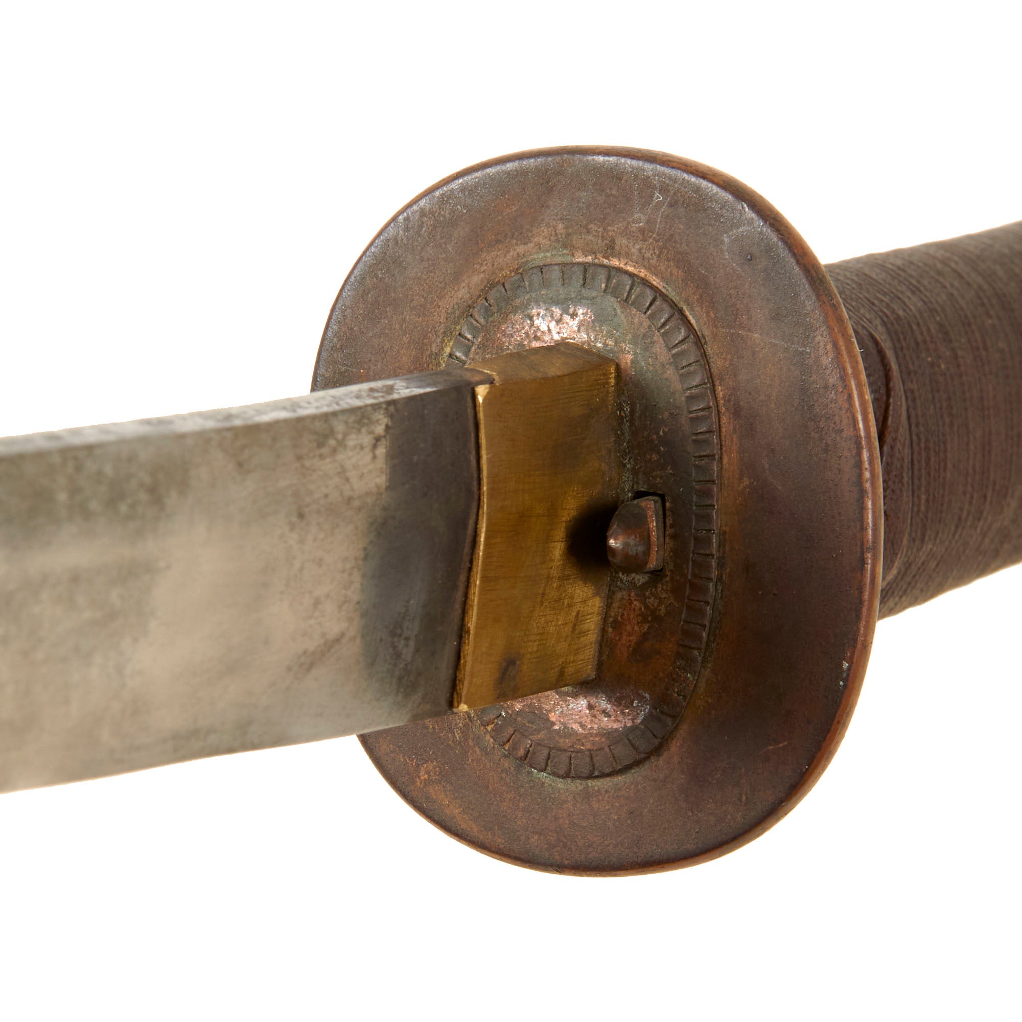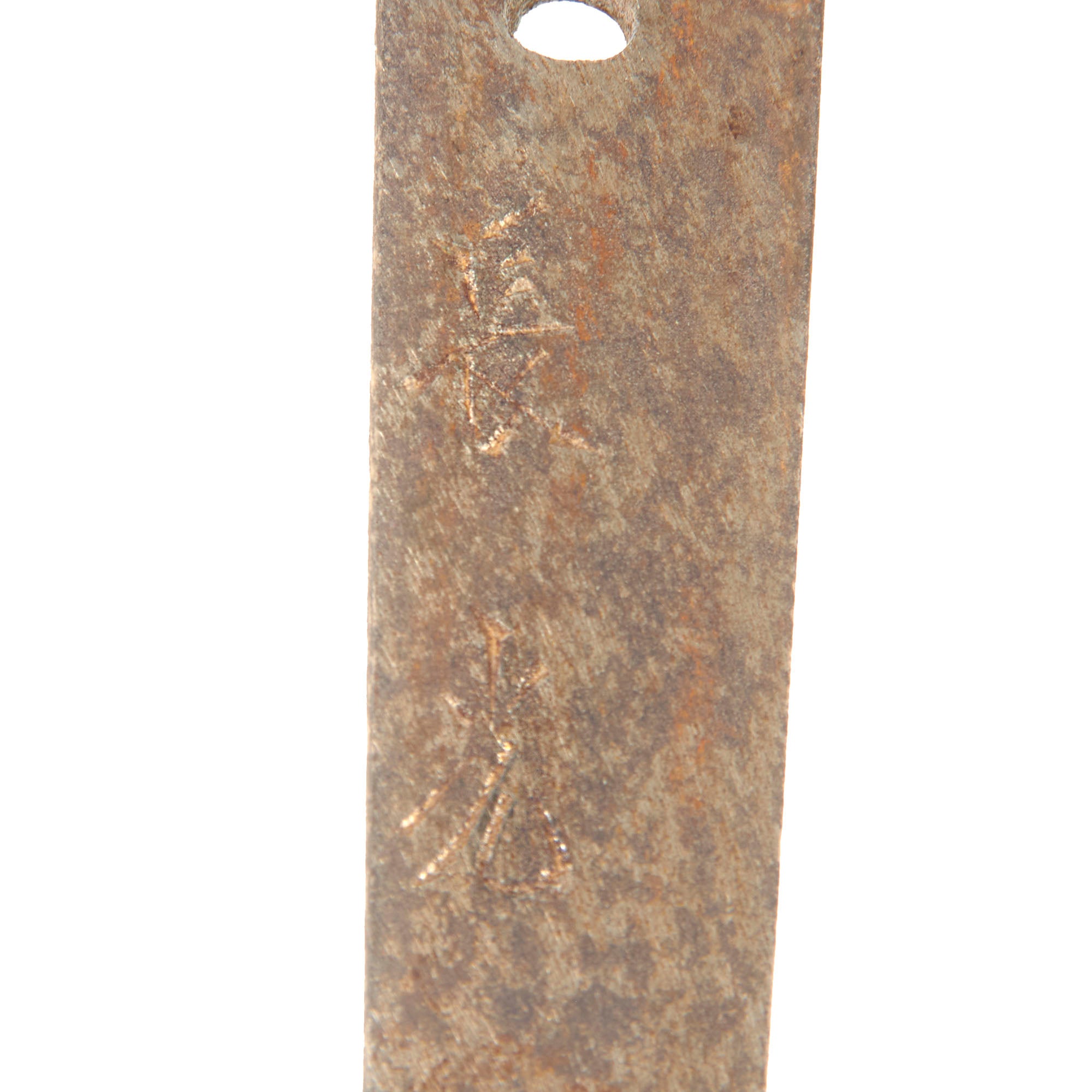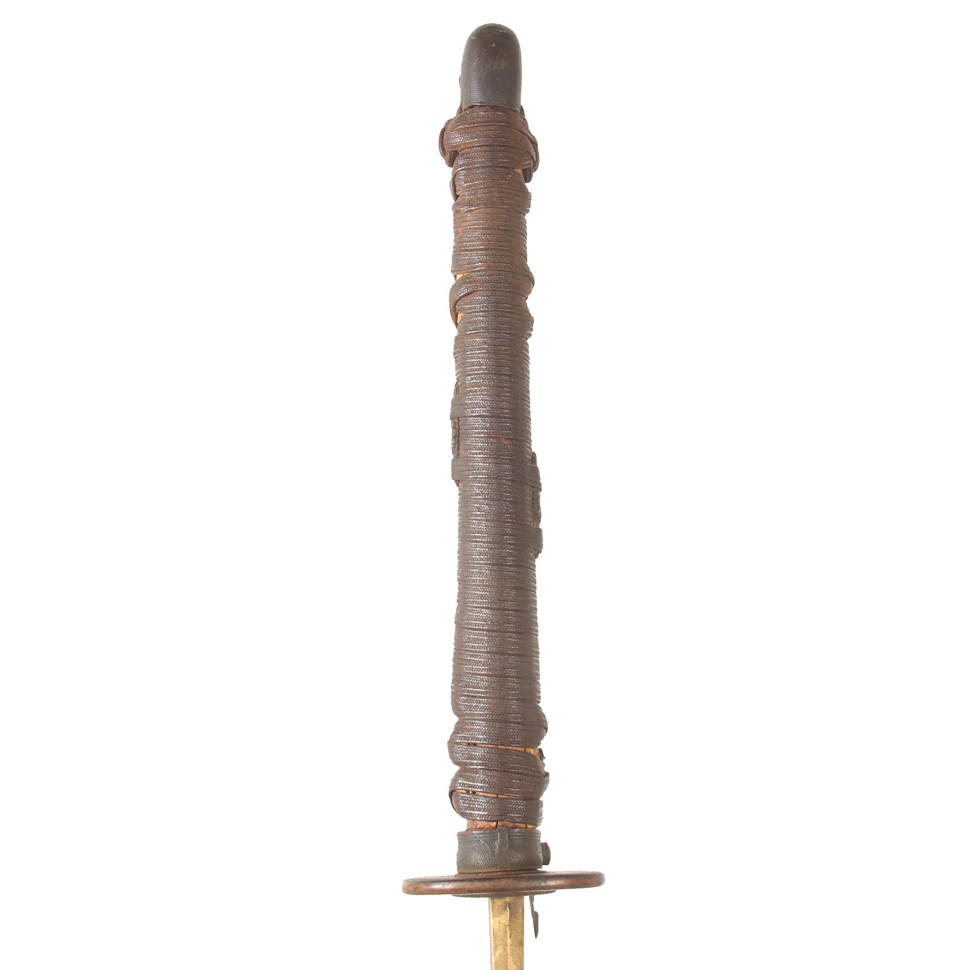 The katana itself measures 37 ⅜ inches overall, with a 26 inch arsenal-made blade. The blade would originally have been polished bright with a faux hamon, however it now displays a stained patina overall, with signs of use and cleaning, some of which looks to have been done with a buffer, probably to "clean it up" after it sat uncared for. There is no evidence of lamination lines or other evidence that it is a traditionally made blade. The edge is relatively dull, and there are some nicks in the edge from use. The tang of the blade (nakago) is the typical futsu (普通 normal) shape of the period, with a Haagari (asymmetrical rounded) nakago-jiri (tang tip), with the usual file marks (yasuri-me), which help the tang stay secure in the handle. The two hole tang is also typical of this period's arsenal forged blades.