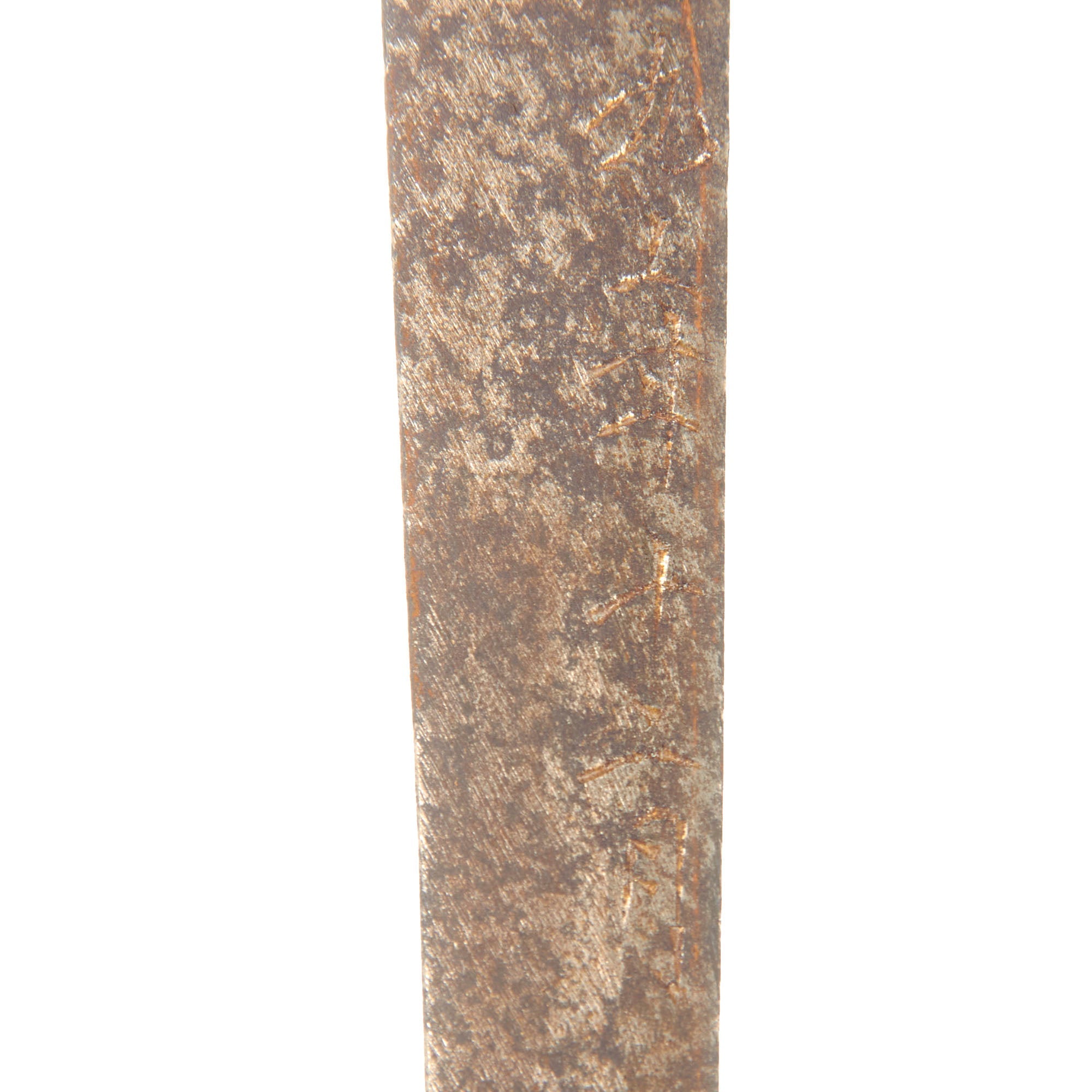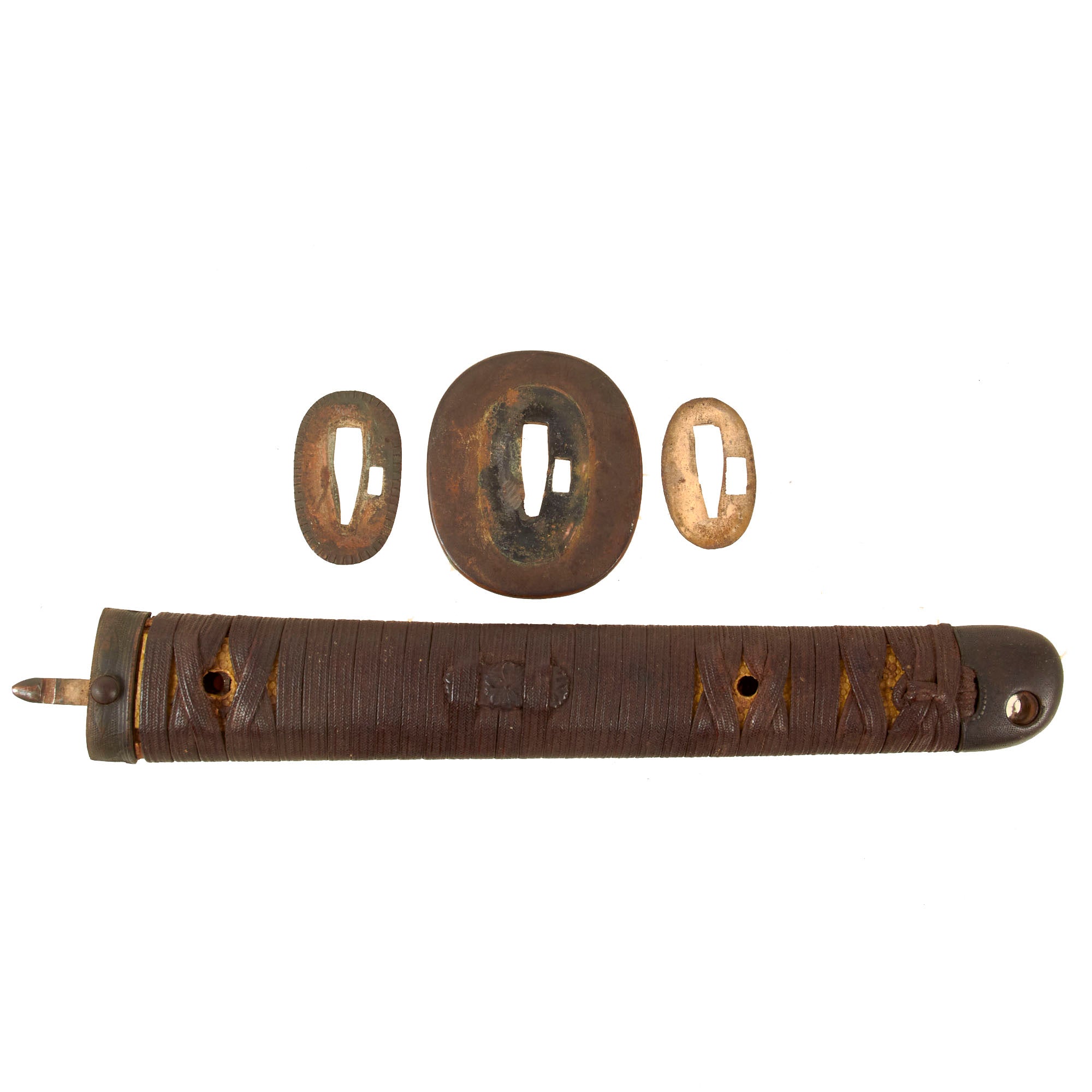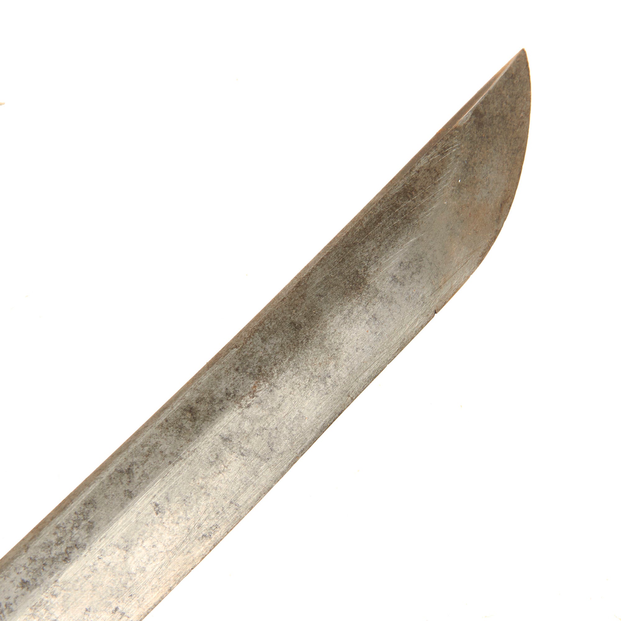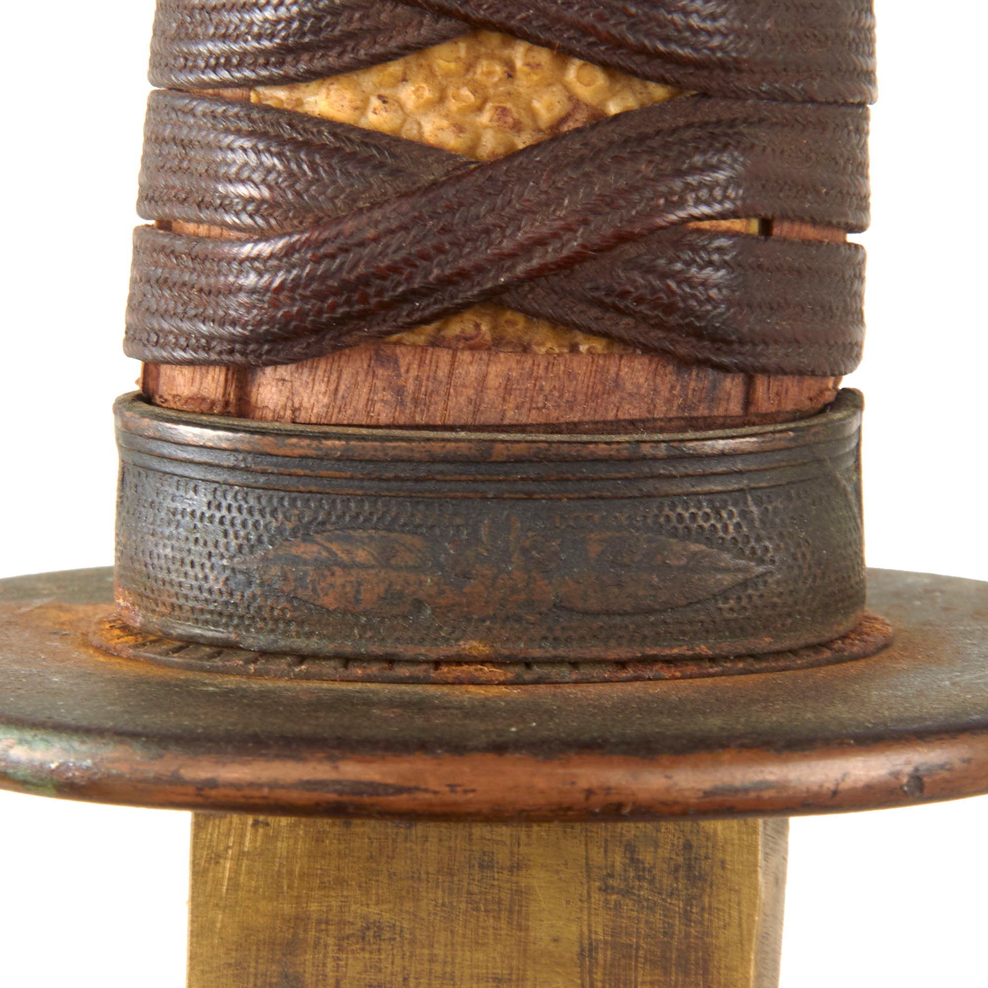 The katana itself measures 37 ⅜ inches overall, with a 26 inch arsenal-made blade. The blade would originally have been polished bright with a faux hamon, however it now displays a stained patina overall, with signs of use and cleaning, some of which looks to have been done with a buffer, probably to "clean it up" after it sat uncared for. There is no evidence of lamination lines or other evidence that it is a traditionally made blade. The edge is relatively dull, and there are some nicks in the edge from use. The tang of the blade (nakago) is the typical futsu (普通 normal) shape of the period, with a Haagari (asymmetrical rounded) nakago-jiri (tang tip), with the usual file marks (yasuri-me), which help the tang stay secure in the handle. The two hole tang is also typical of this period's arsenal forged blades.