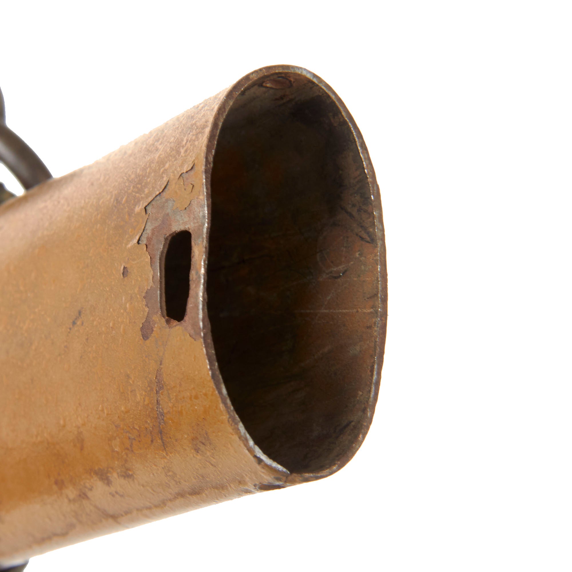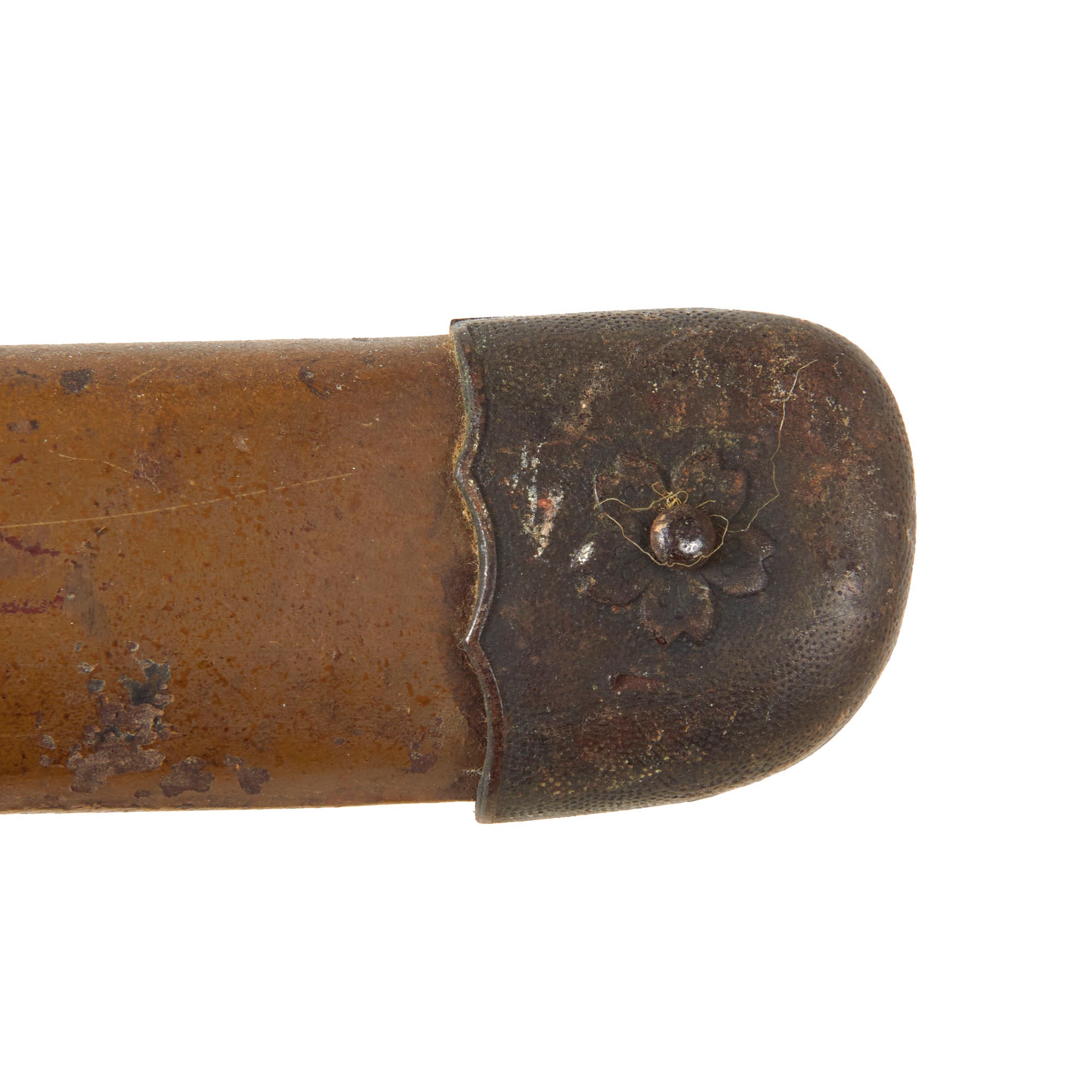 The scabbard for this katana is very good condition, with the correct original light brown lightly textured paint and late war blacked steel fittings. It is the correct 1944 pattern style, however it unfortunately is missing the top throat fitting, as well as all of the internals. It does however still have the notch for the scabbard lock, so it will loosely hold onto the hilt.