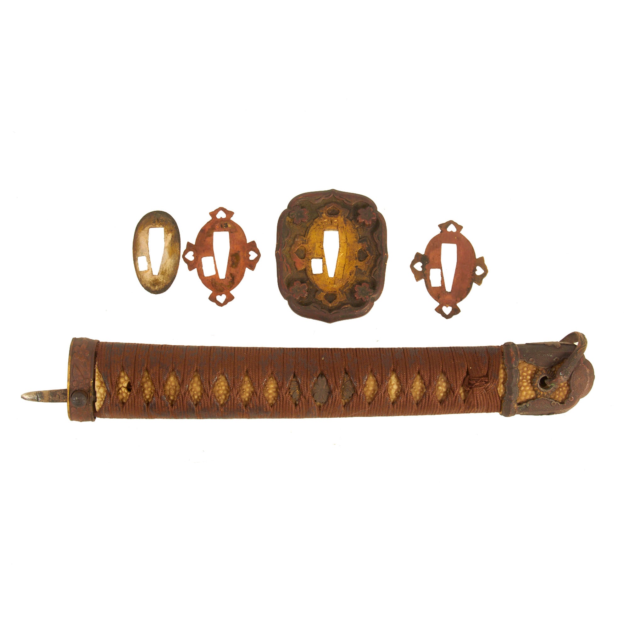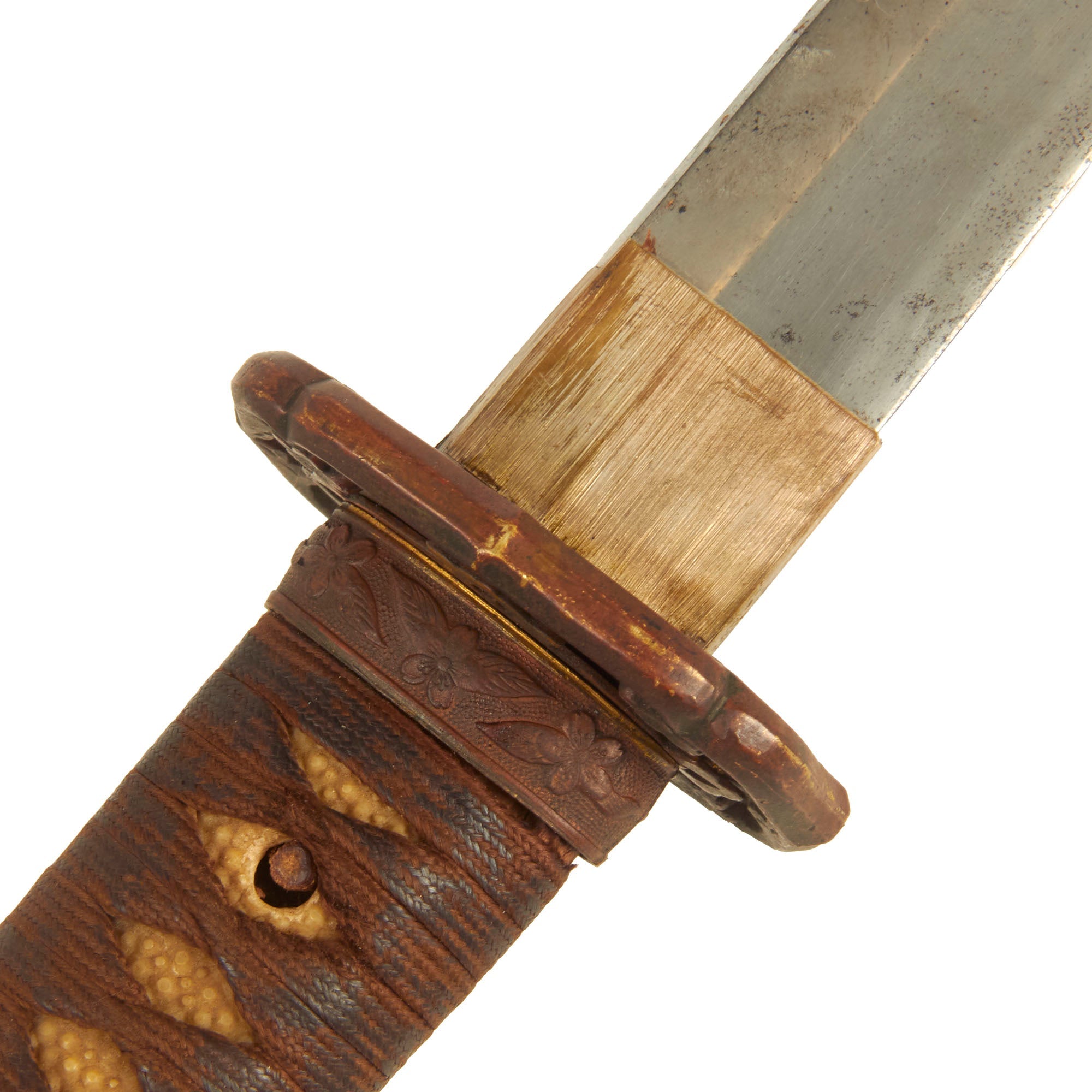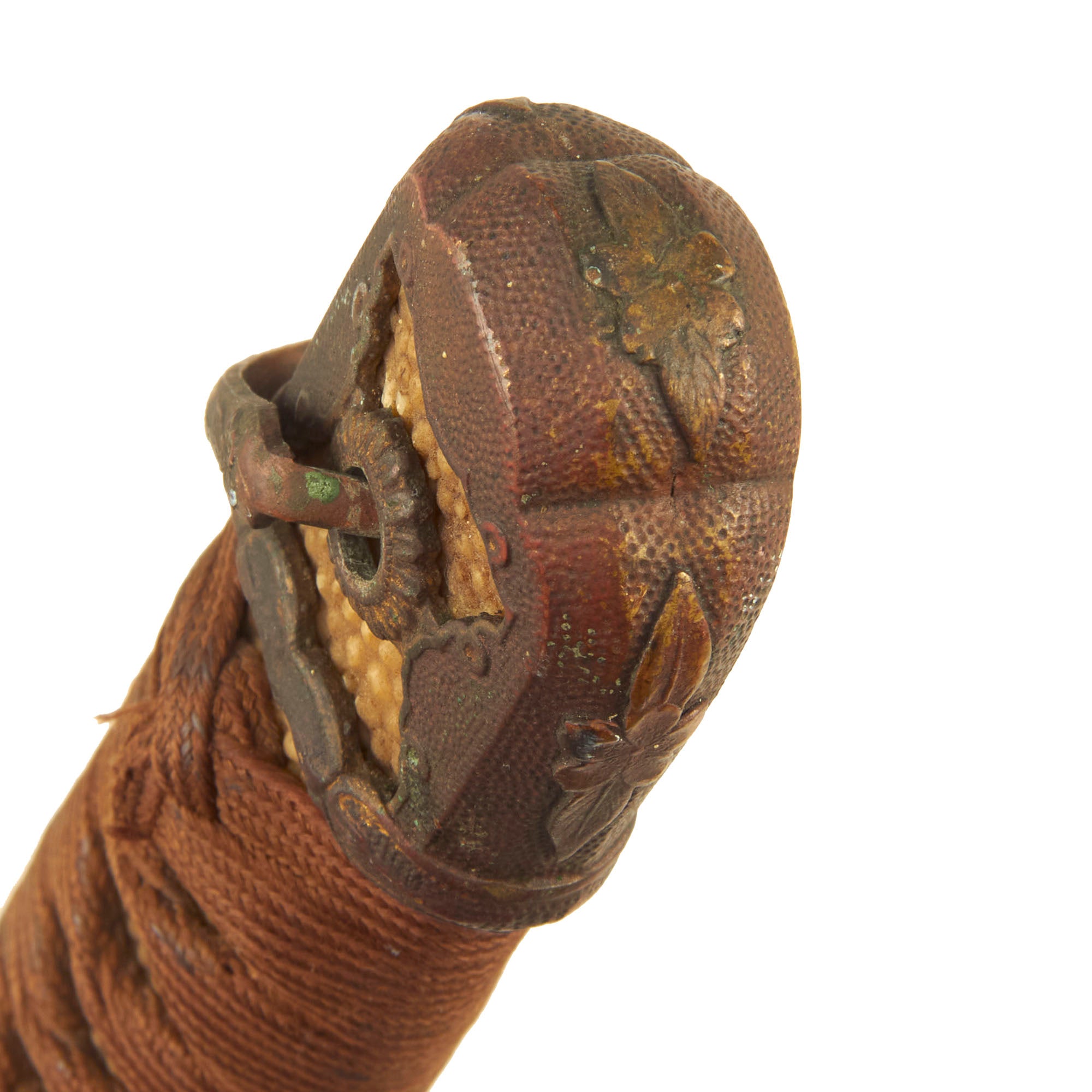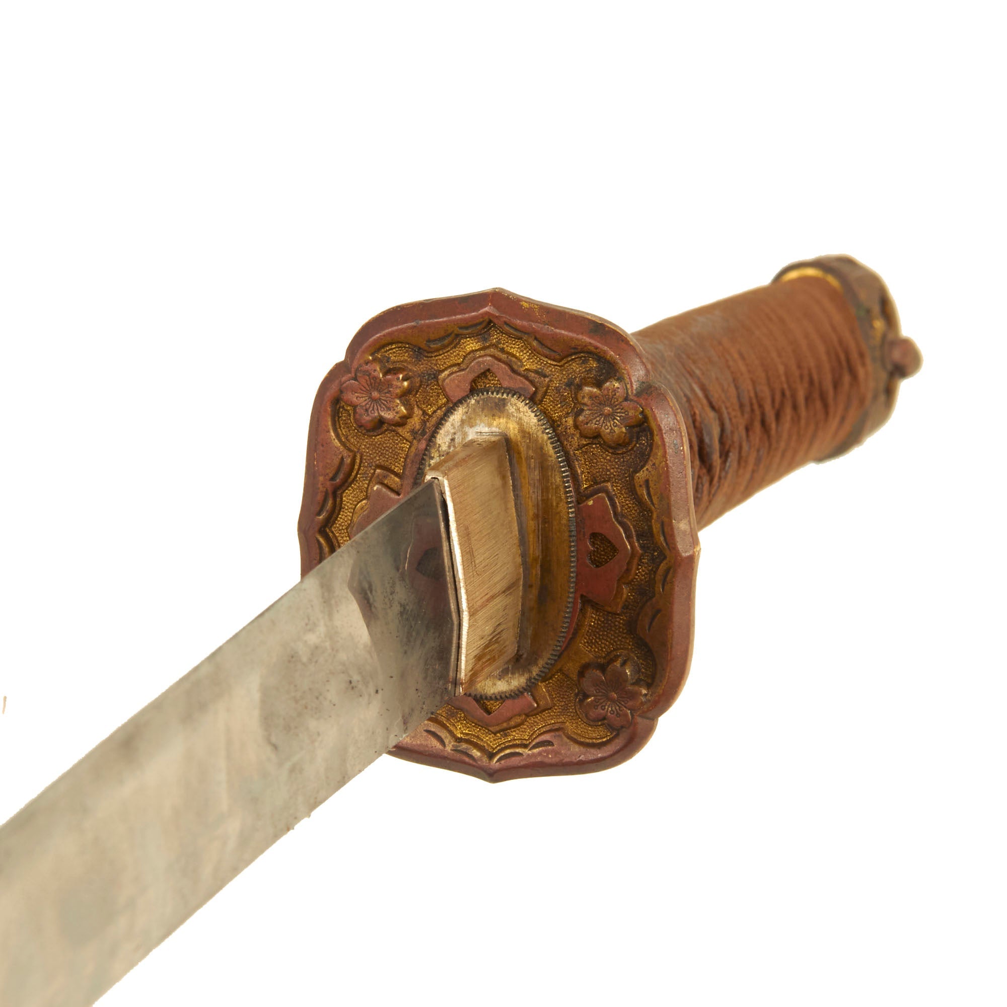 The blade mountings are the classic later WWII era Type 98 Army Shin-Gunto style, brass with gilt accents, featuring a rounded "quince" shaped (mokko gata) tsuba (cross guard). The tsuka (handle) has brass Imperial Army cherry blossom menuki (grip decorations), and a nice Kabuto-Gane (Pommel Cap), which has an embossed brass loop still present. The cross guard and pommel cap have matching cherry blossom motifs, which are also found on the scabbard fittings, and the fuchi (grip collar). There are 3 Seppa (spacers) around the cross guard to keep the fit tight. The tsuba and seppa are all inlet for the scabbard lock, which is still present and fully functional.