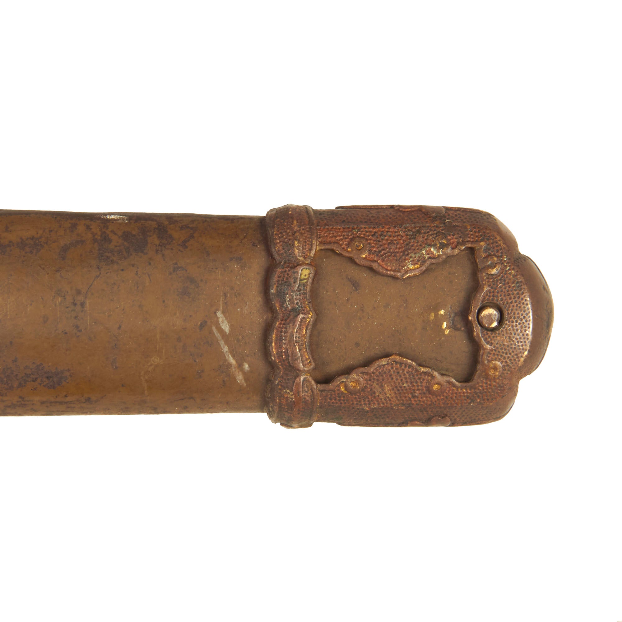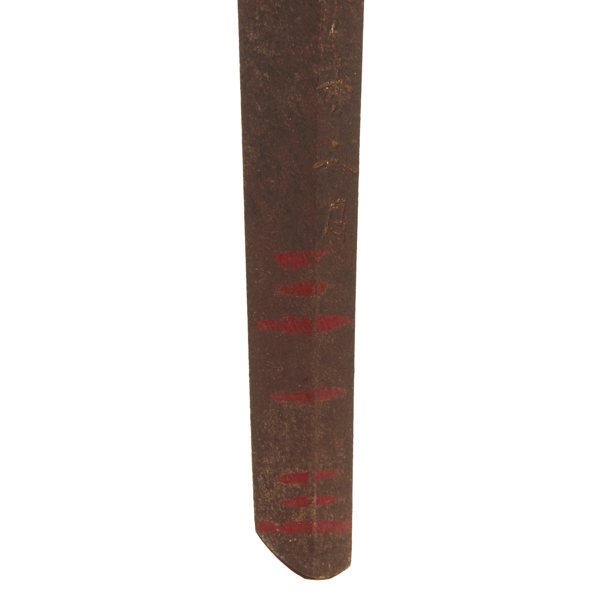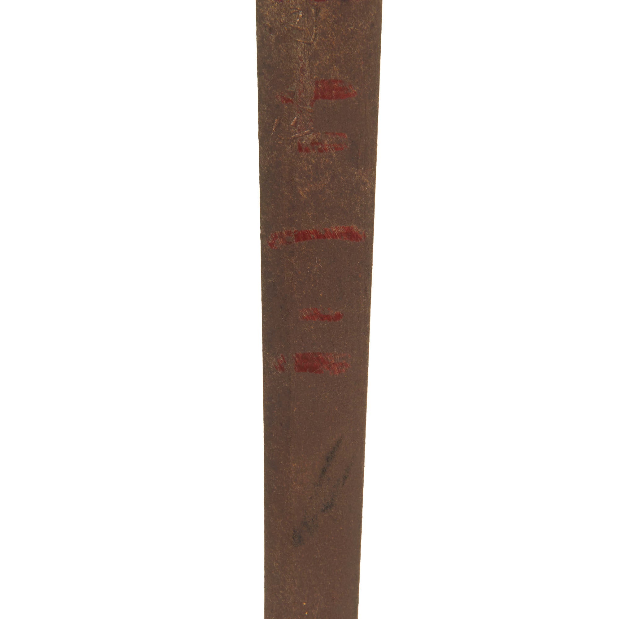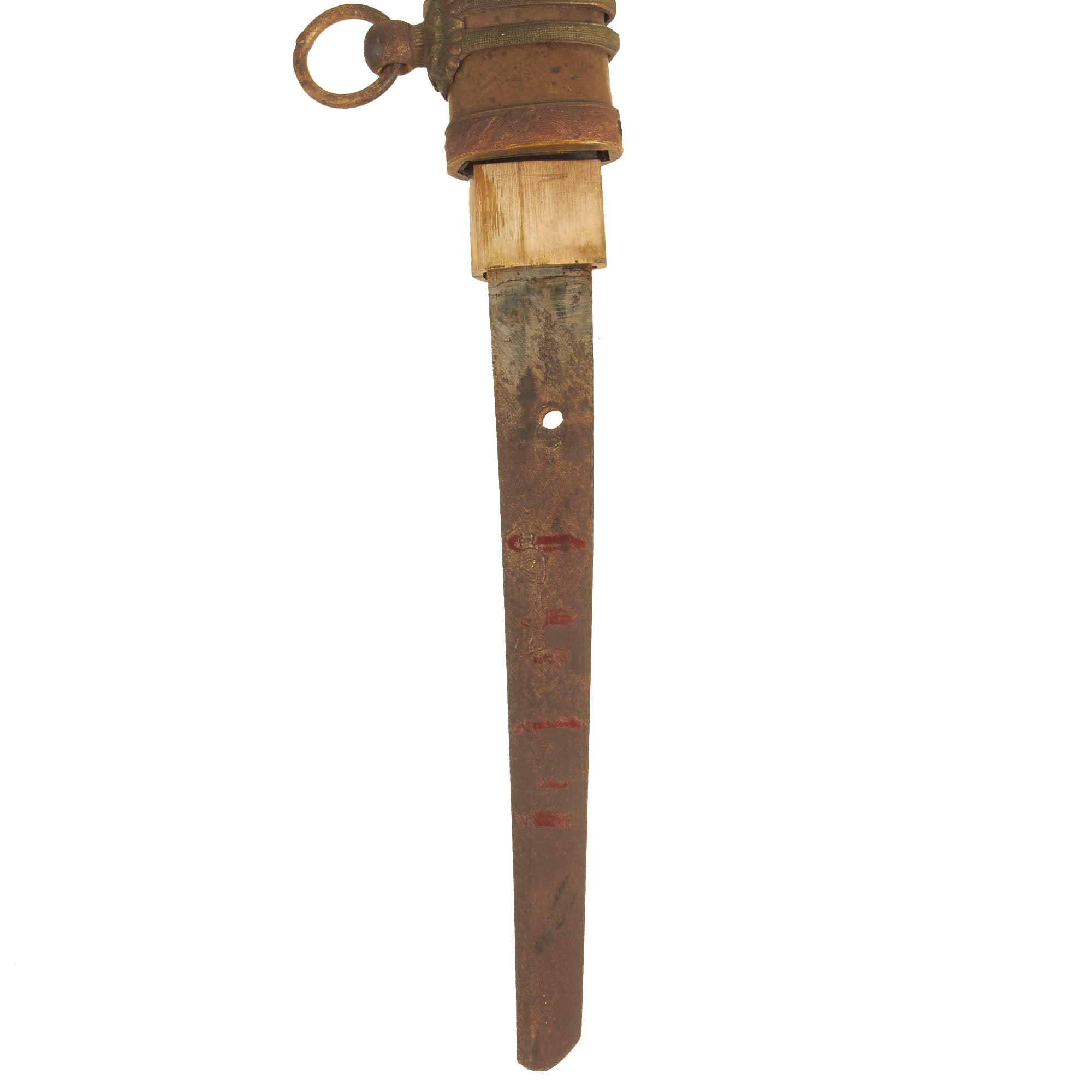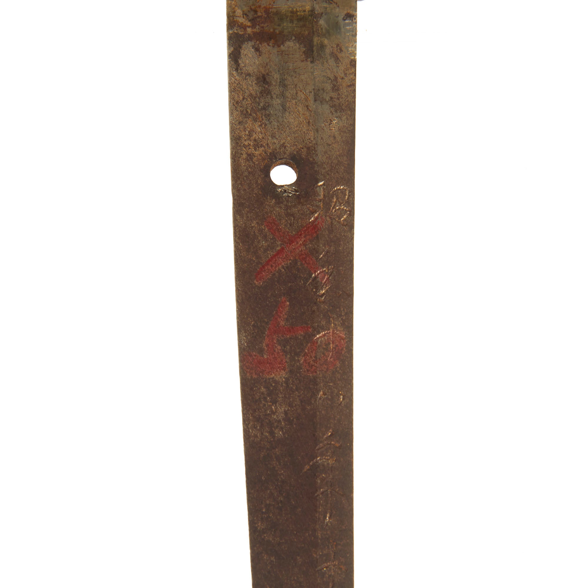 The Scabbard (saya) is steel over wood, and in very good condition, with most of the original paint intact. It does however show denting and wear from service, so there is definitely a bit of paint missing. It has the correct single hanger loop of the Type 98 style, and the top fitting is inlet for the scabbard lock on the hilt, which still works great. The two brass screws for the top fitting (koiguchi) are missing.