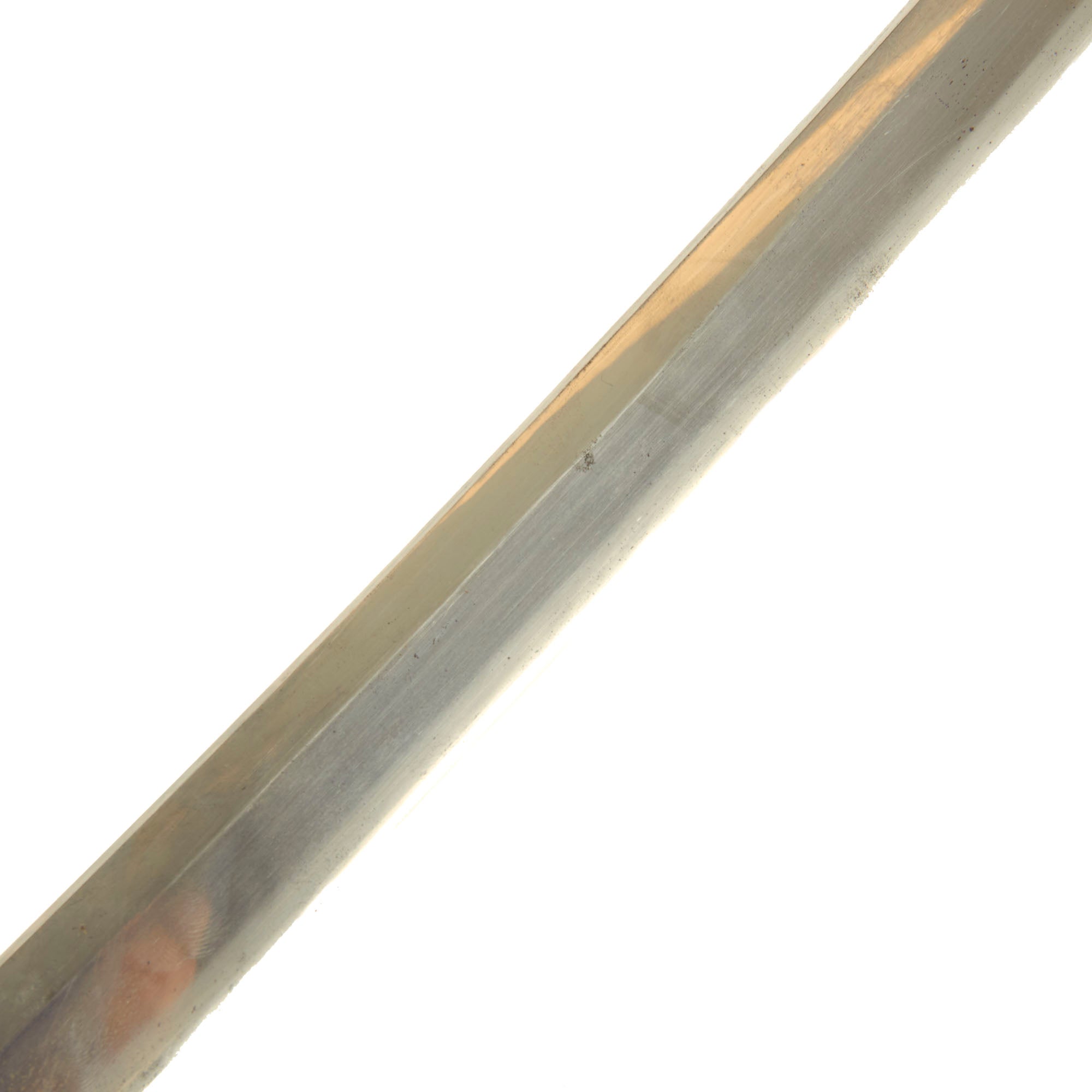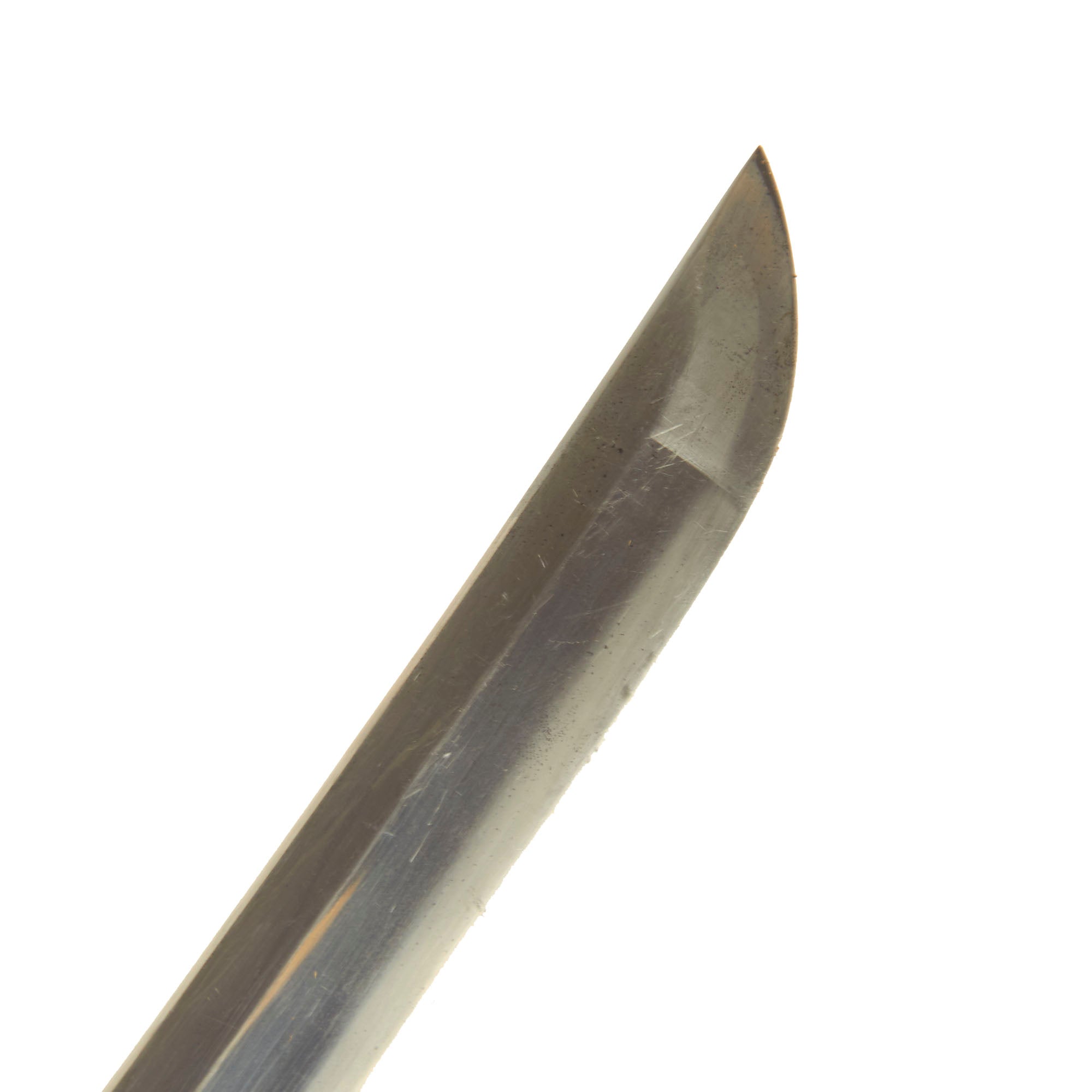 Offered in very good condition, the blade is still relatively sharp and looks great. The polish is in very good condition, and the aspects of the hamon are still easy to see. There are some light scuffs and a few areas of minor oxidation staining. Edge still quite sharp, with a about 3 minor edge bends around the center of the blade. There is also some overall minor edge wear from use on the last third of the blade, which is not as sharp as the other 2/3 of the blade. Blade length is approximately 26 1/4 inches and overall length of 37 1/2 inches. The katana has a handmade blade with a Futsu 普通 (regular) Nakago (tang) with an Haagari (asymmetrically rounded) nakago-jiri.
