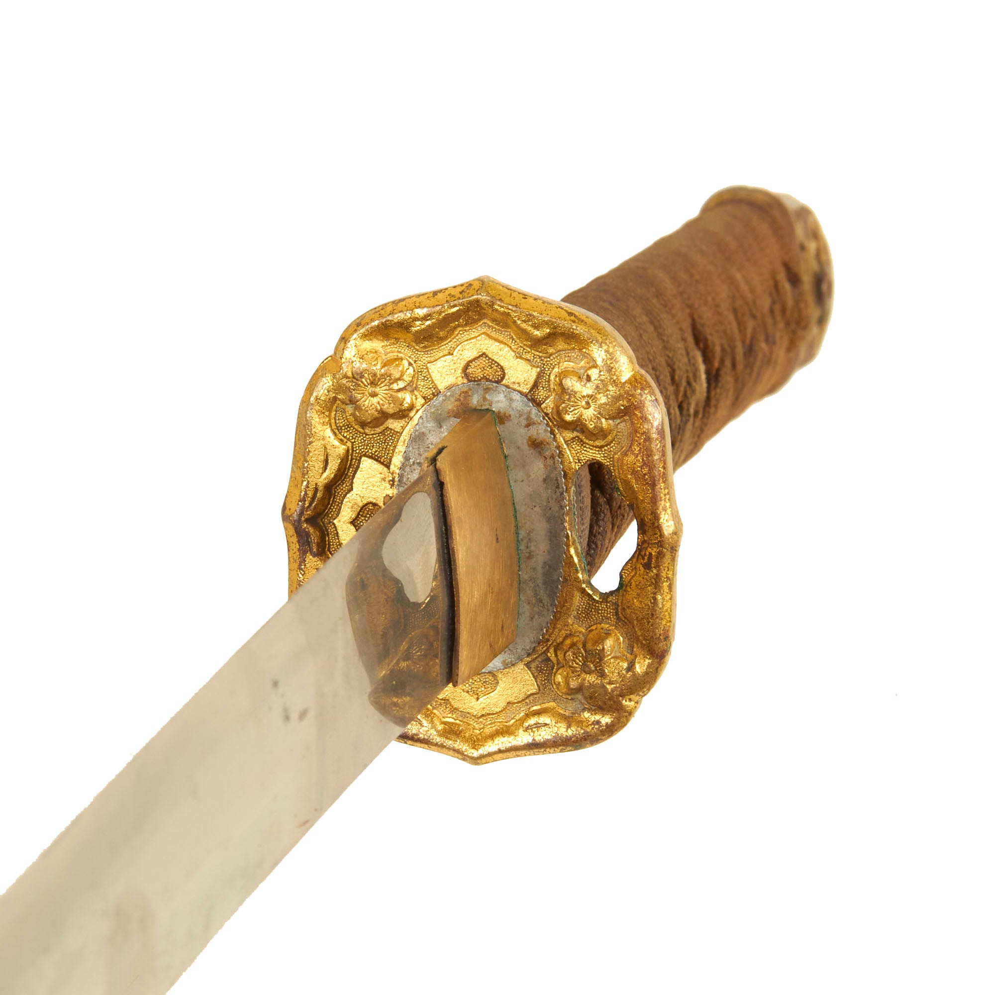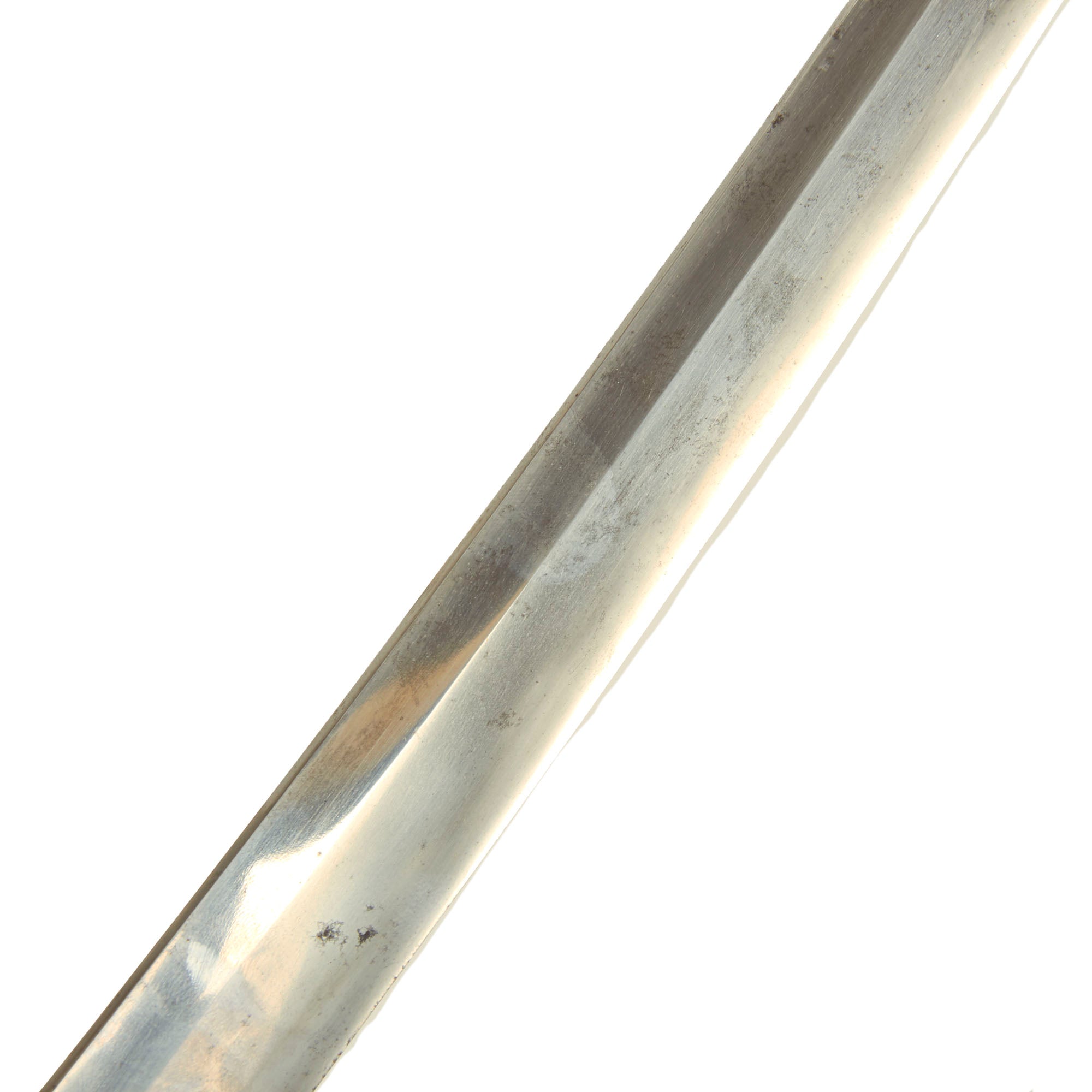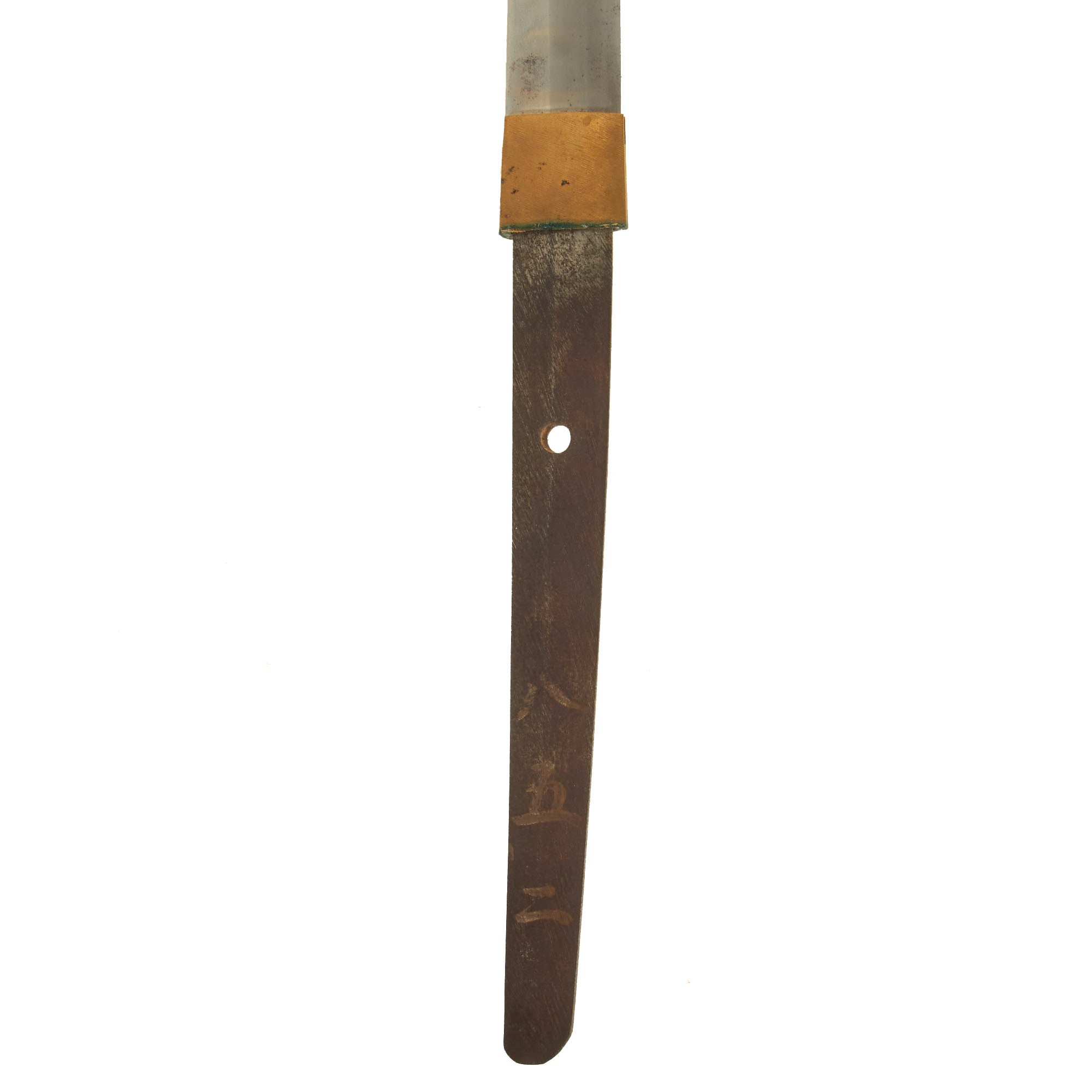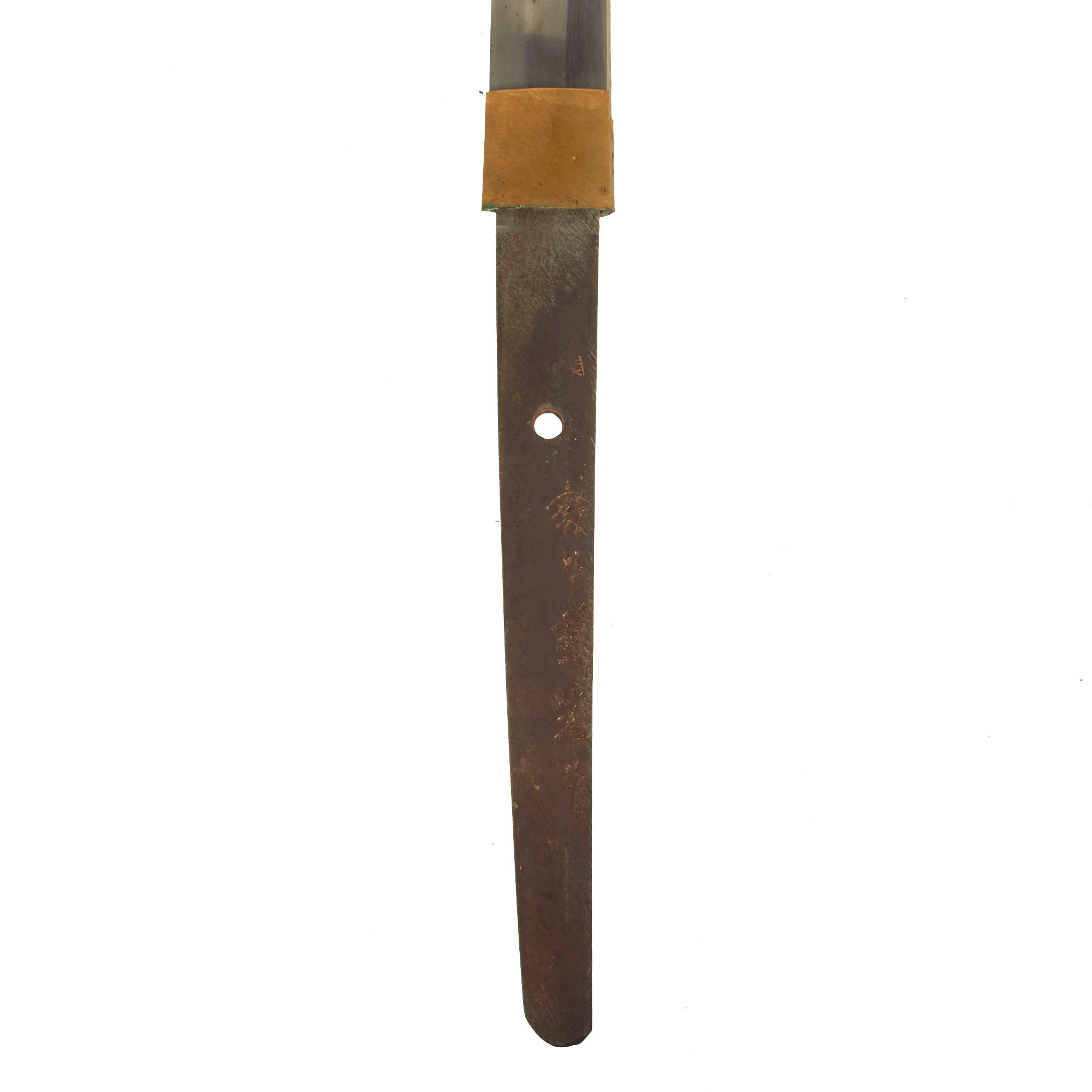 Offered in very good condition, the blade is still quite sharp, so please handle with care. It does look like at some point portions of the blade did suffer oxidation damage, which was then polished out, possibly using uchiko ball powder. This has made the aspects of the blade difficult to see in some areas, particularly near the tip of the blade. There is still some deeper oxidation peppering visible on the surface in areas. The rest of the blade however still has the polish in good condition, so the aspects of the blade can be appreciated. Blade length is approximately 24 inches and overall length of 35 1/4 inches. The katana has a handmade blade with a Futsu 普通 (regular) Nakago (tang) with an Haagari (asymmetrically rounded) nakago-jiri.