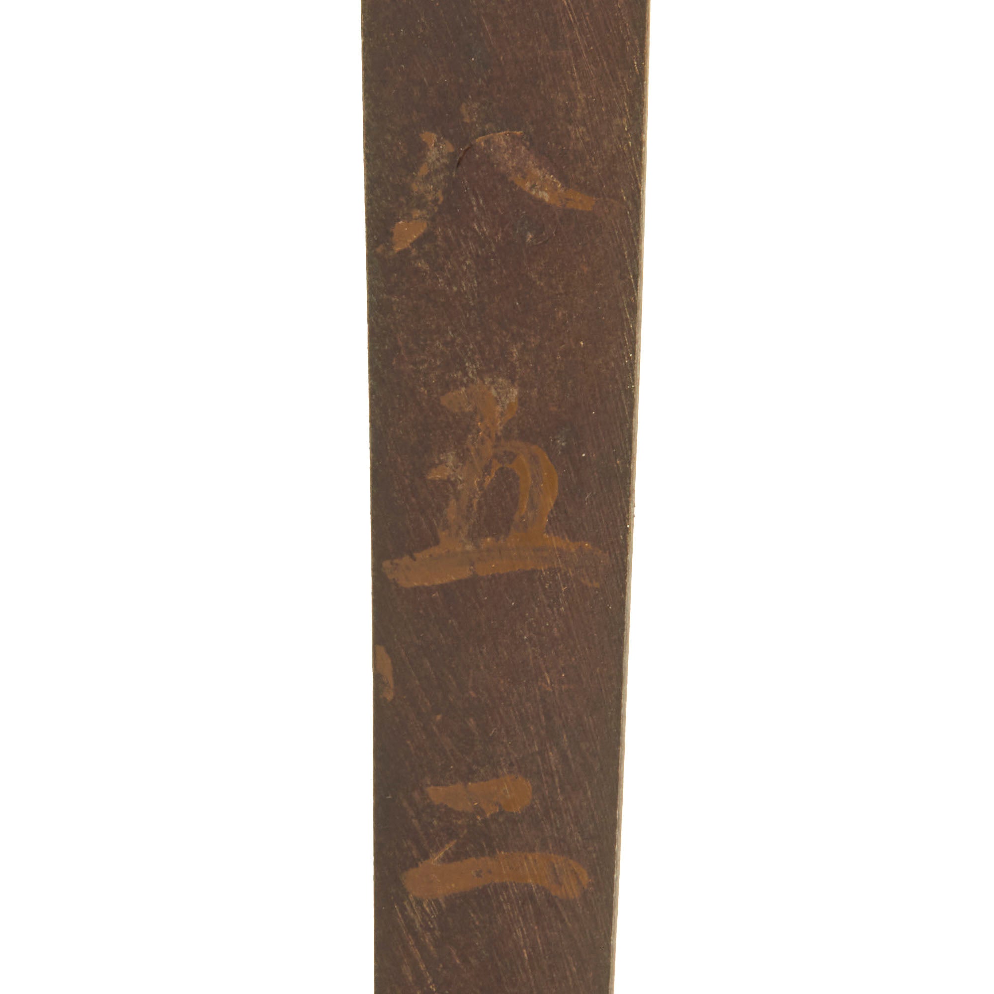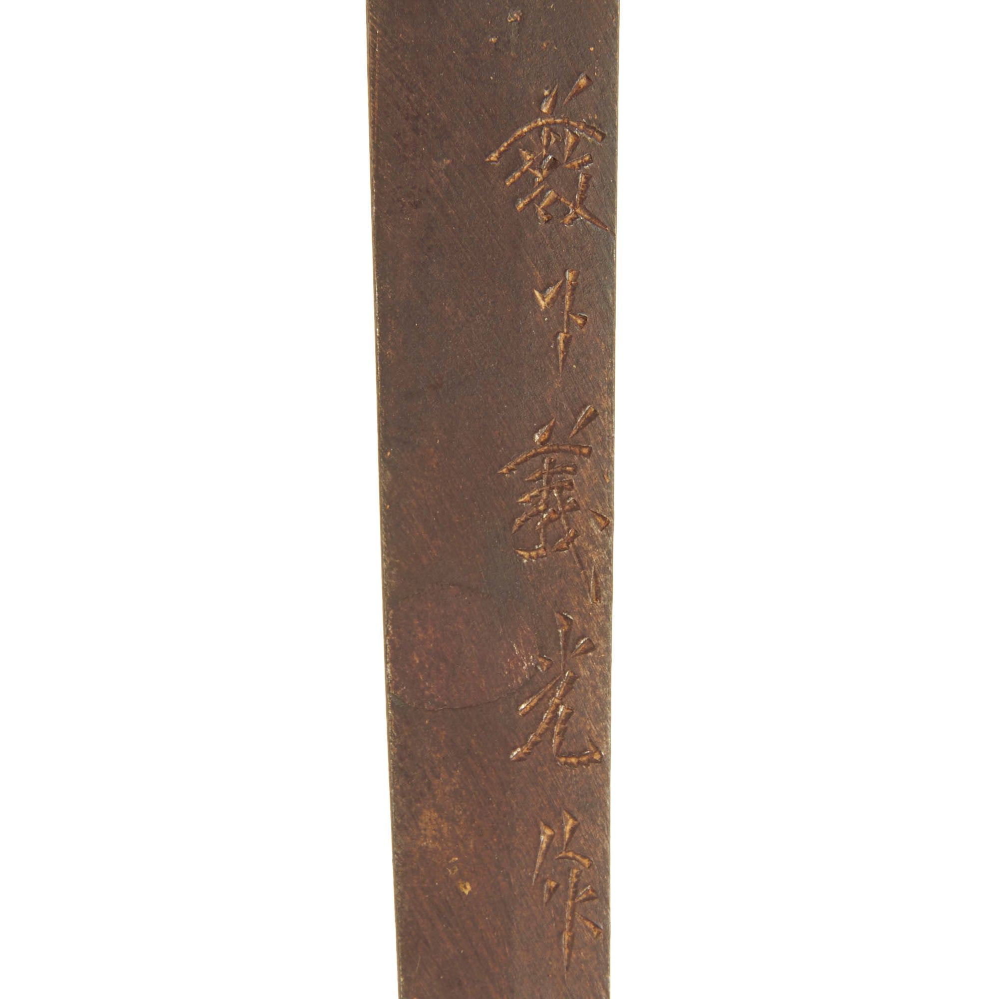 The blade on this example was hand forged in the traditional manner, and the tang of the blade is signed (Mei) with the characters 藪 下 義 光 作 - YABUSHITA YOSHIMITSU SAKU, or "YABUSHITA YOSHIMITSU made this". Research indicates that this smith's real name was 藪下 不二夫 (Yabashita Fujio), so in this case "Yabashita" was their family name, and "Yoshimitsu" their "swordsmith name." We have seen many other smiths sign their swords in this fashion. Their name appears in the Seki Tanrensho Booklet printed in 1939. Yoshimitsu was active during the Showa Period and worked at Seki arsenal in Gifu, Mino Province (美濃国), and is stamped 関 (SEKI) on the tang. They look to have made both arsenal forged and traditional blades. We have confirmed the signature (Oshigata) with other examples of his work.