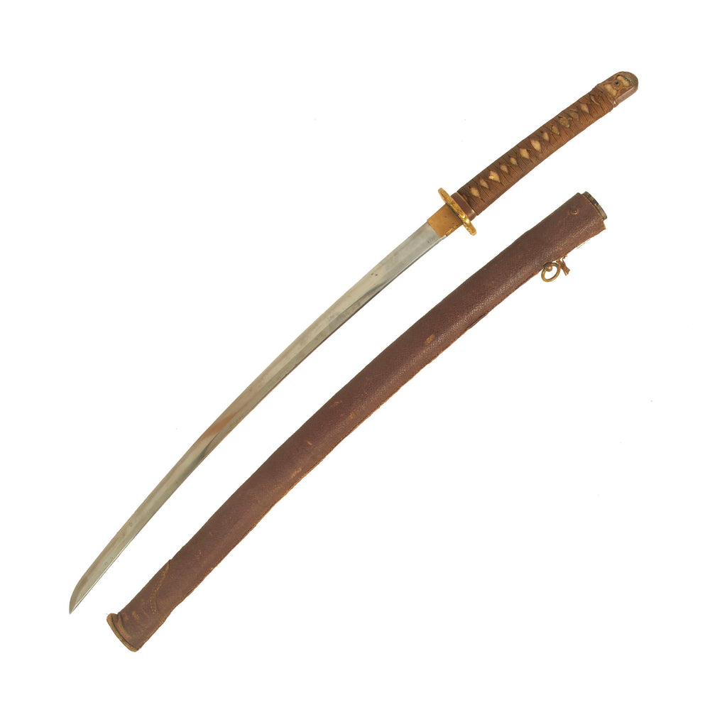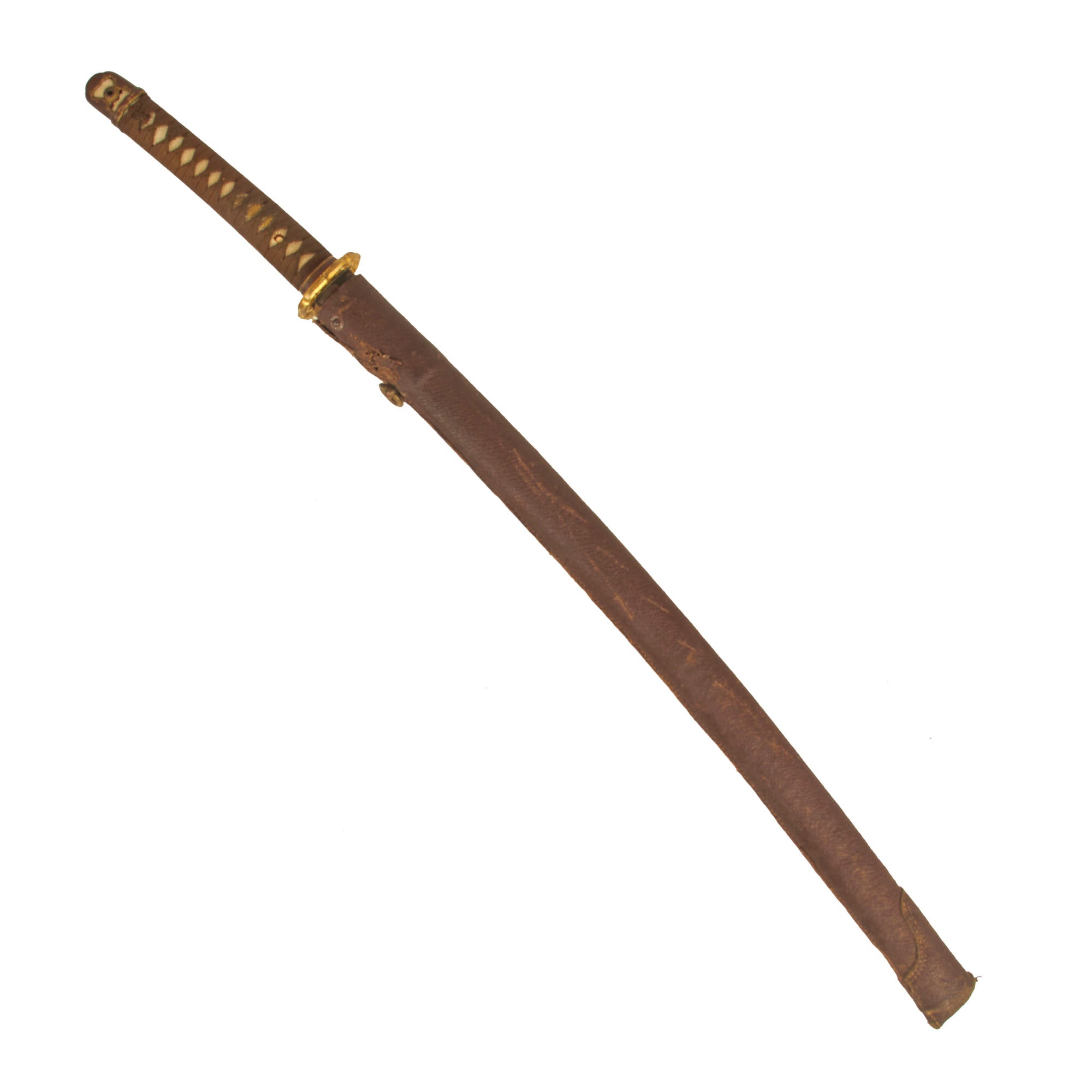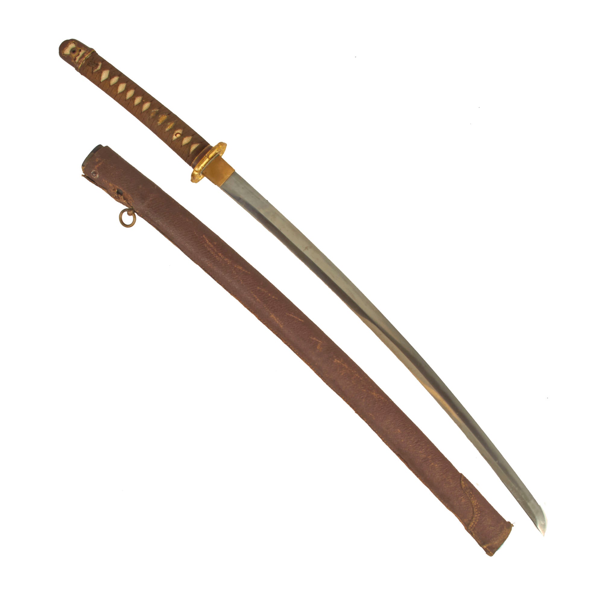 Original Item: One of a Kind. Recently purchased at large military show, this is a very nice USGI Bring-Back wartime production Japanese Army Officer Katana in the Type 98 Shin-Gunto (九八式軍刀 kyūhachi-shiki guntō) setting. These type of fittings (koshirae) are slightly simplified compared to the earlier Type 94. The blade tang is signed by the maker, and appears to be handmade in the traditional fashion. A Shin-Guntō (新軍刀, new military sword) is a weapon and symbol of rank used by the Imperial Japanese Army between the years of 1935 and 1945. This example has something we rarely see: a rubberized canvas scabbard cover. These are almost always made from leather, and this is probably the first time we have had one made from rubberized canvas faux leather.