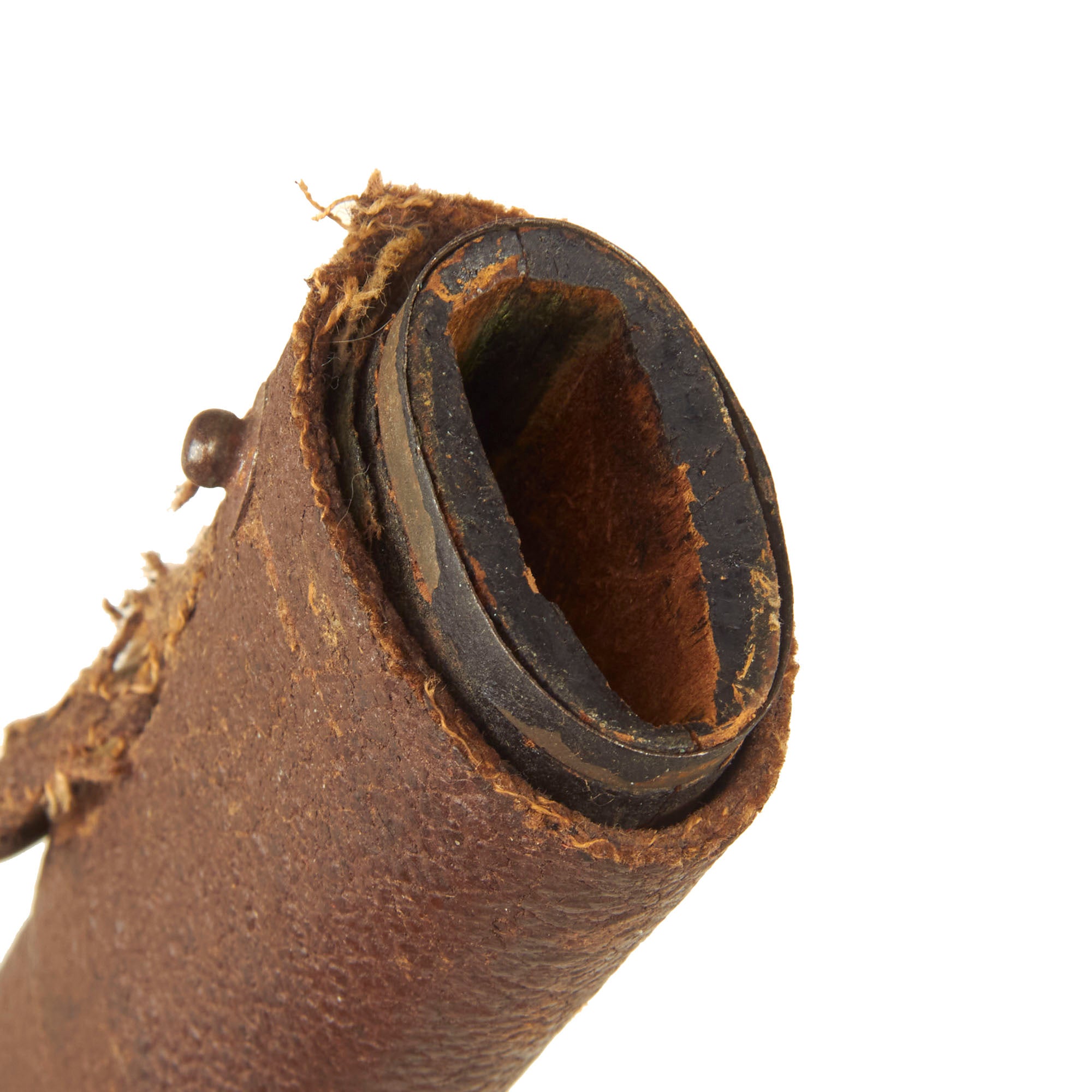 The Scabbard (saya) on this example is wood with a field cover, often seen on swords refit later in the war, as they required far less materials and production time. However in this case, the field cover is a rare example, made from brown rubberized canvas faux leather. This material was highly unstable and deteriorates over time, so they are very rare to find, especially in such good condition. The cover is sewn onto the scabbard, and cannot be removed. There is a metal KOIGUSHI scabbard mouth fitting on the wooden portion, and it is fitted with a brass hanger ring. There is a snap on one side that originally would have been attached to a leather strap around the handle, which is missing.