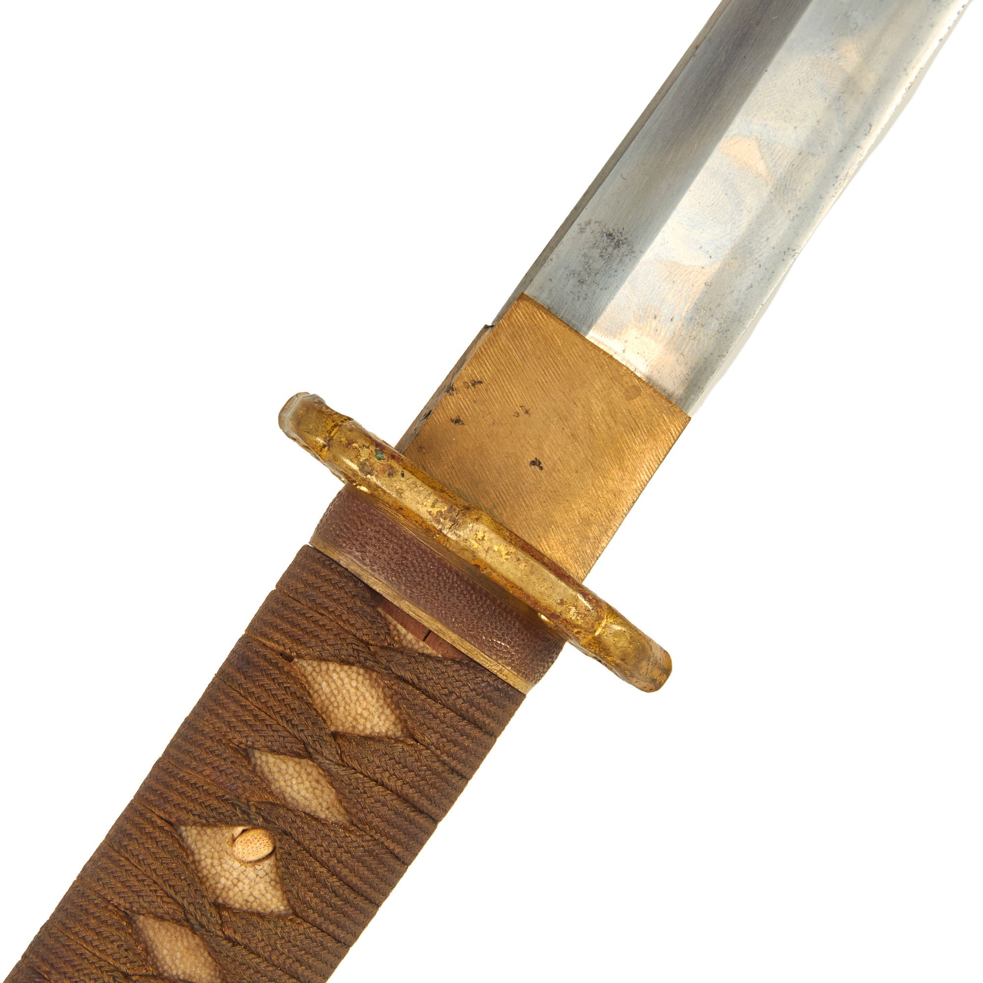 The blade collar (habaki) is brass with a crosshatched surface texture, and is the standard shape usually seen on WWII production blades. The handle (tsuka) has a very nice stingray skin (Sa-Me) grip, with the correct golden brown Ito (cloth binding). The wrapping shows very minor wear with no real staining from use. There is a single wooden peg (mekugi), which is a recent replacement.