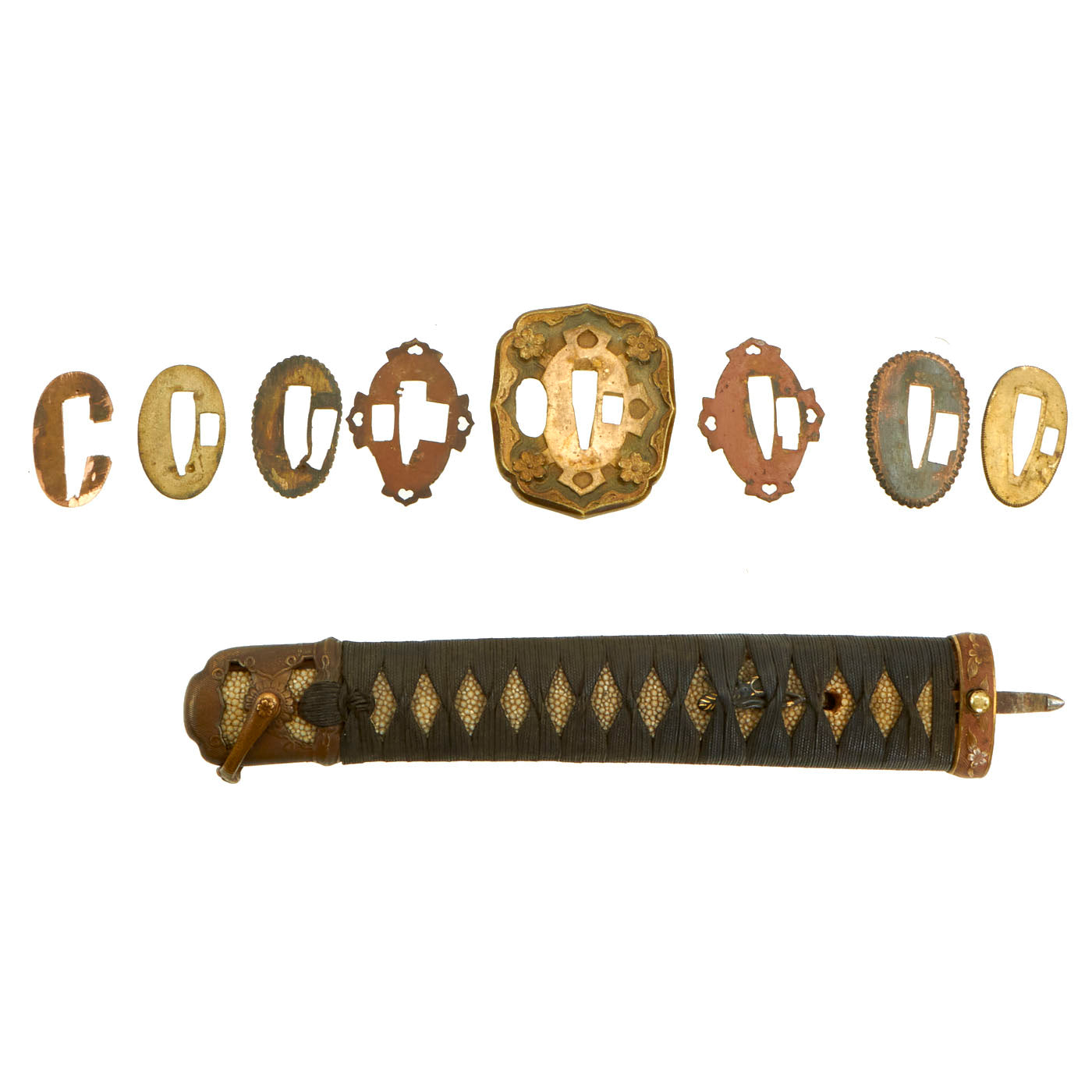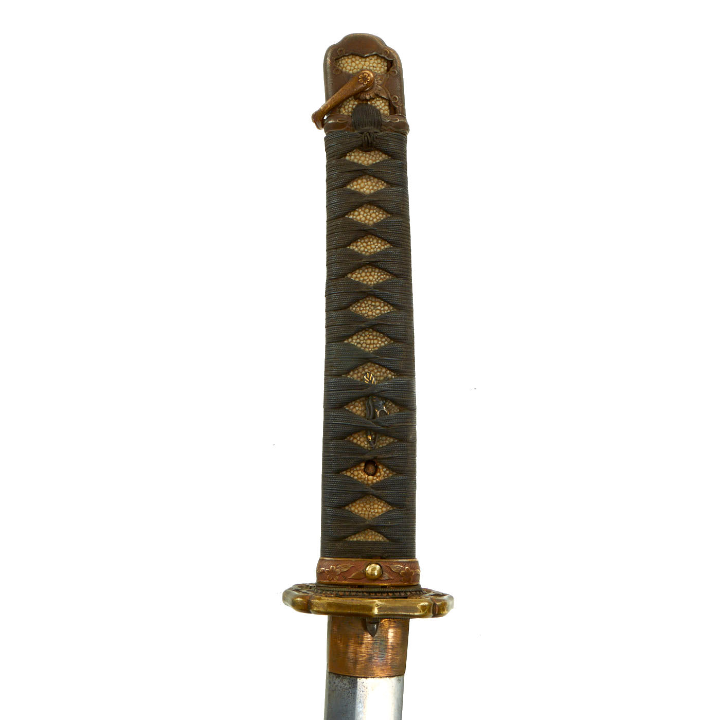 The handle (tsuka) has an nice stingray skin (Sa-Me) grip, with the correct Ito (cloth binding). The binding however is black, and looks to have been re-wrapped during or after WWII. The original army menuki were lost, and instead there is a single one remaining, which is in the shape of a bow and quiver. There is a single wooden securing peg (mekugi) still present, which looks to be a post war replacement.