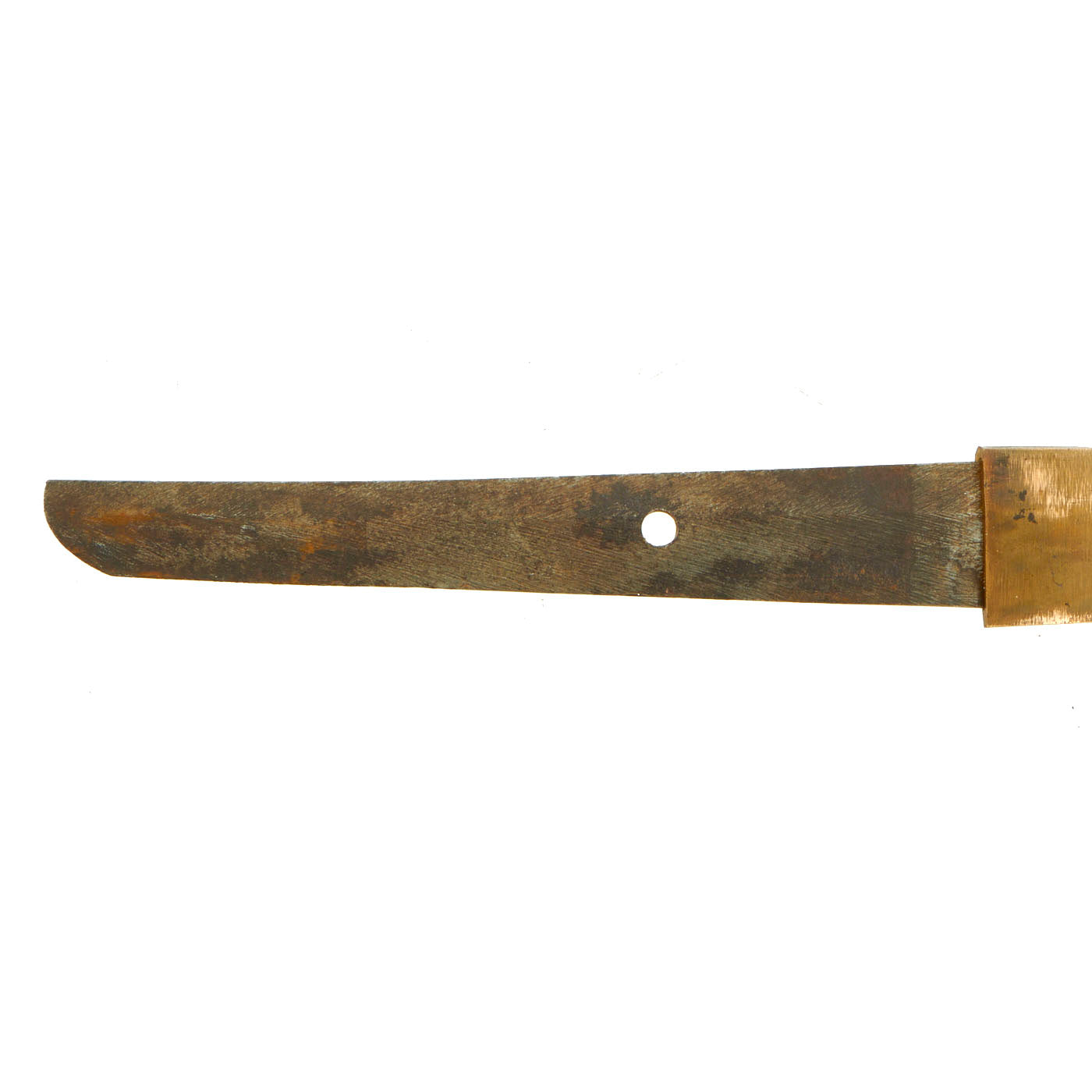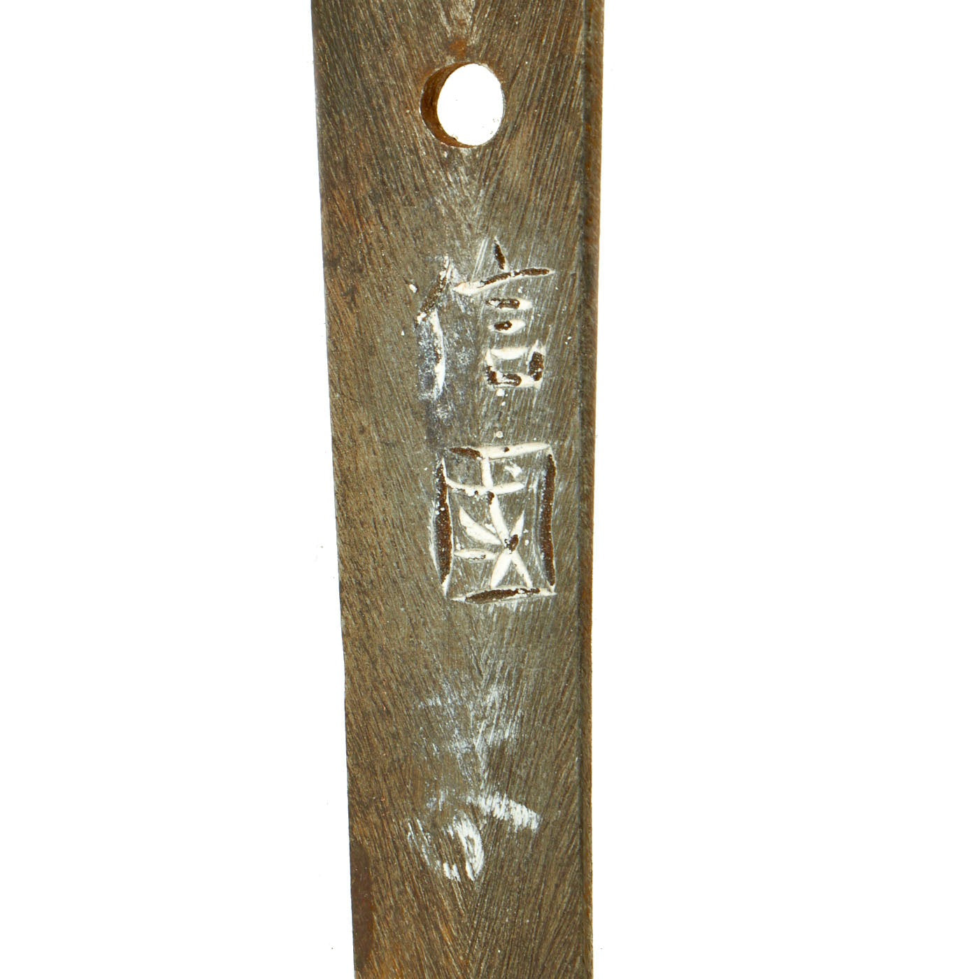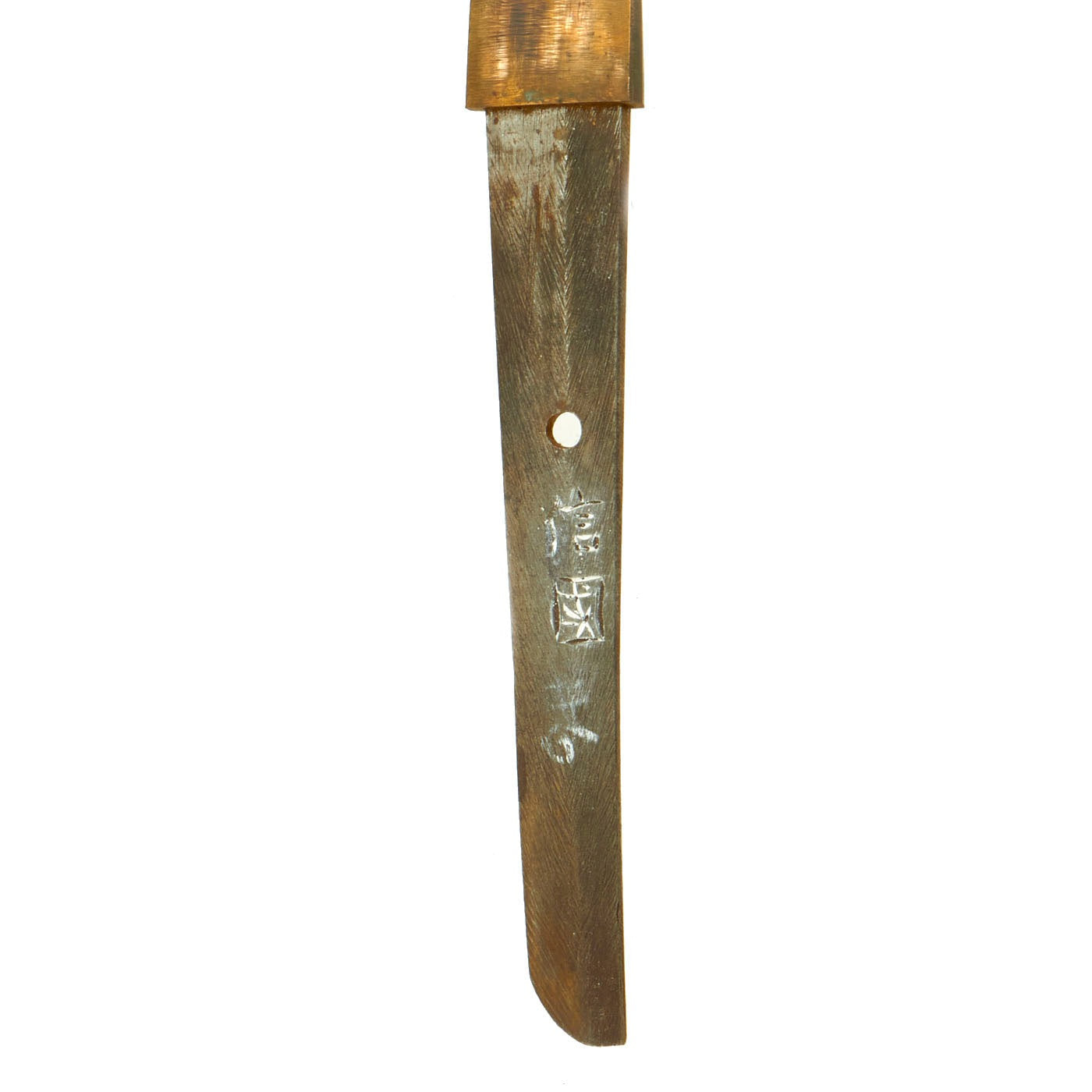 The blade on this example was hand forged, and the tang of the blade is signed (Mei) with the characters 信 國, read as NOBUKUNI. We ere not able to find much about this smith, except that they were active during the Showa era and worked in Akita, what was previously Dewa (出羽) Province. This smith look to have made both arsenal forged and traditional blades. We have confirmed the signature (Oshigata) with other examples of his work.
