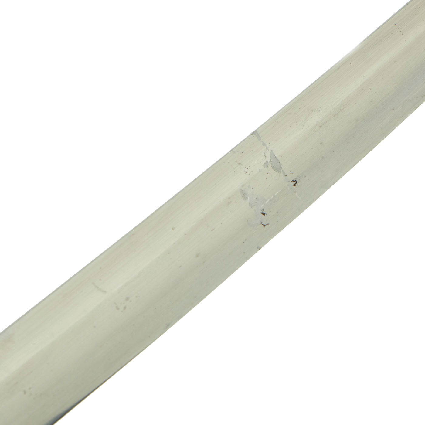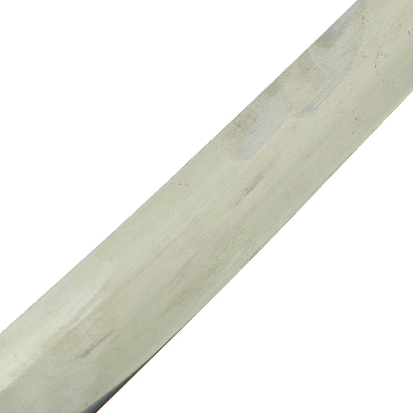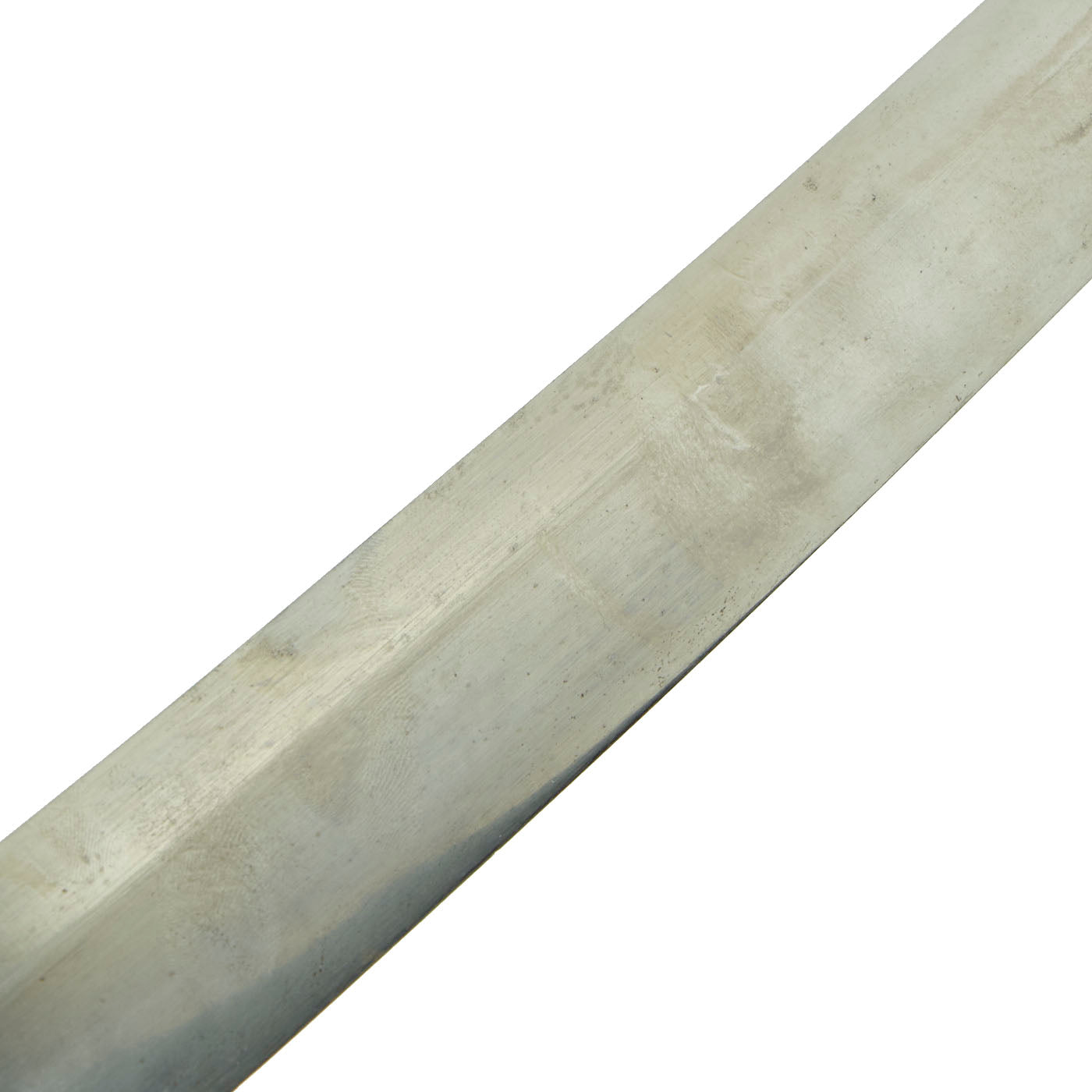 Offered in very good condition, the blade is still quite sharp and looks great. We really do not see any nicks or bends on the edge of the blade at all. There is however some scuffing on the surface from use on the last 6 inches or so of the blade. There are also signs of light staining near the spine of the blade close to the guard, now polished out from cleaning. The temper line has become a bit faint, showing that it has been cleaned and seen service since the last polish. Blade length is approximately 25 3/4 inches and overall length of 35 3/4 inches.