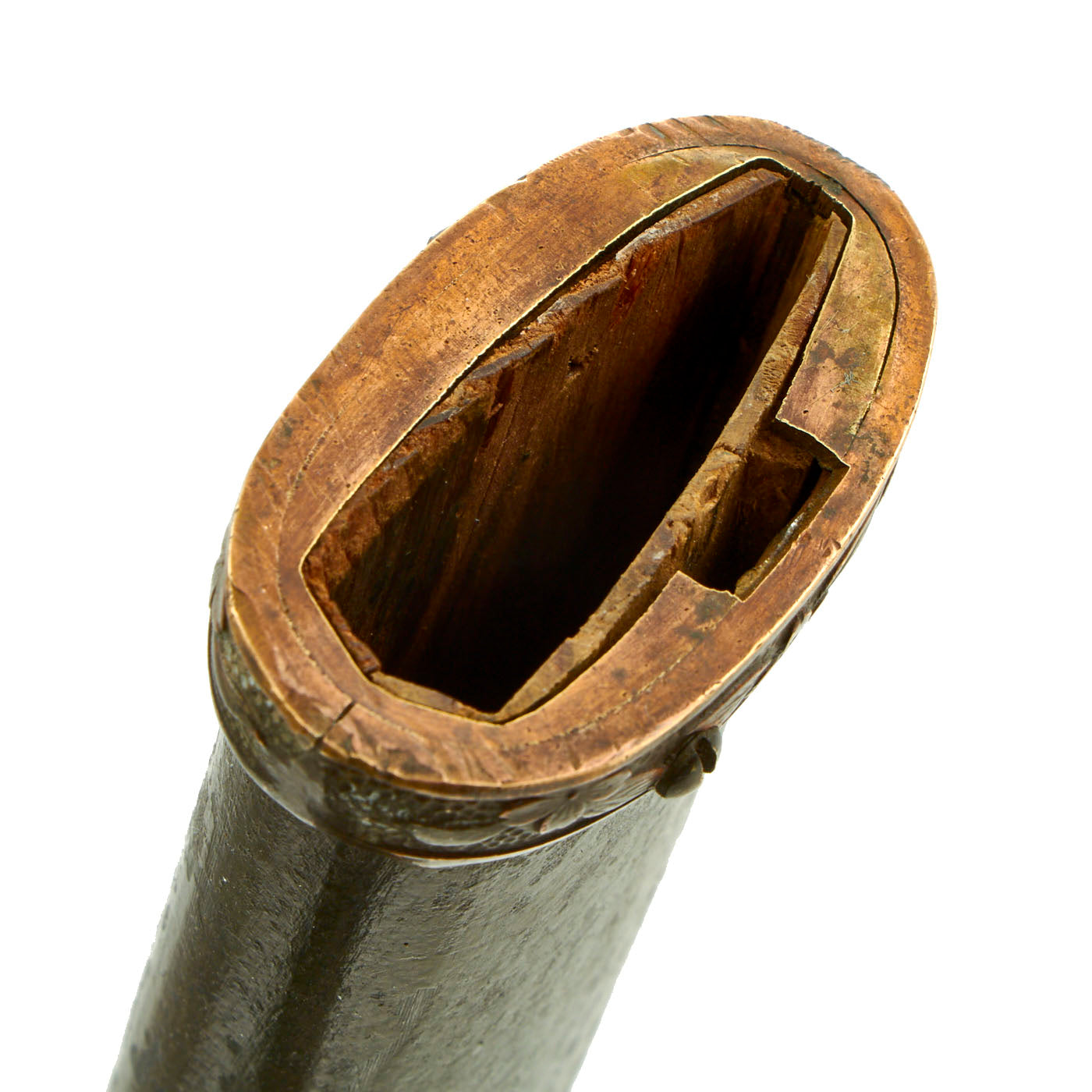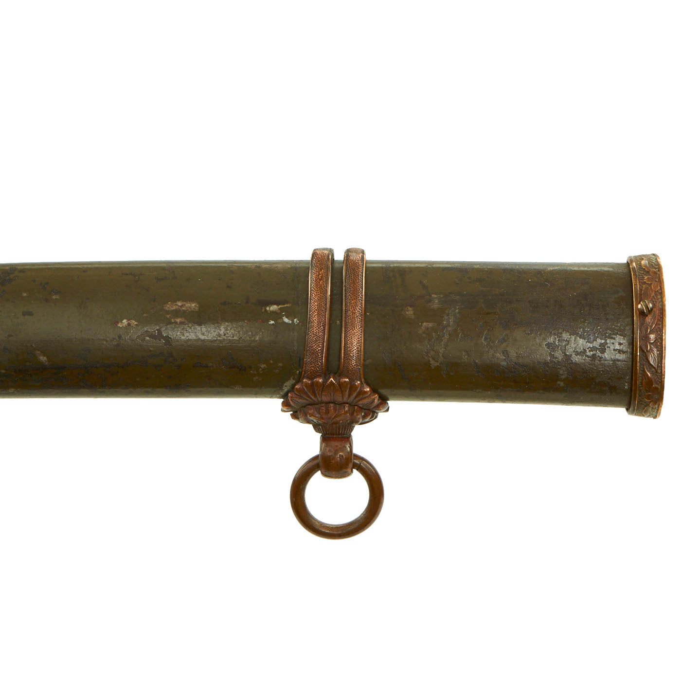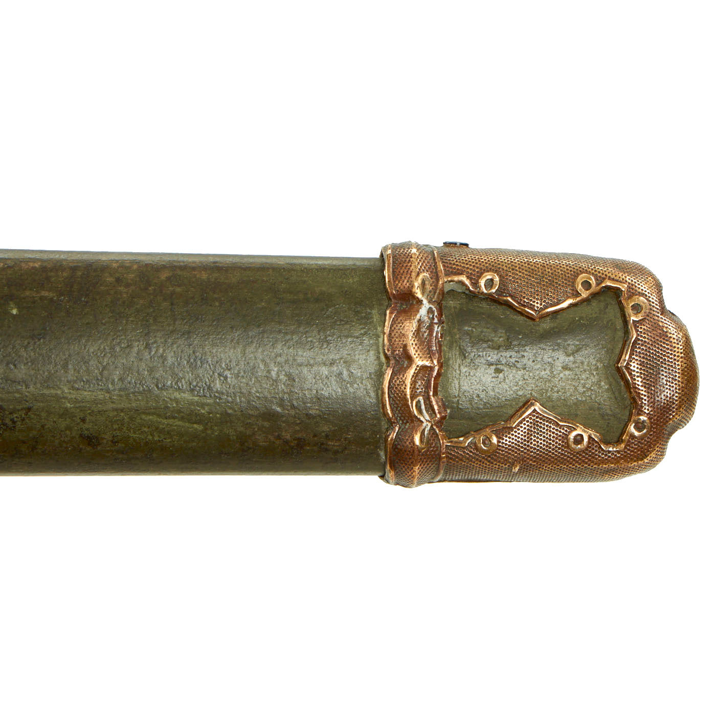 Offered in very good condition, the blade is still quite sharp and looks great. We really do not see any nicks or bends on the edge of the blade at all. There is however some scuffing on the surface from use on the last 6 inches or so of the blade. There are also signs of light staining near the spine of the blade close to the guard, now polished out from cleaning. The temper line has become a bit faint, showing that it has been cleaned and seen service since the last polish. Blade length is approximately 25 3/4 inches and overall length of 35 3/4 inches.