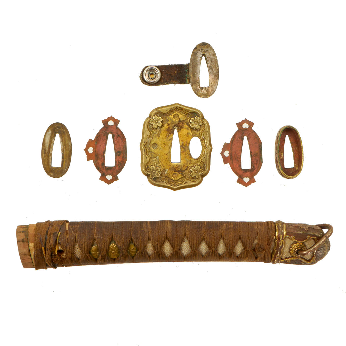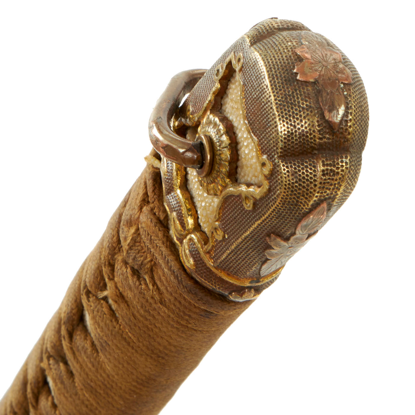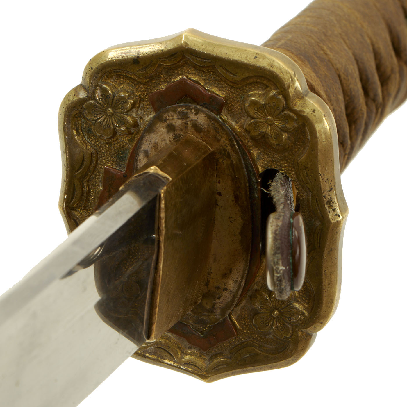 The blade mountings are the classic later WWII era Type 98 Army Shin-Gunto style, brass with gilt accents. Rounded "quince" shaped tsuba (cross guard) with brass Imperial Army cherry blossom menuki (grip decoration), and a nice Kabuto-Gane (Pommel Cap). The cross guard and pommel cap have matching cherry blossom motifs, which are also found on the scabbard fittings, and the fuchi (grip collar). There are 4 metal Seppa (spacers) around the cross guard to keep the fit tight, as well as a leather spacer with a locking strap attached. The tsuba and seppa are all inlet on the side for the strap. The blade collar (habaki) is brass, and is the standard shape usually seen on WWII production blades.