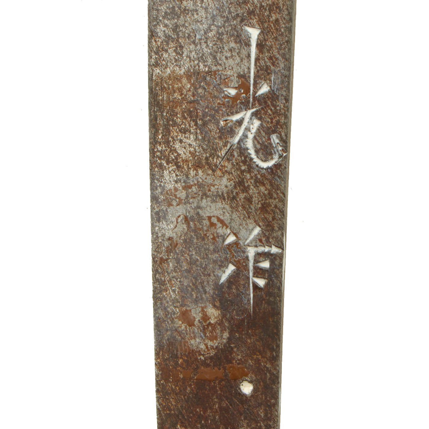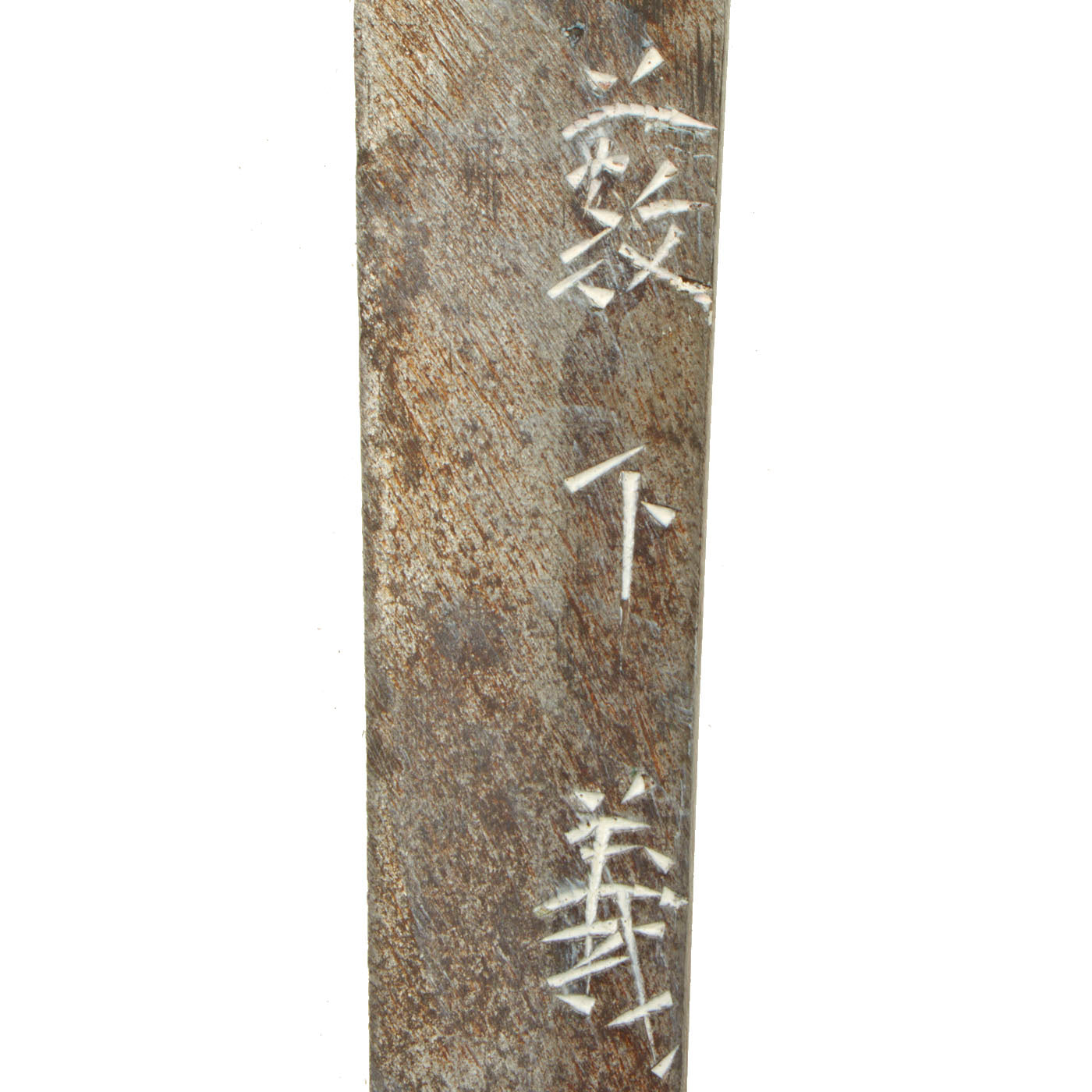 The blade on this example was hand forged, and the tang of the blade is signed (Mei) with the characters 藪 下 義 光 作, read as YABUSHITA YOSHIMITSU SAKU. Research indicates that this smith's real name was 藪下 不二夫 - (Yabushita Fujio), so in this case "Yabushita" was their family name, and "Yoshimitsu" their "swordsmith name." We have seen many other smiths sign their swords in this fashion. Their name appears in the Seki Tanrensho Booklet printed in 1939. Kazunori was active during the Showa Period and worked at Seki arsenal in Gifu, Mino Province (美濃国). This smith look to have made both arsenal forged and traditional blades. We have confirmed the signature (Oshigata) with other examples of his work.