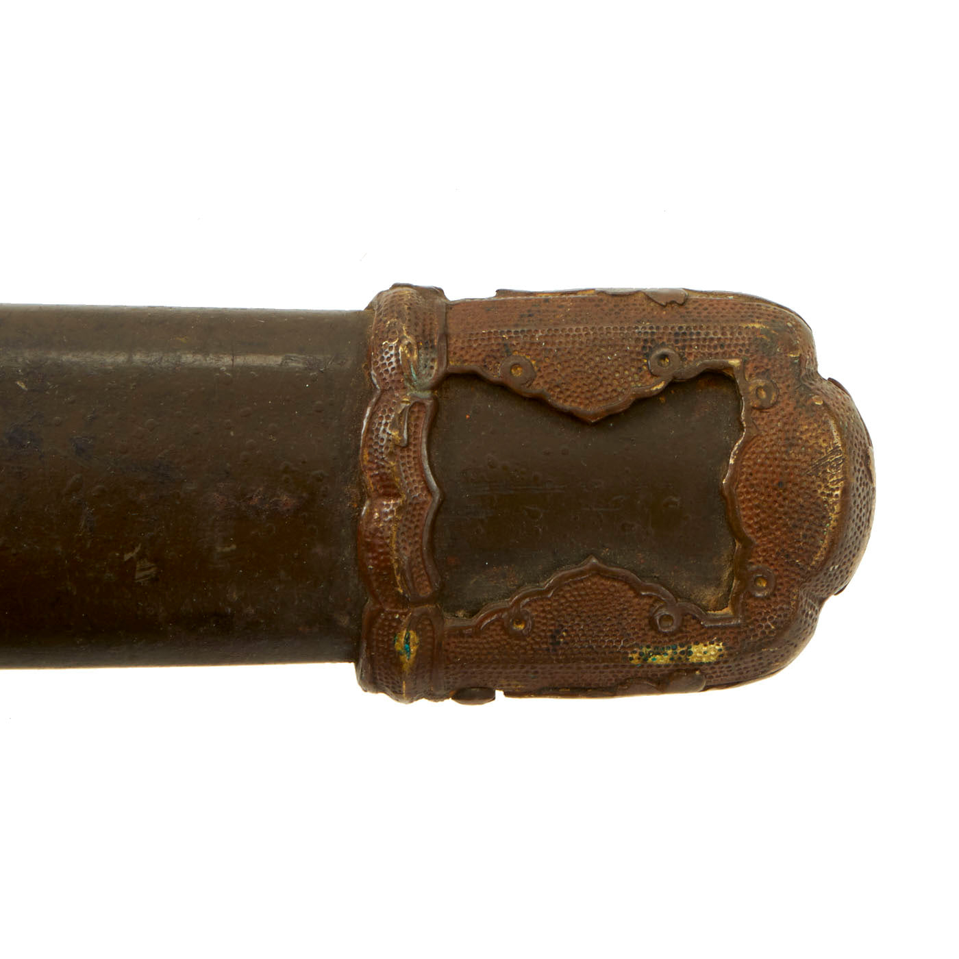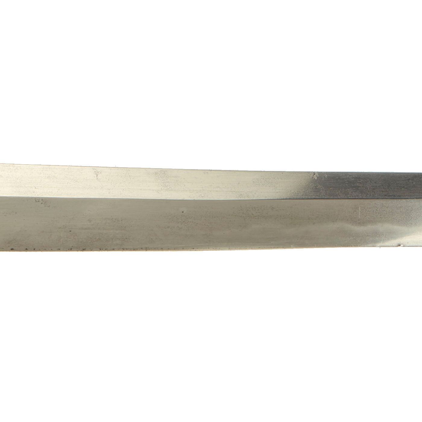 Offered in very good condition, the blade is still relatively sharp and looks great. It does show wear from service, with a few nicks on the edge of the blade. There are also signs of light overall staining, now polished out from cleaning. There is scuffing on the blade surface and the polish is somewhat degraded, showing that it has been cleaned and seen service since the last polish. Blade length is approximately 25 1/4 inches and overall length 36 inches.