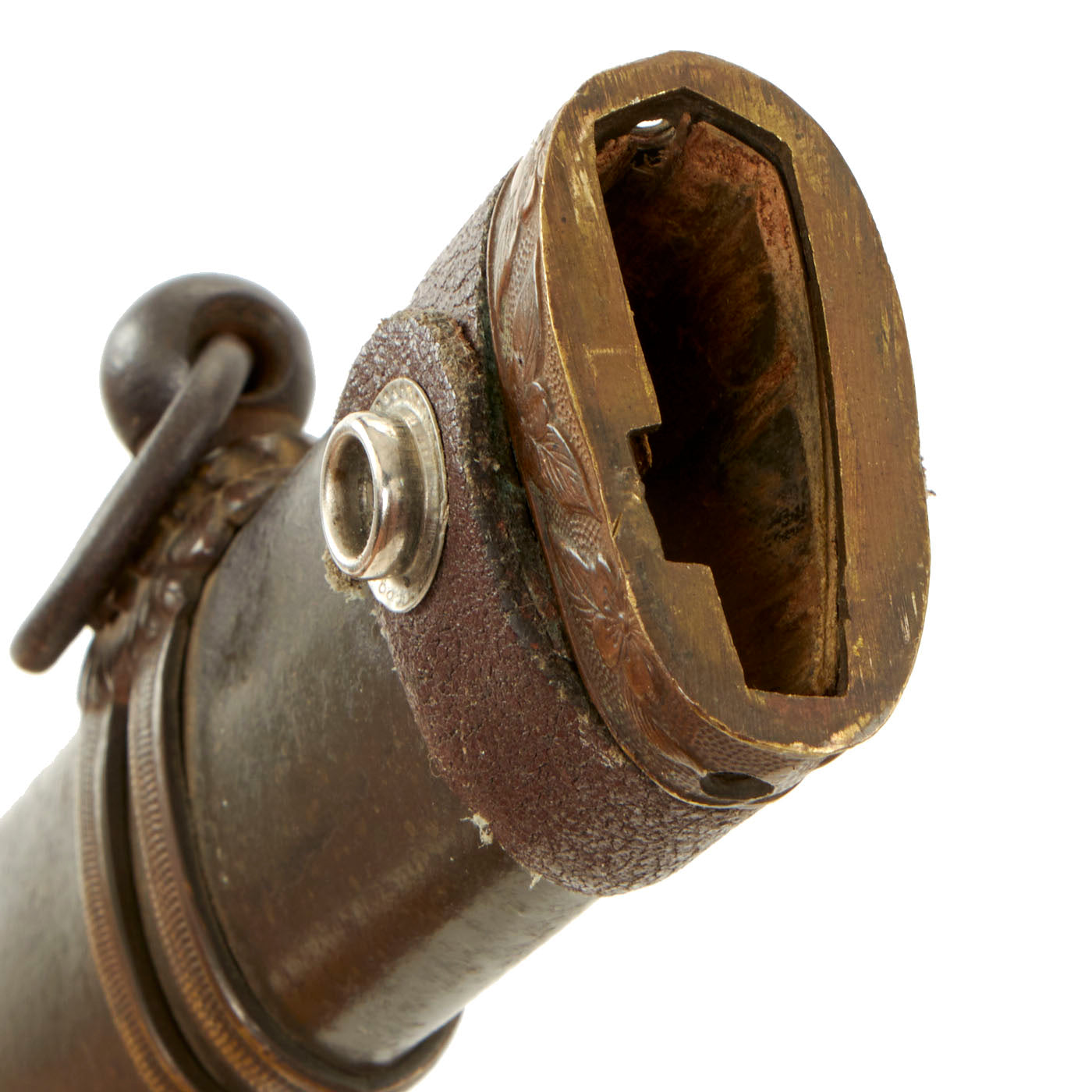 The Scabbard (saya) is steel over wood, and in very good condition, with most of the original textured paint intact. There is definitely sign of use however, with some peppered oxidation and wear. It has the correct single hanger loop of the Type 98 style, and the top fitting is inleted for the scabbard lock on the hilt, though there is no lock on this example. Instead it has a leather loop around the top with a snap on it, for the strap from the handle. Both of the small brass screws for the throat fitting are missing unfortunately, so it can be slid off the end of the scabbard.