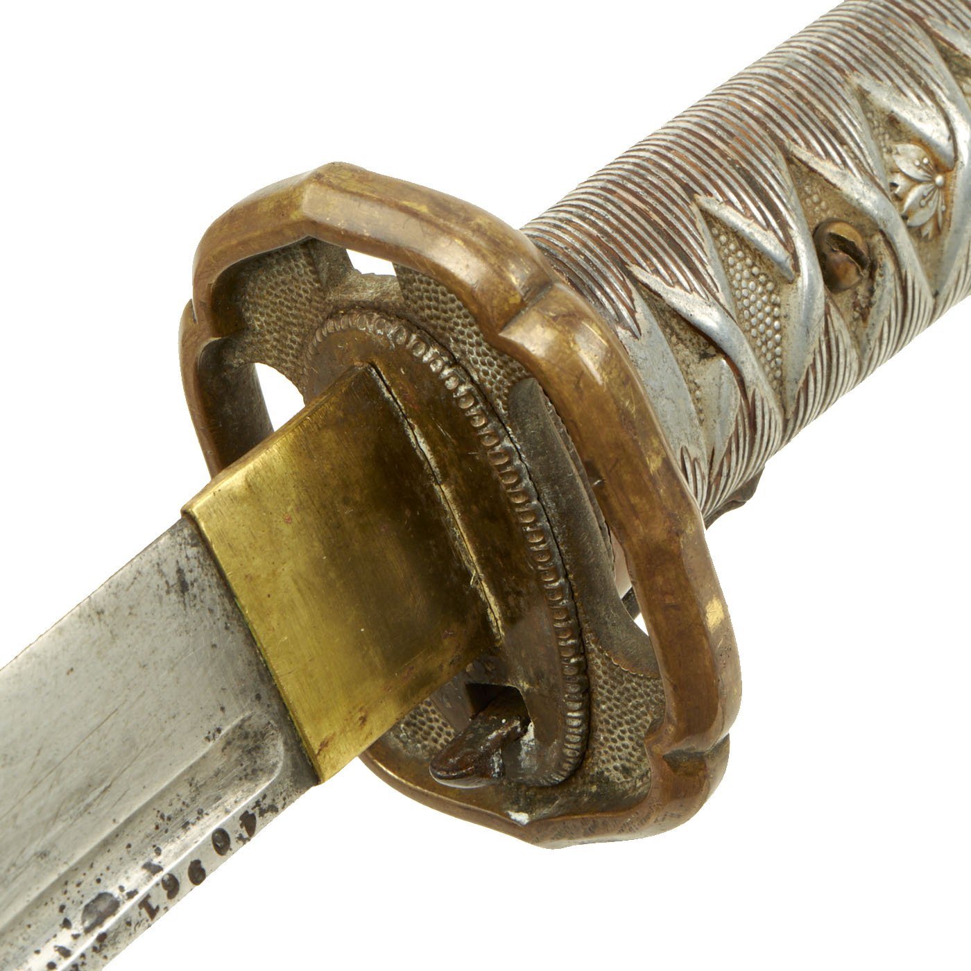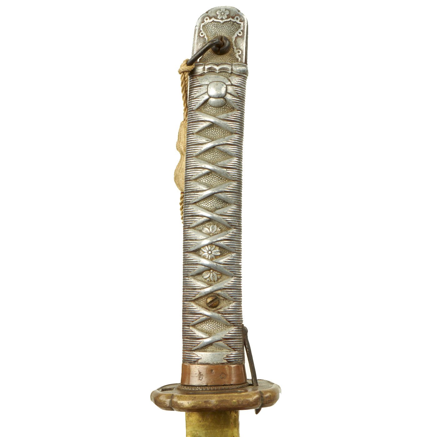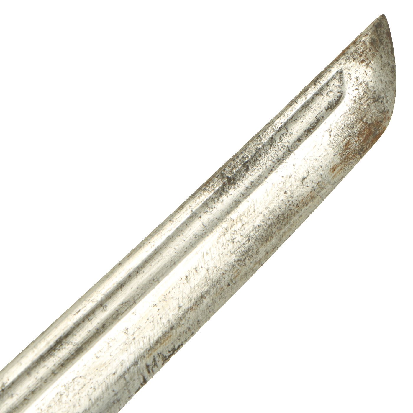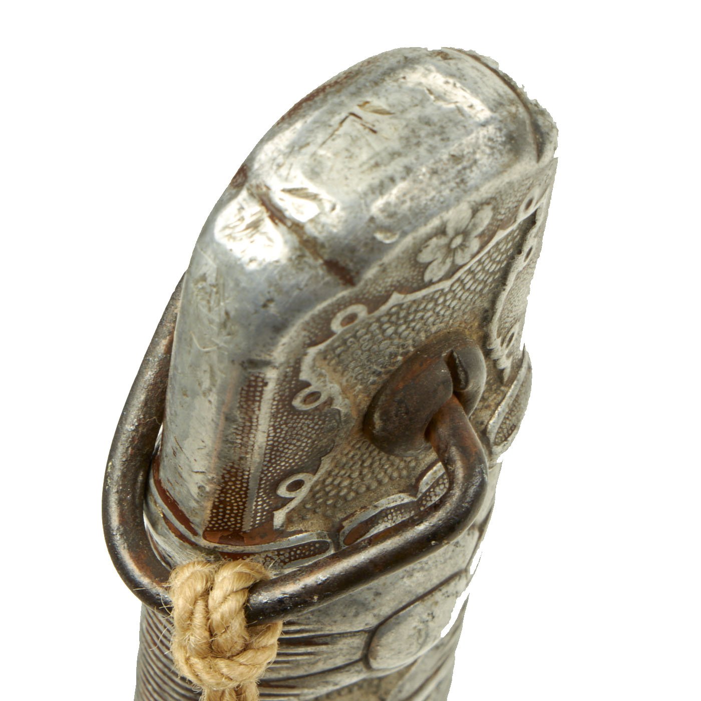 This service used example is a genuine WWII Japanese Type 95 NCO Samurai Sword or katana, with aluminum handle construction and machine made fullered blade. Blade is 26 1/2 inches long, with an overall length of 36 1/4 inches. The grip wrapping and menuki are cast-formed, and then painted to give the illusion of fabric wrappings and gilt menuki.