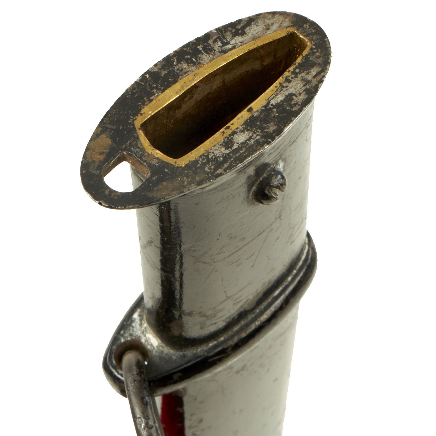The sword is complete with the metal locking spring tab that secures the blade to the scabbard. This prevents the sword from falling when the soldier is running. Traditionally this function is assigned to the Habaki (blade collar). But machine made swords like this one do not have the accuracy of manufacturing that enable the Habaki to perform such a function. The metal loop on the pommel is still present, and looks to have had some type of tassel added post war.