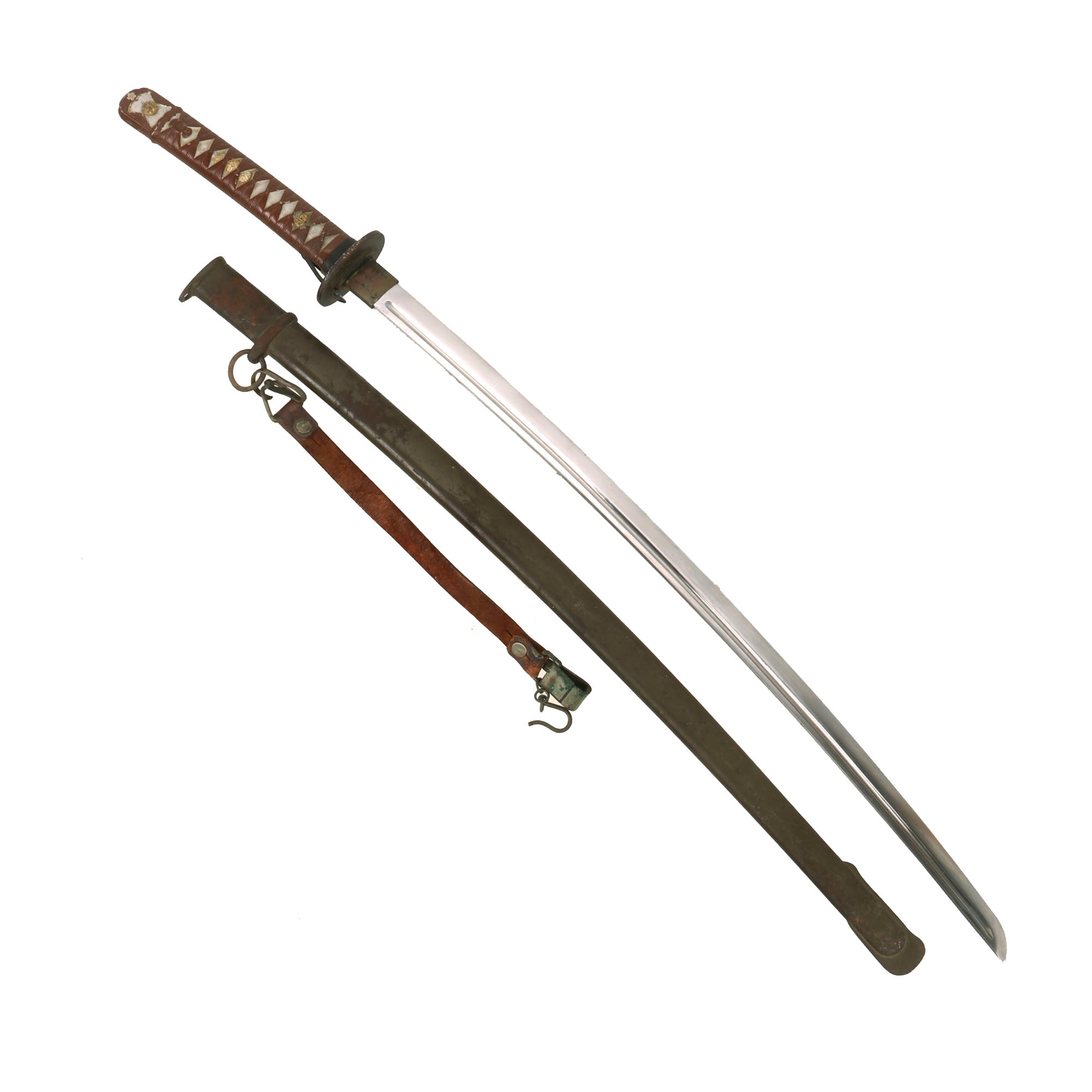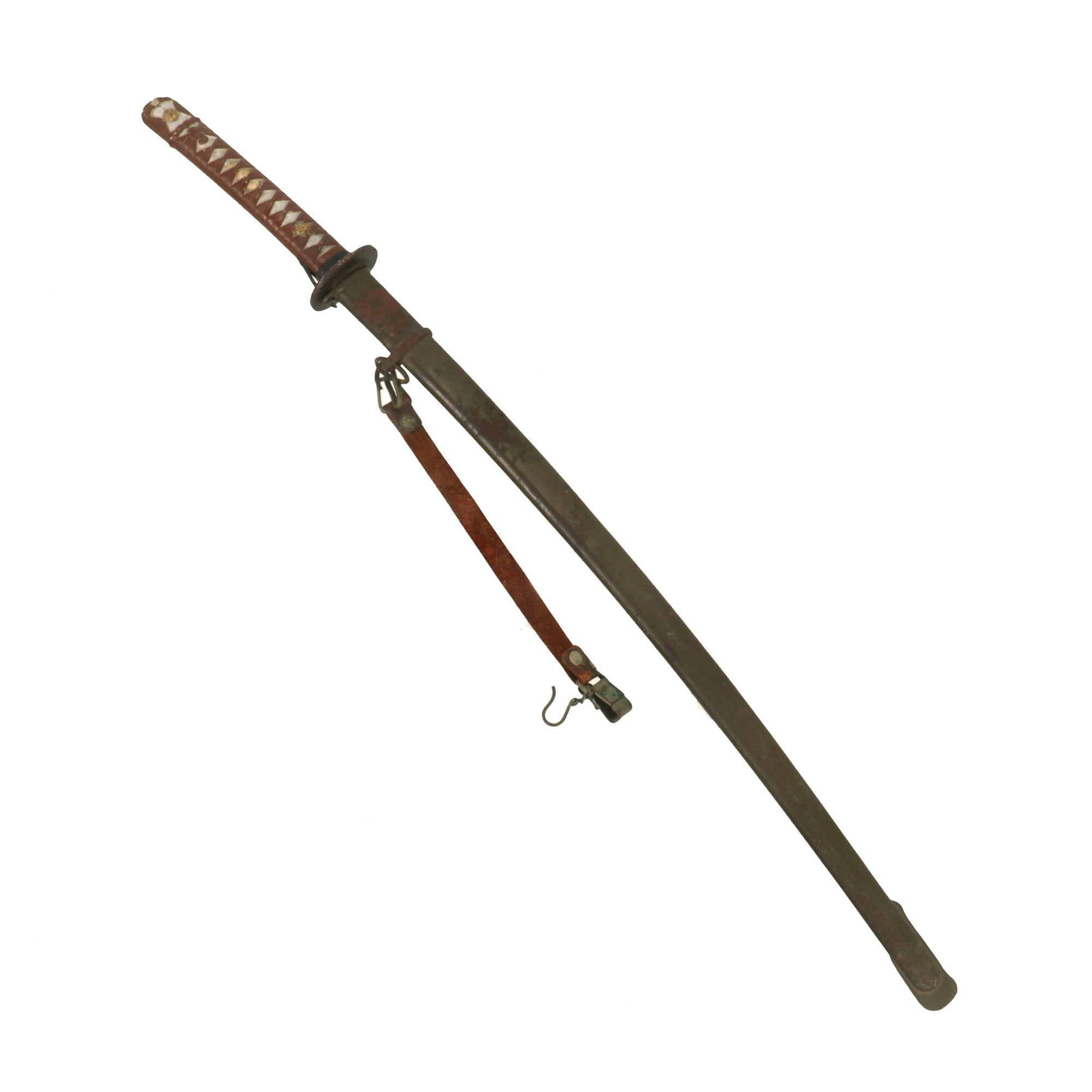 This NCO sword came to us with a rare Japanese WWII Leather NCO hanger, complete with the hooks that could be used to "hitch up" the sword for use in the field. NCO Katanas were issued to soldiers who did not want to take their family sword to battle or who came from poor families that did not have swords to pass down through the generations.