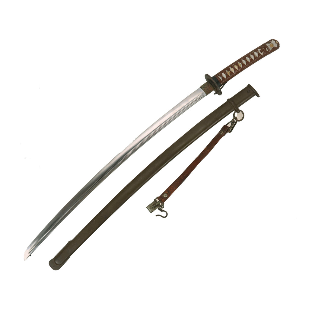 This excellent condition example is a genuine WWII Japanese Type 95 NCO Samurai Sword or katana, with aluminum handle construction and machine made fullered blade. Blade is 26 3/8 inches long, with an overall length of 36 1/2 inches. The grip wrapping and menuki are cast-formed out of aluminum, and then painted to give the illusion of fabric wrappings and gilt menuki. This example comes complete with its original scabbard with great paint, as well as very rare leather sword hanger!