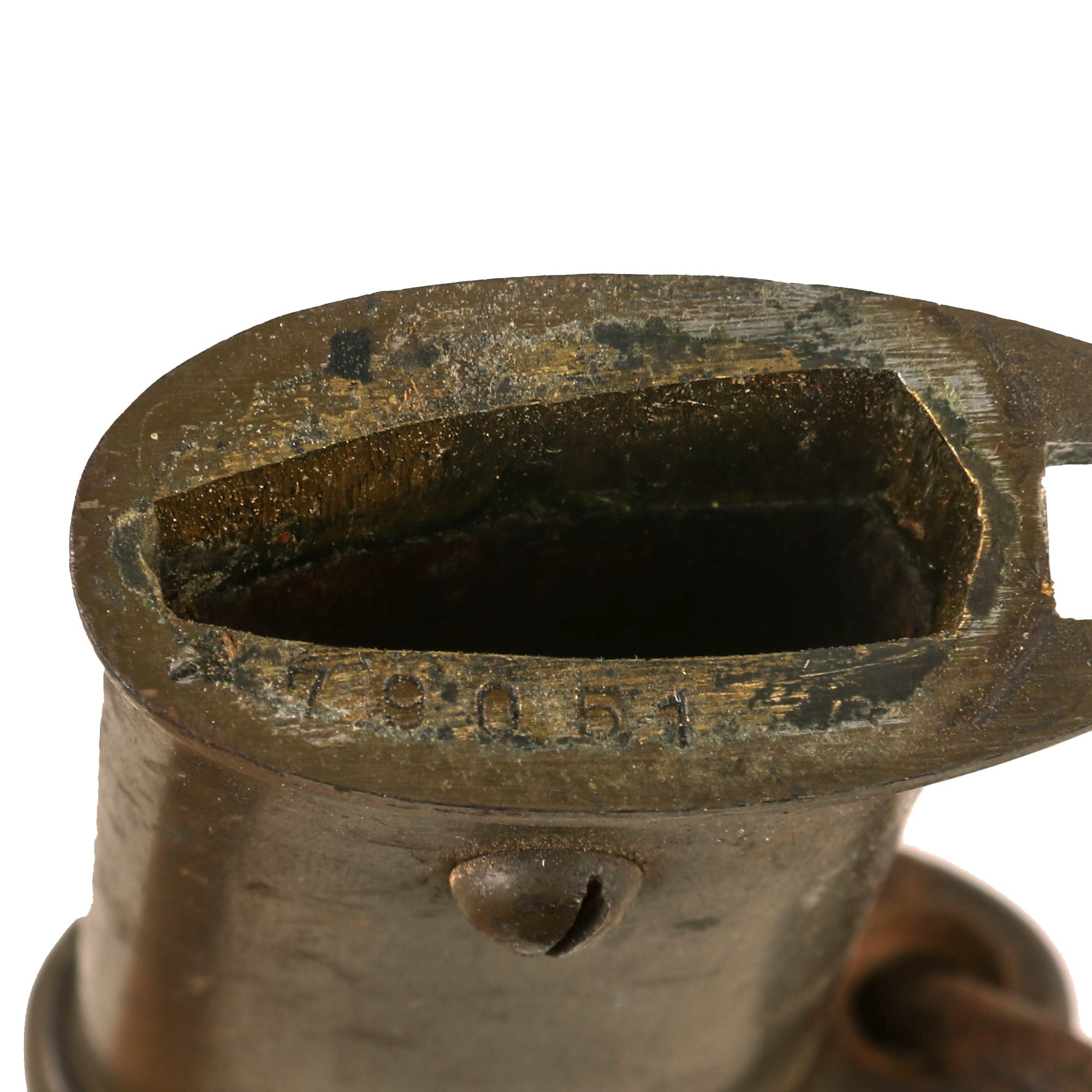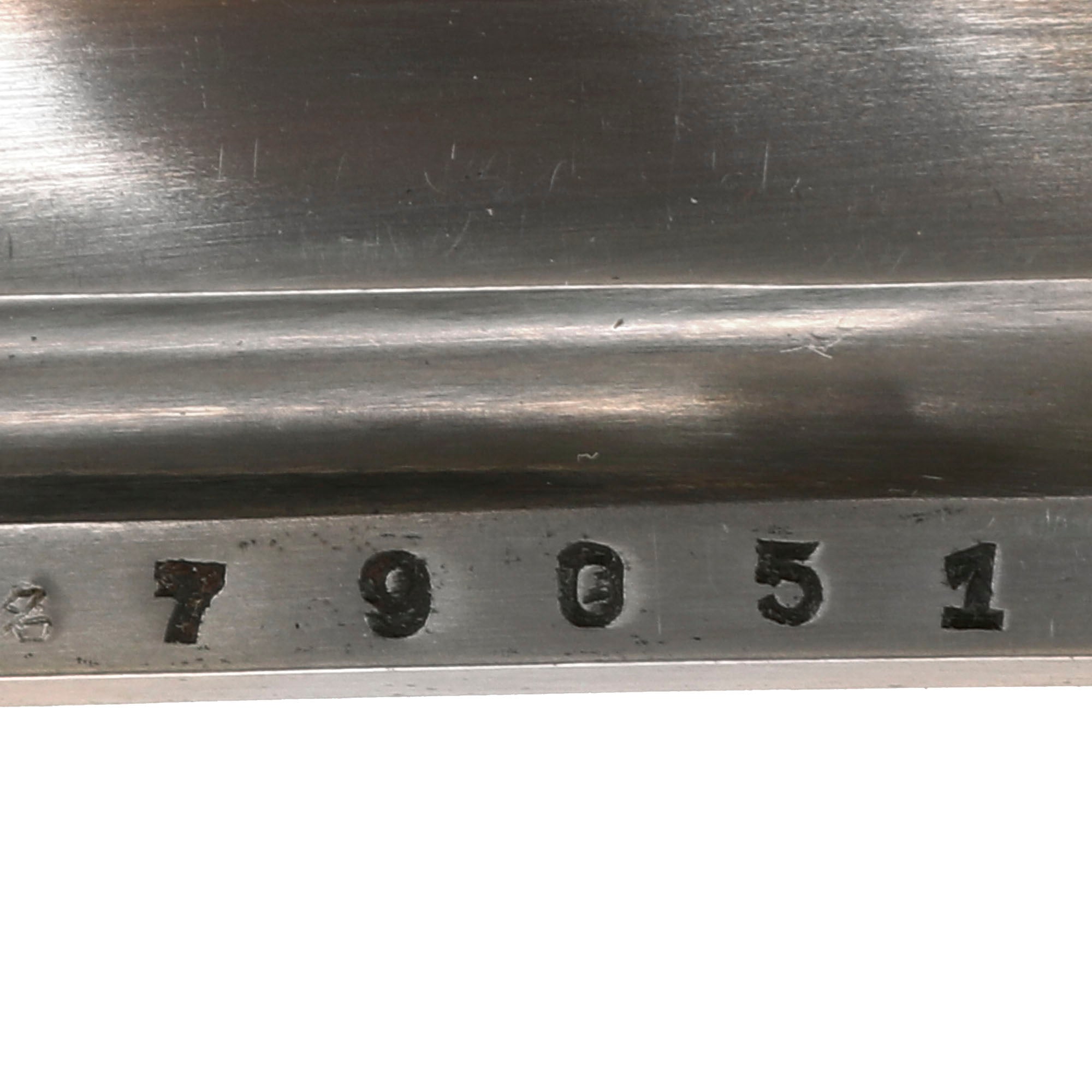 All NCO swords were numbered. This example has a matching serial number 79051 on both the blade and the throat of the scabbard. Most swords do not have matching numbers because somewhere along the life of the sword the scabbard was changed. Next to both numbers is the 名 marking for Nagoya Arsenal. The Fuchi (grip collar) of the sword is the later war simplified iron type, with a cast in seppa, and is not marked with the arsenal and maker information like earlier examples were.