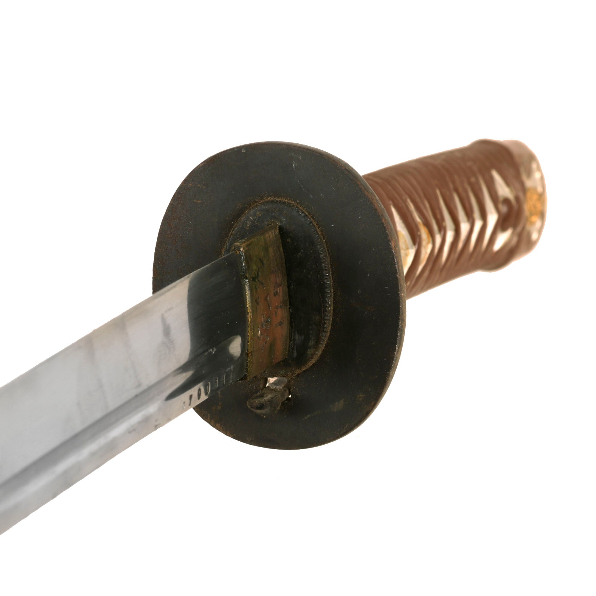 It does look like the sword may have been "dressed up", possibly post war, as both mounting screws have had both sides covered with some type of gilt white metal ornamentations, which look like coiled ropes. There are also chiseled markings on the habaki (blade collar), which look to be in KATAKANA, a Japanese phonetic alphabet used for foreign words. There is also what looks to be a 1941 date so we assume these are markings added by the USGI who brought this home. Many were stationed in Japan post war, and they may have gotten a native speaker to mark it.