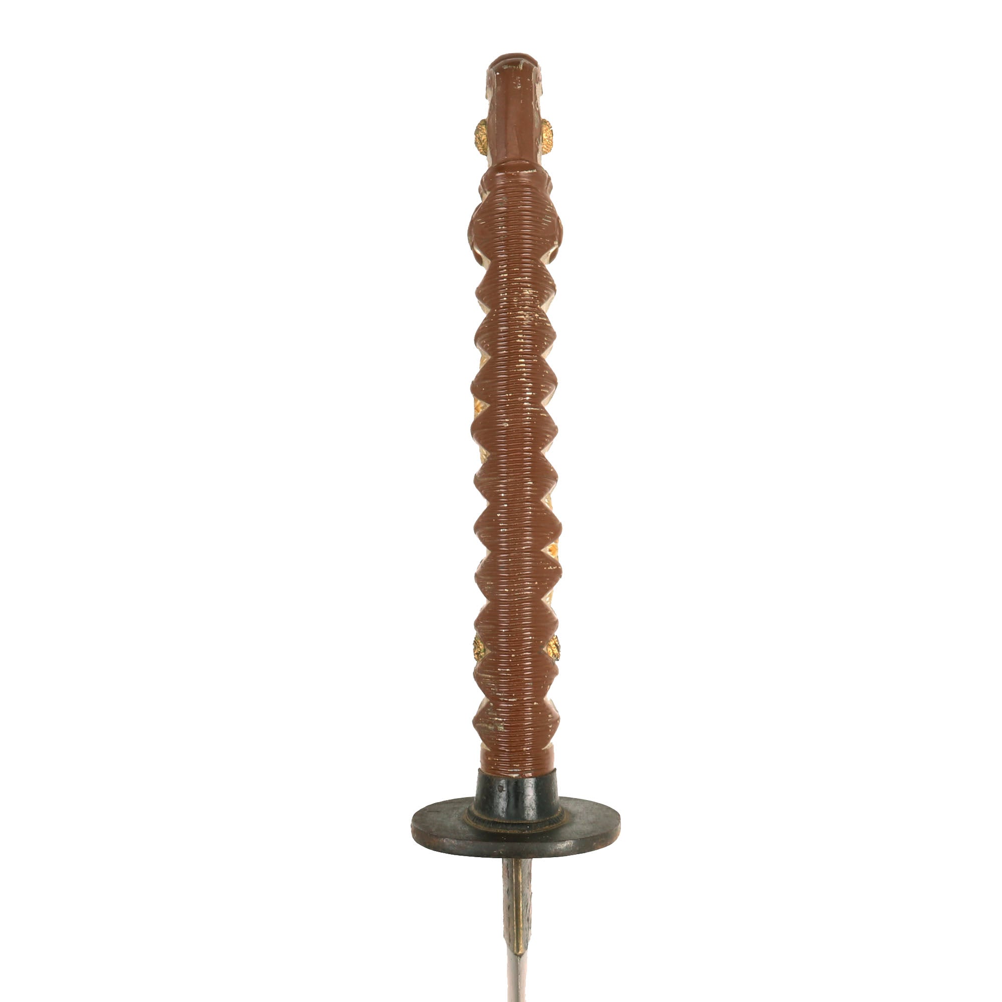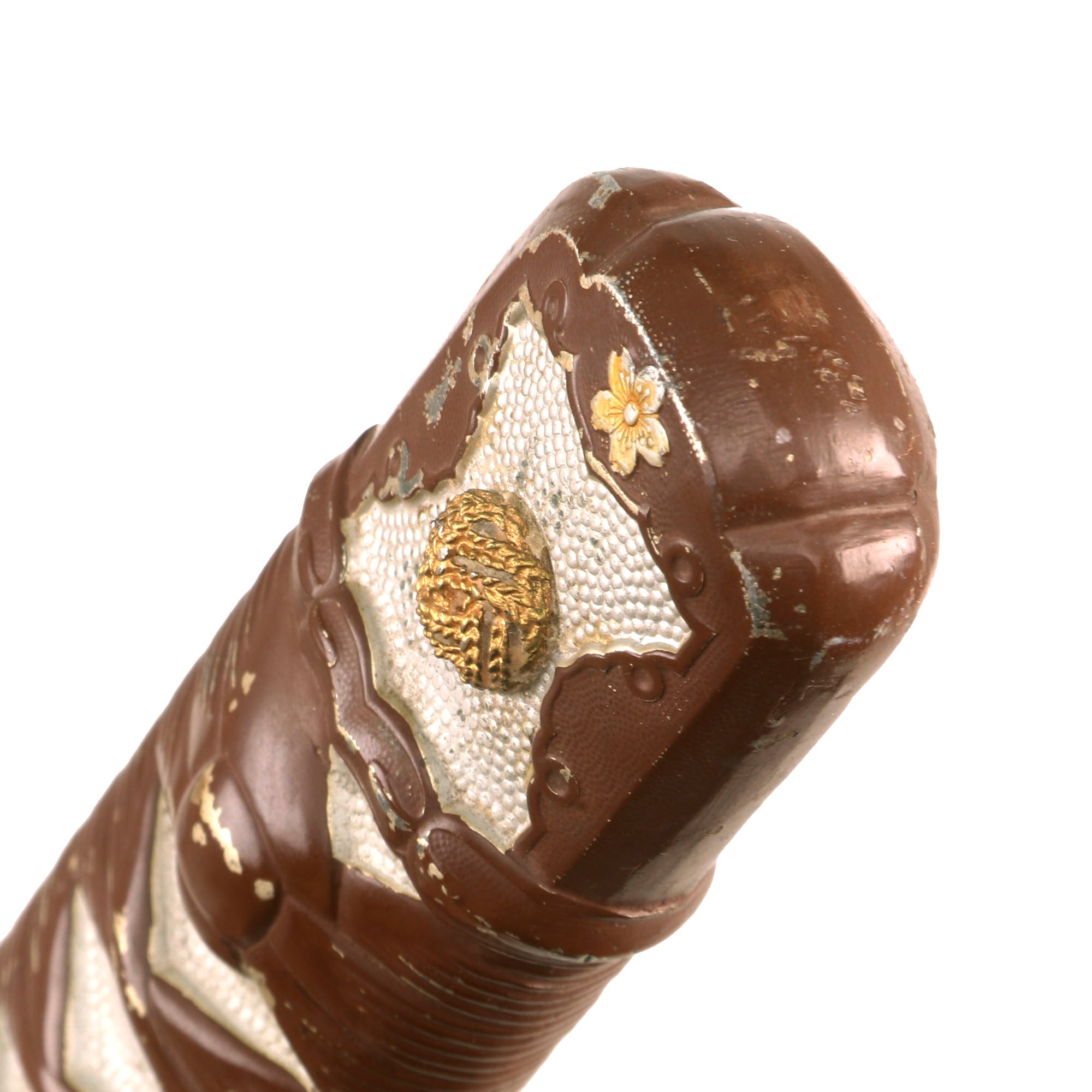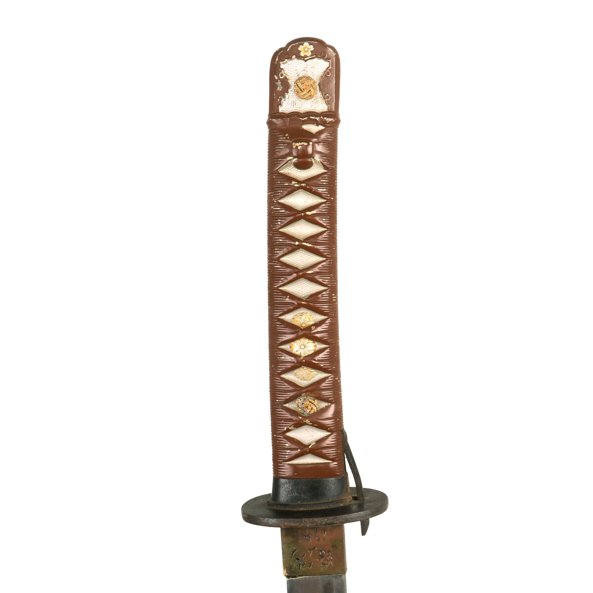 The condition of this sword overall is very good, especially the blade, which is in really great shape. It is bright with very little in the way of oxidation, just a bit of light surface scuffing, and even retains the faux yokote near the tip. It is still quite sharp, and the edge shows no nicks, however the very tip (1-2mm) is bent from being dropped. The brown paint on the pommel is very well retained, and correctly does not run off the faux "wrappings", so we see no reason to think it has been repainted. There are also still traces of the yellow gold highlighting on the "menuki" on the grip and on the cherry blossom on the pommel. The tsuba (crossguard) is the mid-late war simplified iron MARU GATA (round) shape, with no holes to reduce weight. The "seppa" around the cross guard are part of the cross guard and grip collar castings, and the blade collar (habaki) is the standard brass.
