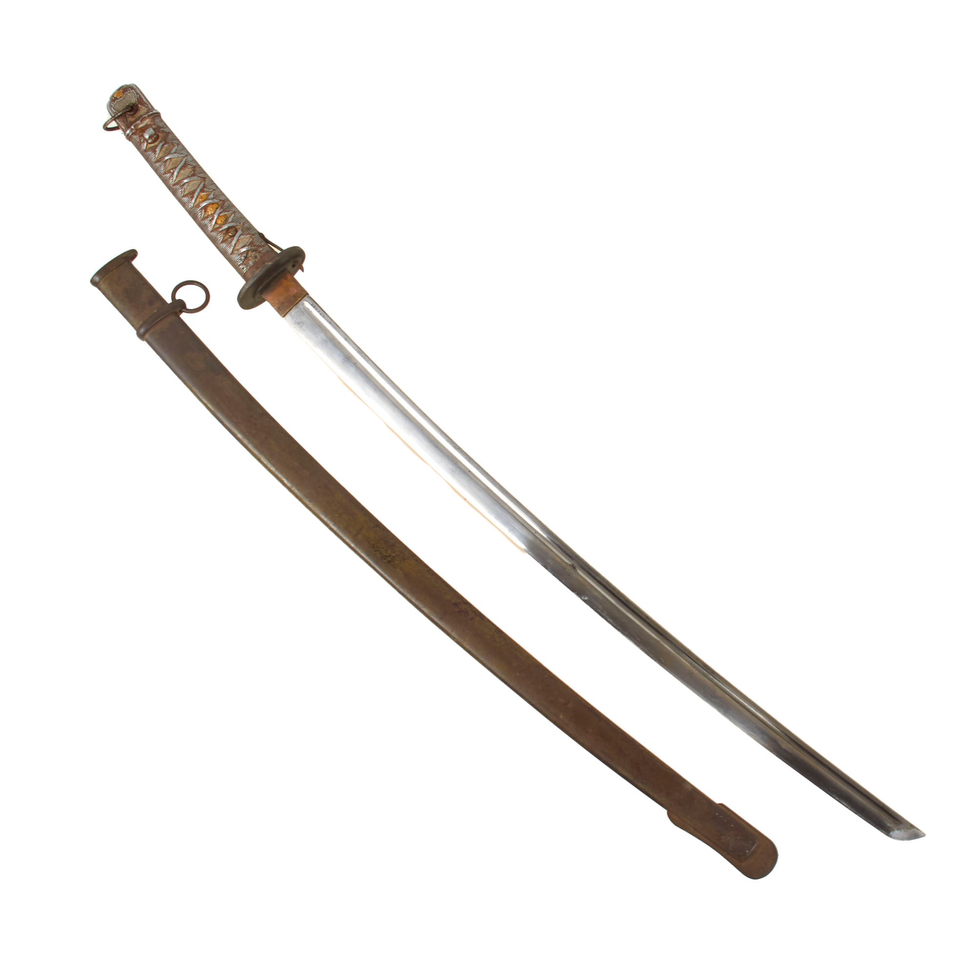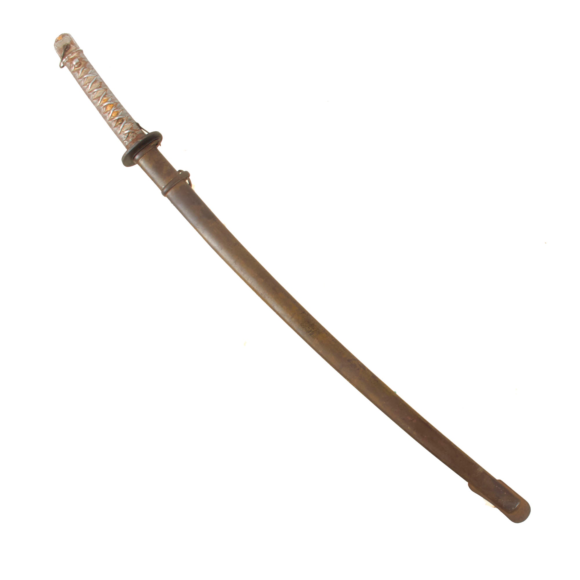 This lovely example is a genuine WWII Japanese Type 95 NCO Samurai Sword or katana, with aluminum handle construction and machine forged fullered blade. Blade is 26 3/8 inches long, with an overall length of 36 1/4 inches. The grip wrapping and menuki are cast-formed out of aluminum, and then painted to give the illusion of fabric wrappings and gilt menuki. The design copies the typical WWII Imperial Japanese Army style fittings, known as the "New Military Sword" ( 新軍刀 - shin guntou) style, with a single hanger ring and bolster on the scabbard. It is said that during battle soldiers would not use the ring but rather would stick the sword through the belt the same way as the Samurai in ancient times. NCO Katanas were issued to soldiers who did not want to take their family sword to battle or who came from poor families that did not have swords to pass down through the generations.