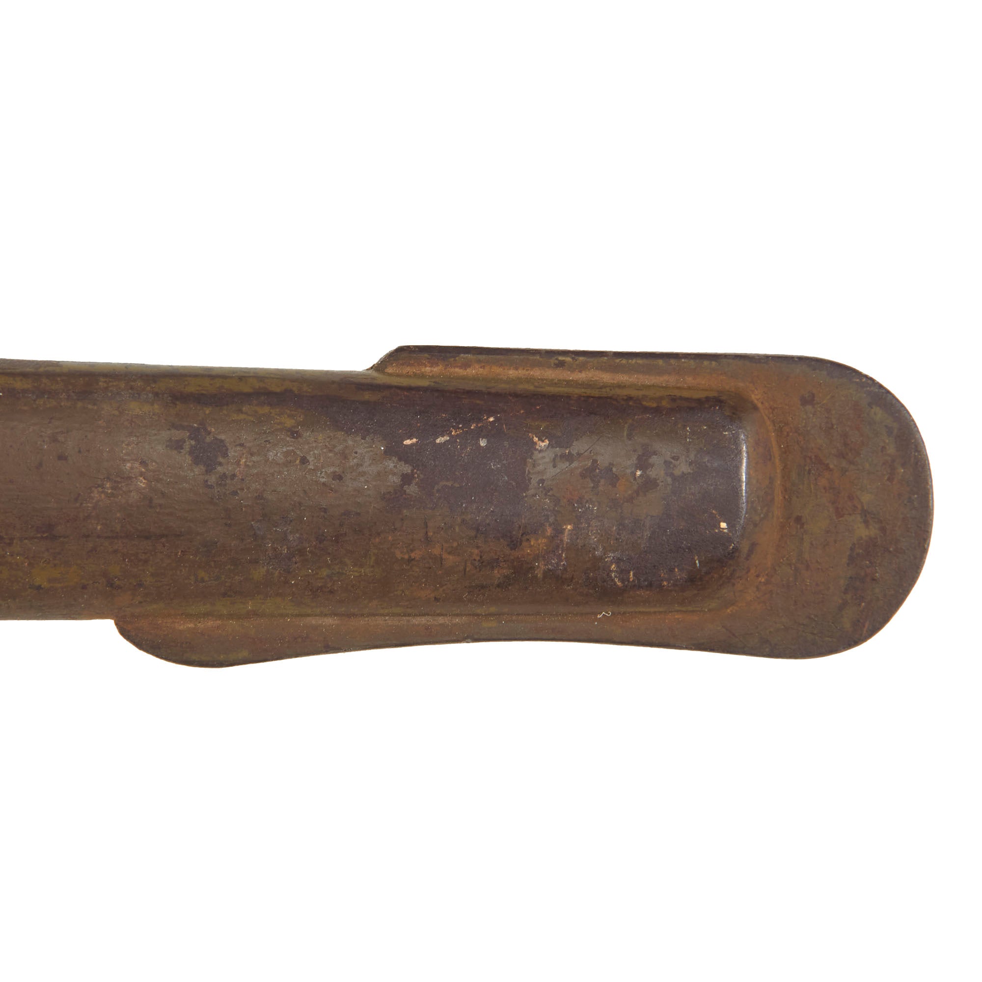 The brown paint on the pommel is very well retained, and correctly does not run off the faux "wrappings", so we see no reason to think it has been repainted. There is also still most of the original amber yellow highlighting on the "menuki" on the grip and on the cherry blossom on the pommel. The tsuba (crossguard) is the mid-late war simplified iron MARU GATA (round) shape, with no holes to reduce weight. The blade collar (habaki) is the standard brass, and there is a cast in seppa on top of the guard. The scabbard still has the original olive green WWII finish relatively well retained, showing some crazing and checking from age. There are some small areas of missing paint, which have allowed to steel to oxidize, and it does look like it was probably repainted at some point during the war, as we can see two different shades of green. It has a fantastic broken in look.