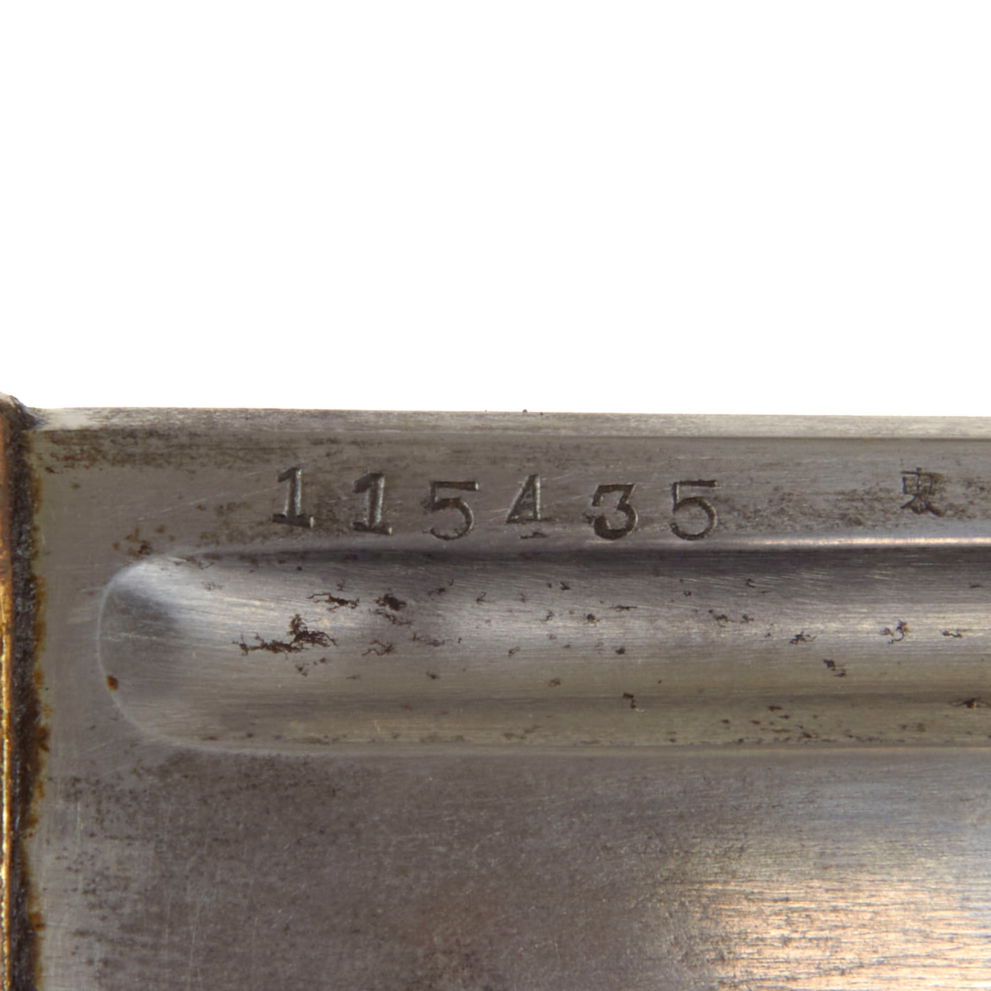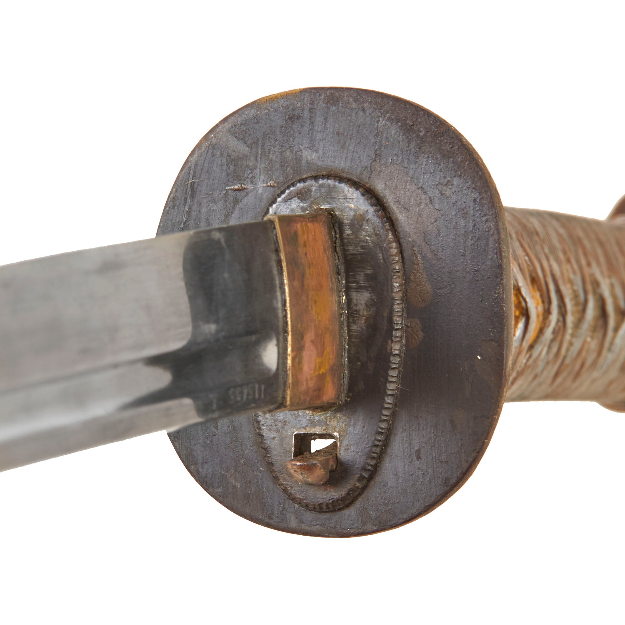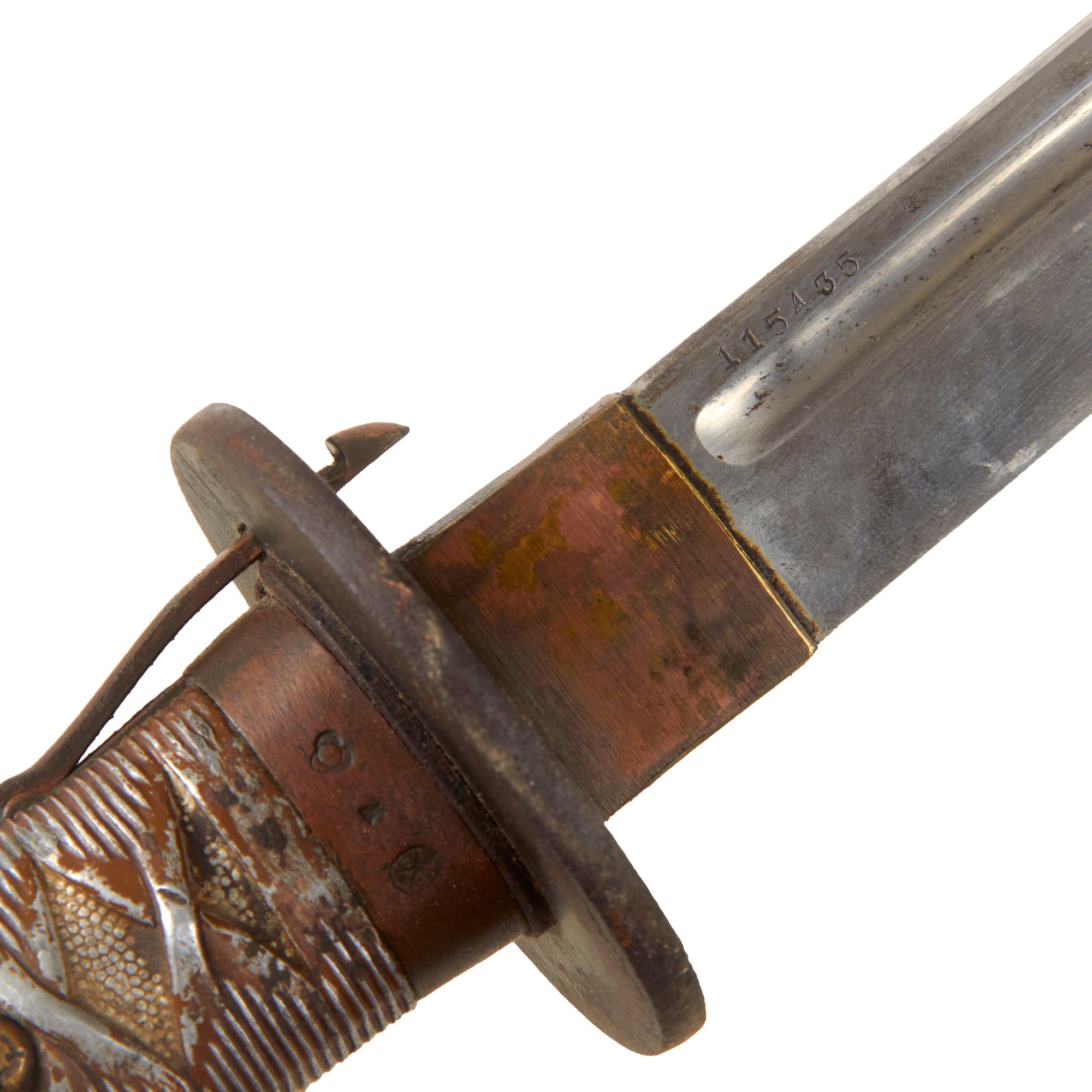 All NCO swords were numbered. This example has a matching serial number 115435 on both the blade and the throat of the scabbard. Most swords do not have matching numbers because somewhere along the life of the sword the scabbard was changed. Next to the serial on the blade is the 東 (To) marking for Tokyo Arsenal. The copper Fuchi (grip collar) of the sword is marked with information related to the swords production and inspection. While holding the sword hilt up, the first symbol on the left is the stylized sword Tsuba logo of Iijima Sword Factory, indicating that they produced the sword. To the right of the logo is 東 for inspection by Tokyo arsenal, and all the way to the right is the "Stacked Cannonball" logo of Kokura Arsenal, where the sword was put into arsenal for issue.